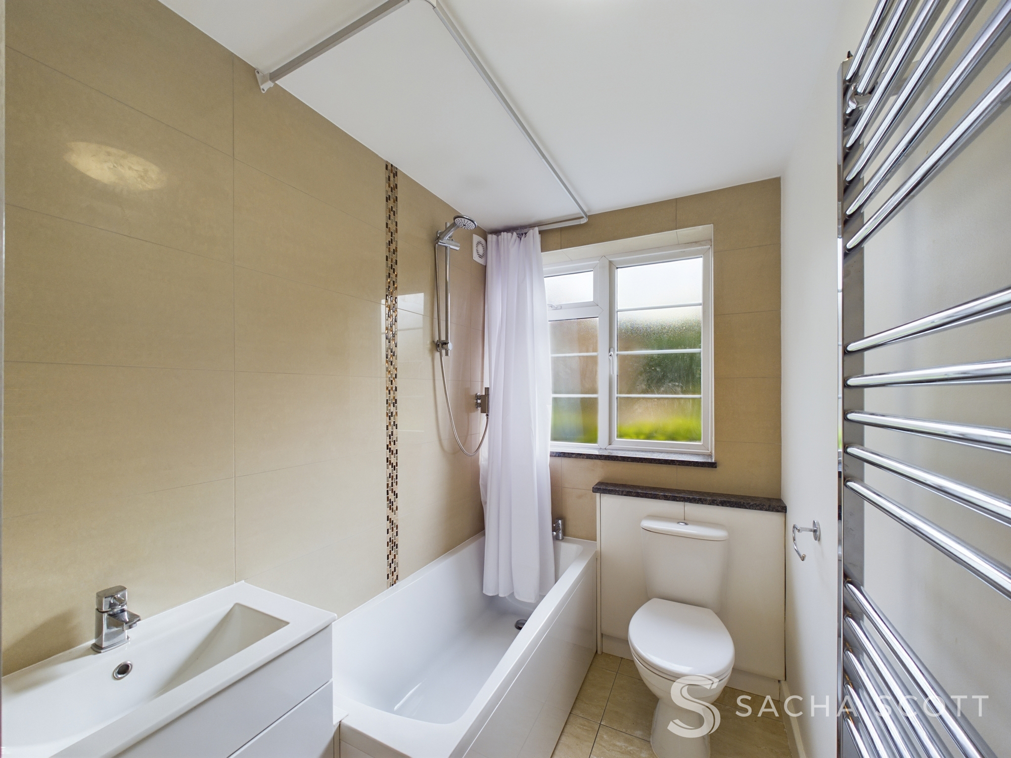 Partially tiled, the bathroom benefits from a shower over bath, modern sink, heated towel rail, WC and natural light and ventilation from an external window overlooking the communal gardens.