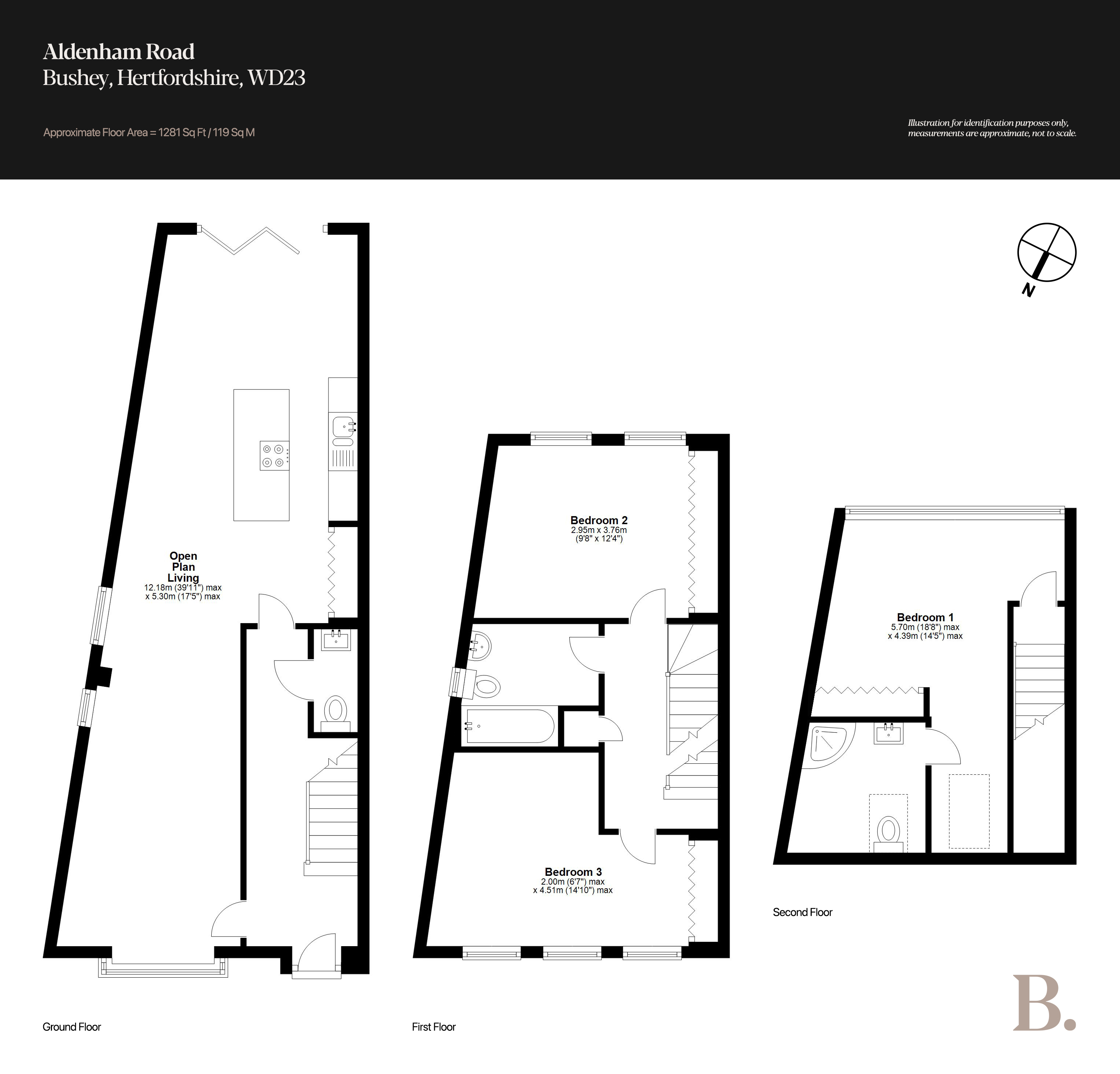 Occupying a commanding position on the ever-desirable Aldenham Road, this exceptional three-bedroom detached residence represents a truly outstanding example of contemporary suburban living, coming to market for only the second time since new, with the current owners having purchased directly from the developer in 2021. Spanning over 1,280 sq. ft. of impeccably designed accommodation, the home balances intelligent layout with refined style and a sense of enduring quality throughout. From first glance, its kerb appeal is undeniable: the buff brick façade is beautifully offset by a statement box-bay window and elegant sash detailing above, while the glazed transom bearing the house number adds a subtle modern flourish. Off-street parking enhances convenience, a prized feature in this coveted setting just 0.4 miles from Bushey Station, offering swift direct connections to Central London in a little over 15 minutes.