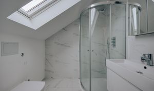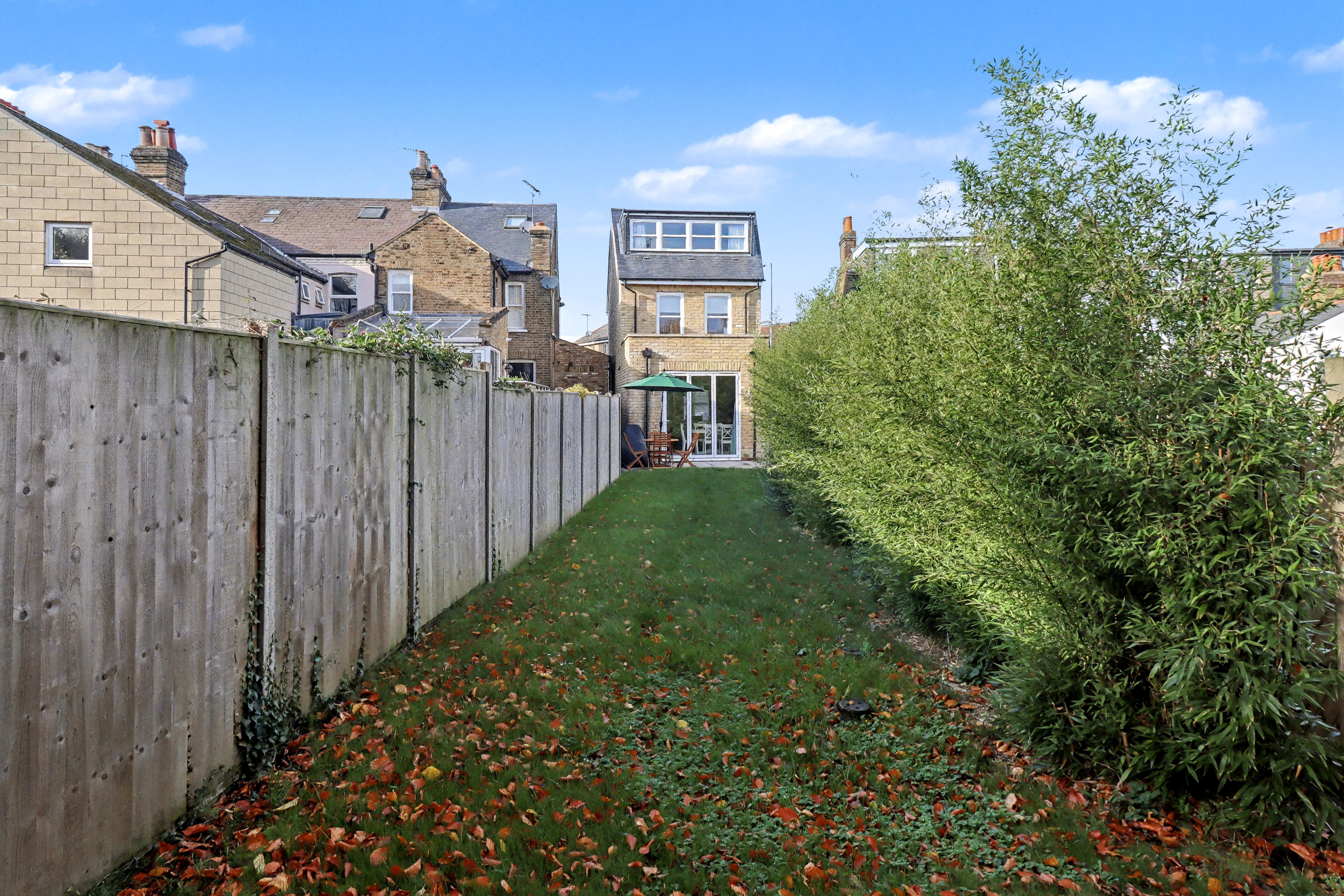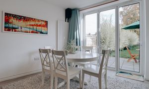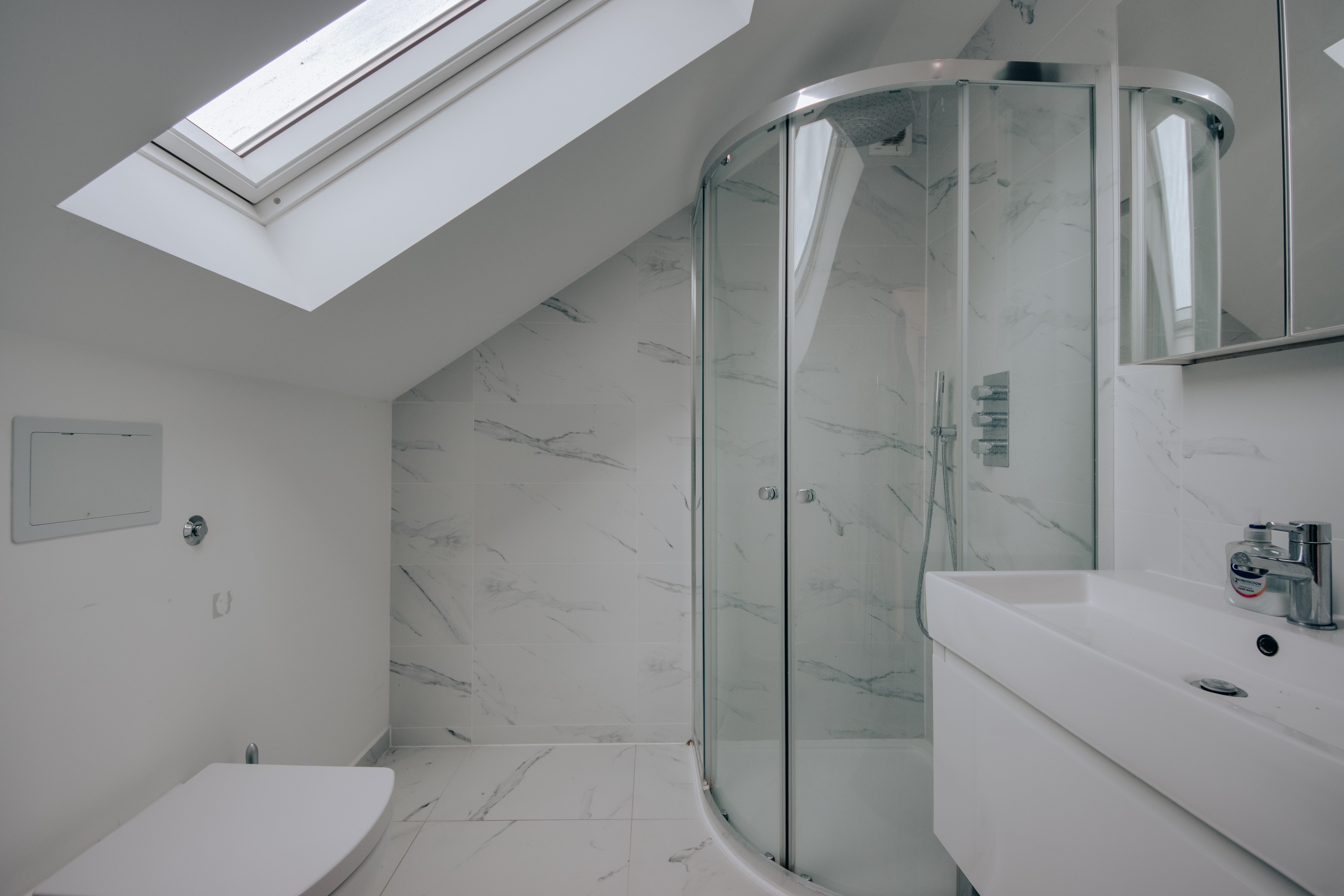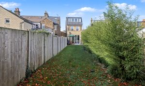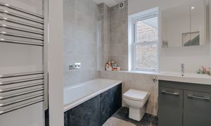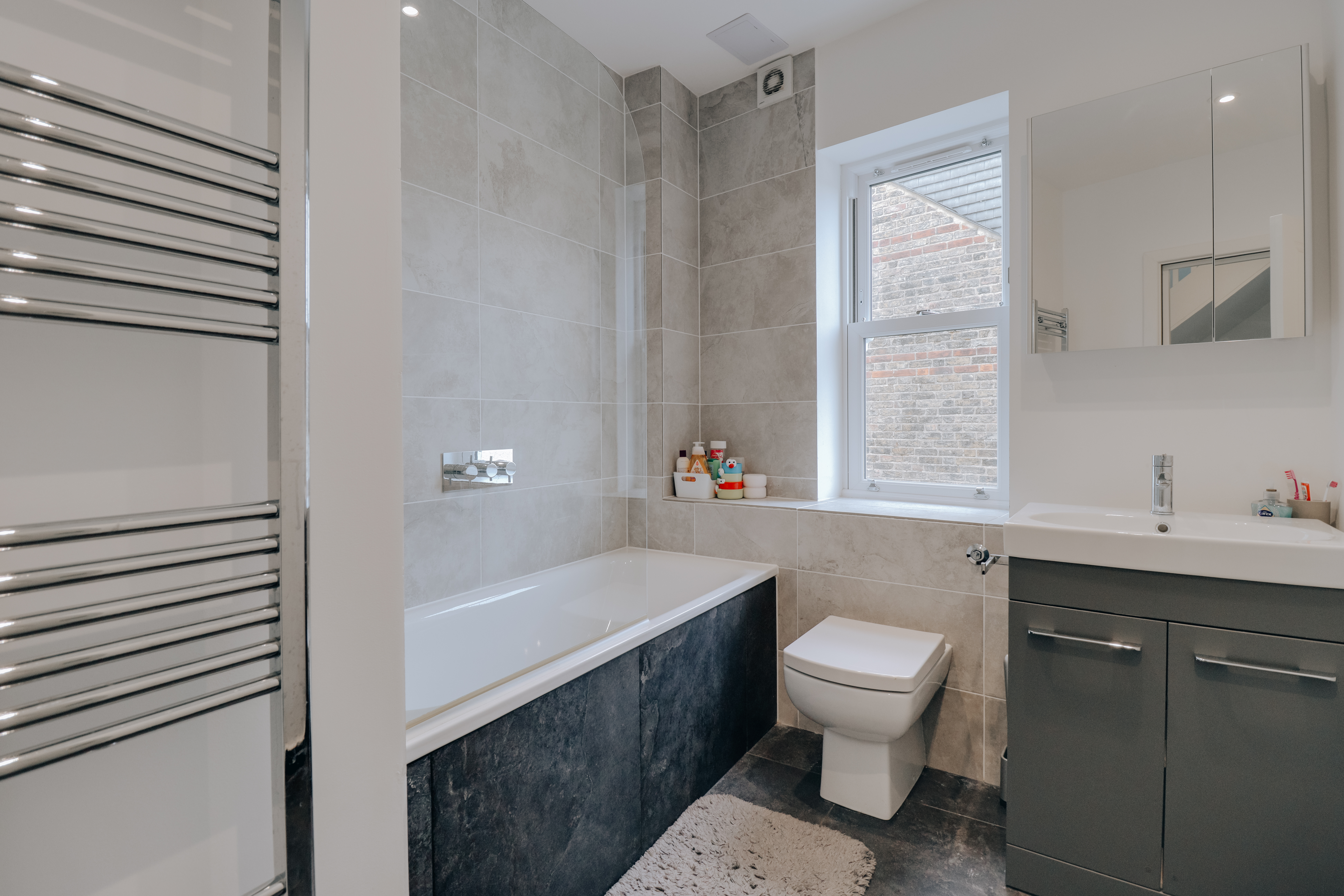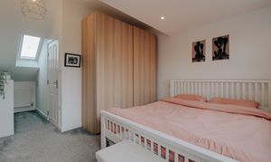 Upstairs, three well-proportioned bedrooms continue the home’s refined design story, each echoing the same sense of calm sophistication found throughout. The principal suite (18’8” x 14’5”) occupies the top floor, a private and tranquil sanctuary featuring bespoke fitted wardrobes and a spacious en suite bathroom, complete with Velux window that bathes the space in natural light. Two additional bedrooms are equally impressive, offering flexibility for family, guests, or a stylish home office. The main family bathroom exudes hotel-like comfort, featuring a deep bathtub with integrated shower and high-quality contemporary fittings that harmonise with the home’s cohesive aesthetic.