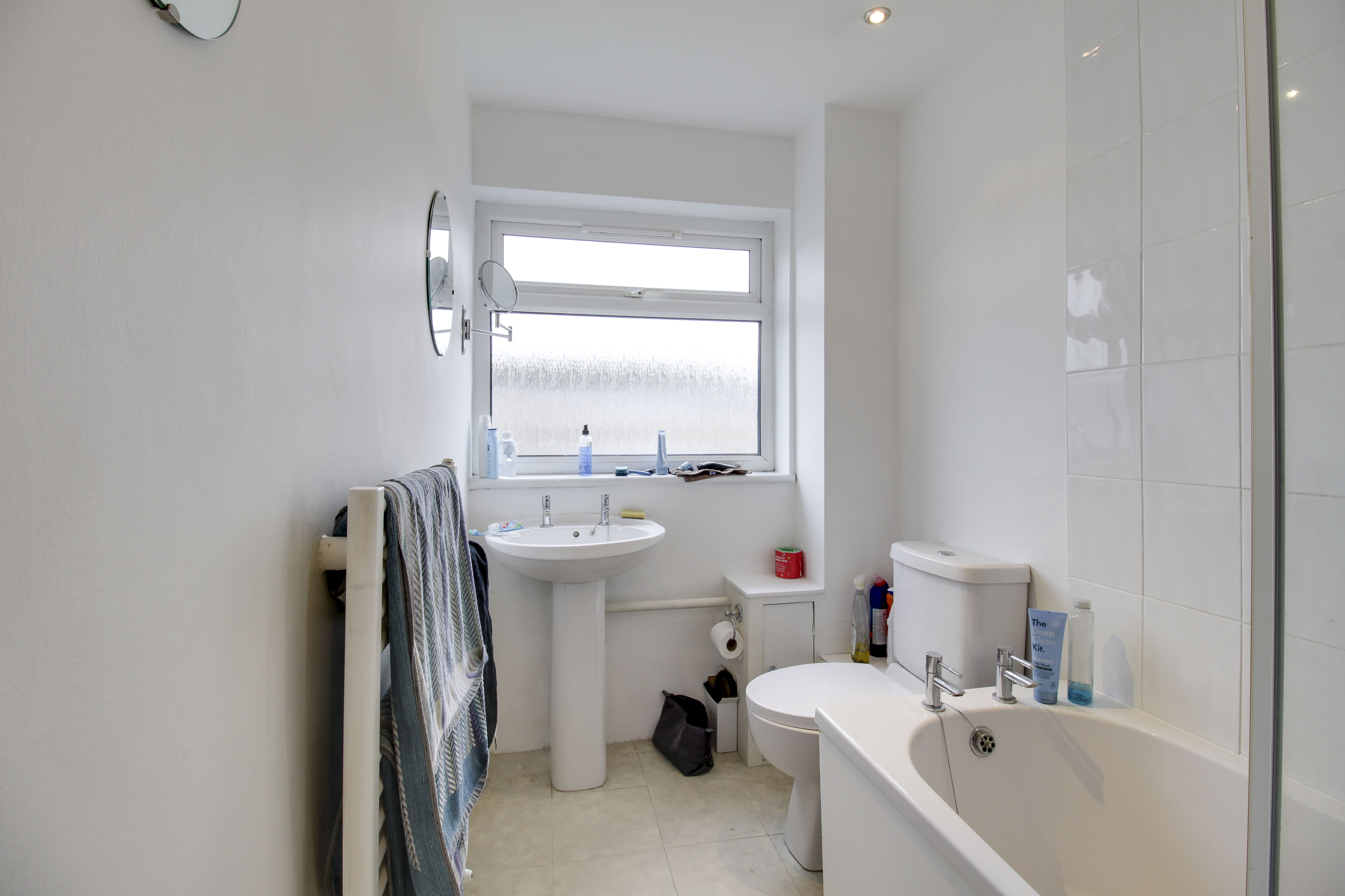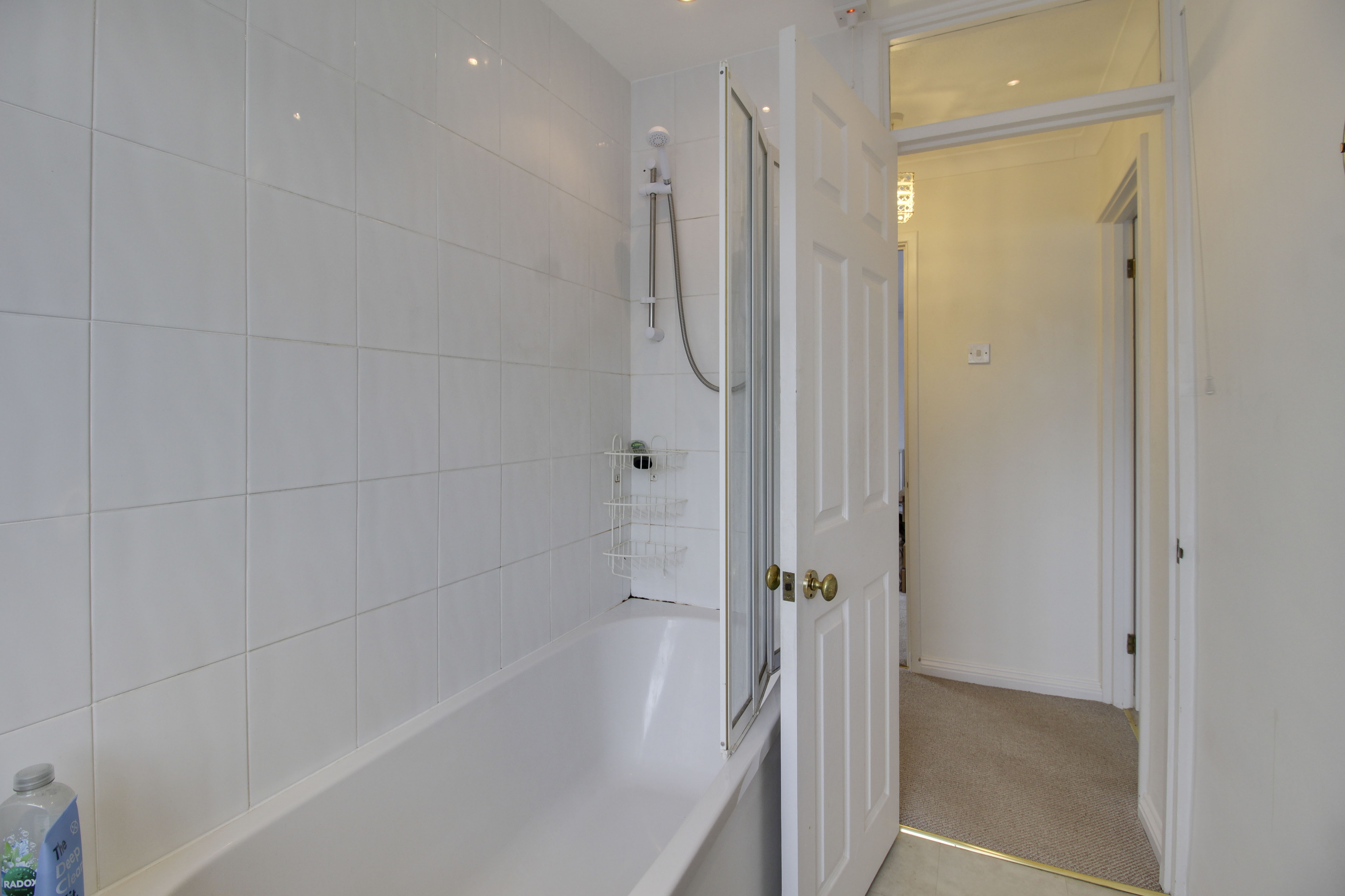 Three piece white suite comprising low level WC, pedestal wash hand basin and panelled bath with shower over. Glass screen and tiled splash backs. Radiator. UPVC window to front.