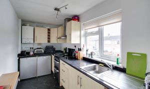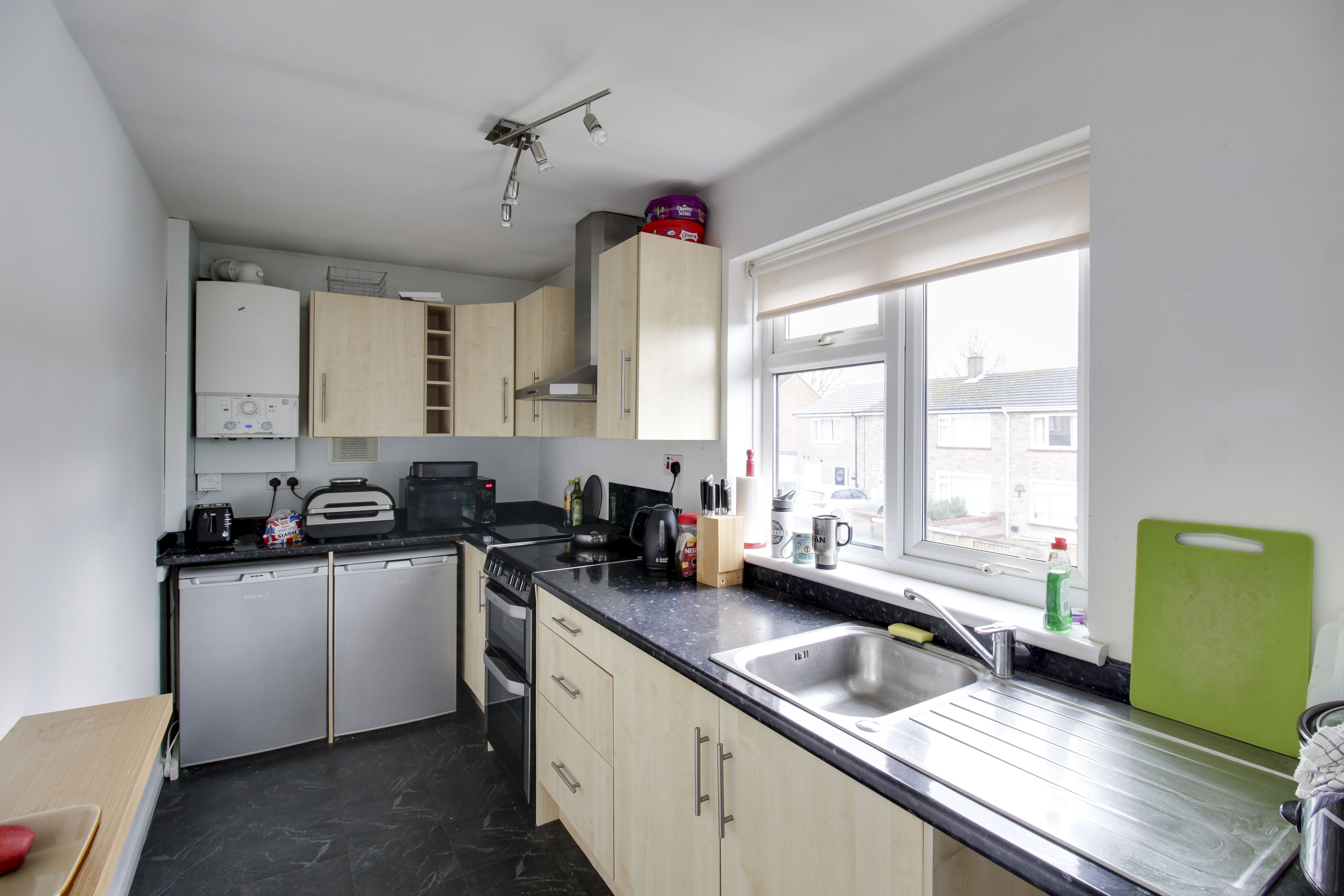Fitted kitchen comprising work surfaces with complementary drawers and cupboards under. Wall mounted cupboards. Single bowl sink with mixer tap and tiled splash backs. Freestanding electric oven with extractor over. Plumbing for washing machine. Radiator. UPVC window to front. Wall mounted gas combi boiler.
