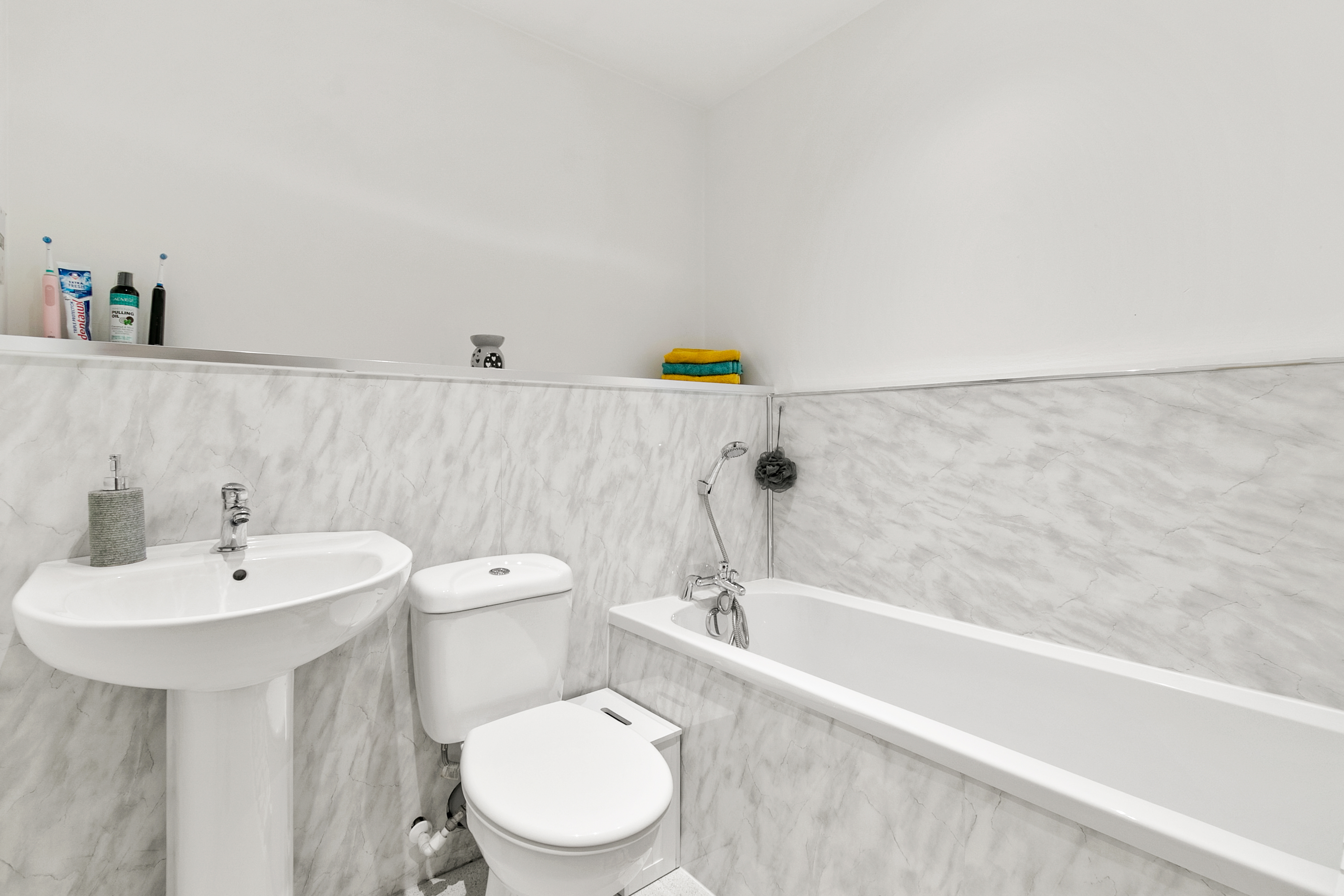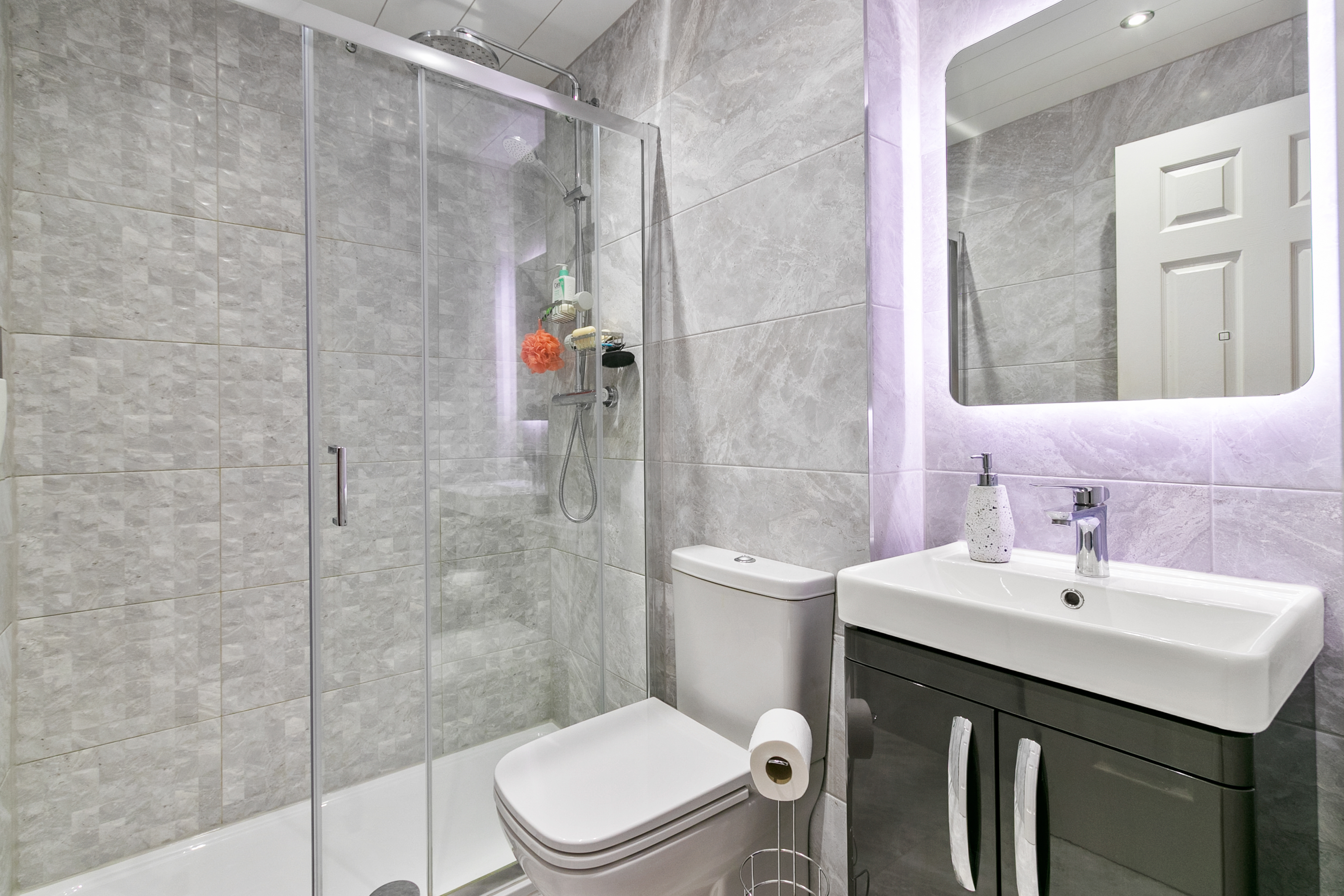 Both bedrooms are generously proportioned doubles, each with fitted wardrobes. The main bedroom enjoys a stylish upgraded en suite with vanity storage, while the internal bathroom is equally impressive—featuring a large layout, white three-piece suite, and wet-wall panelling.