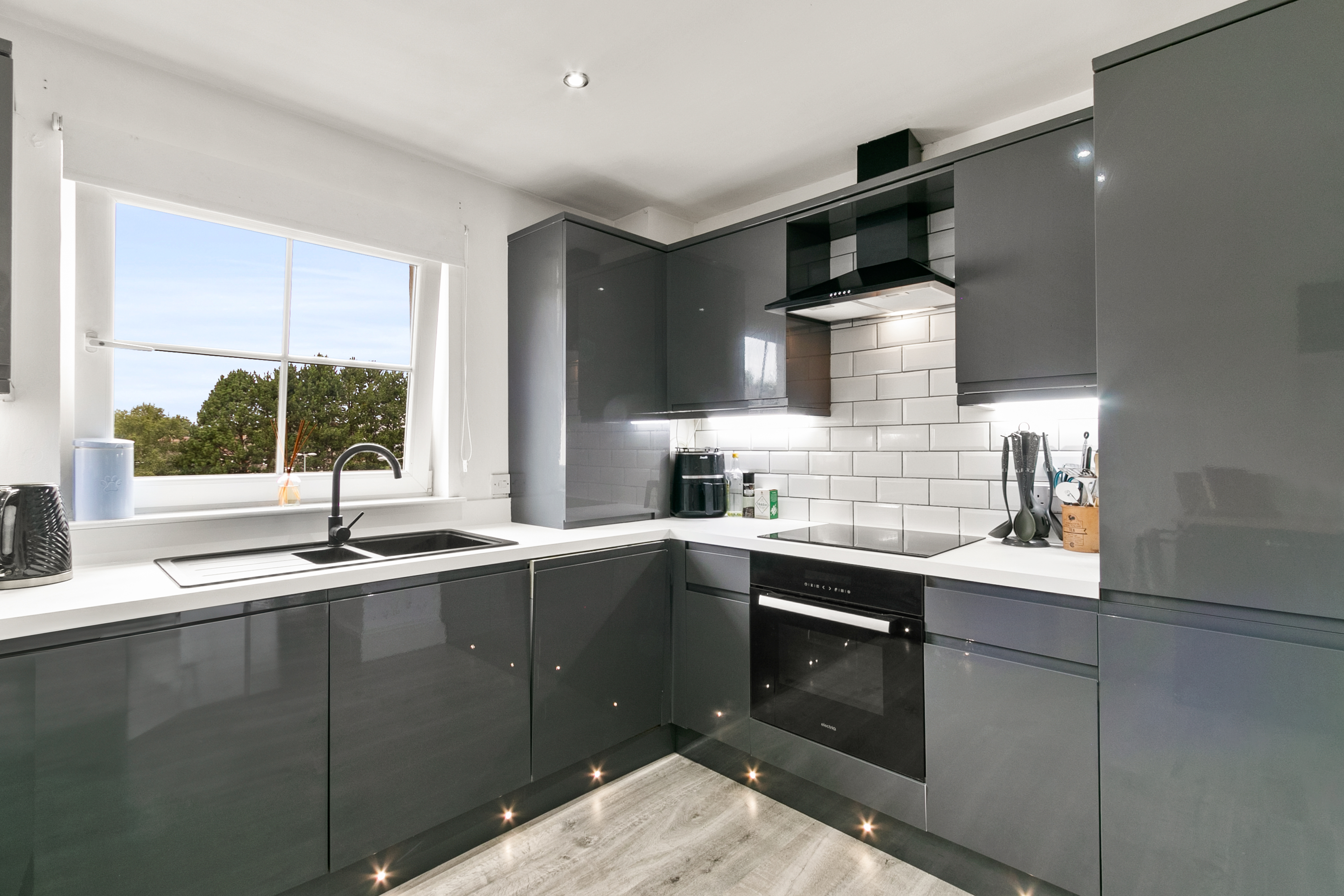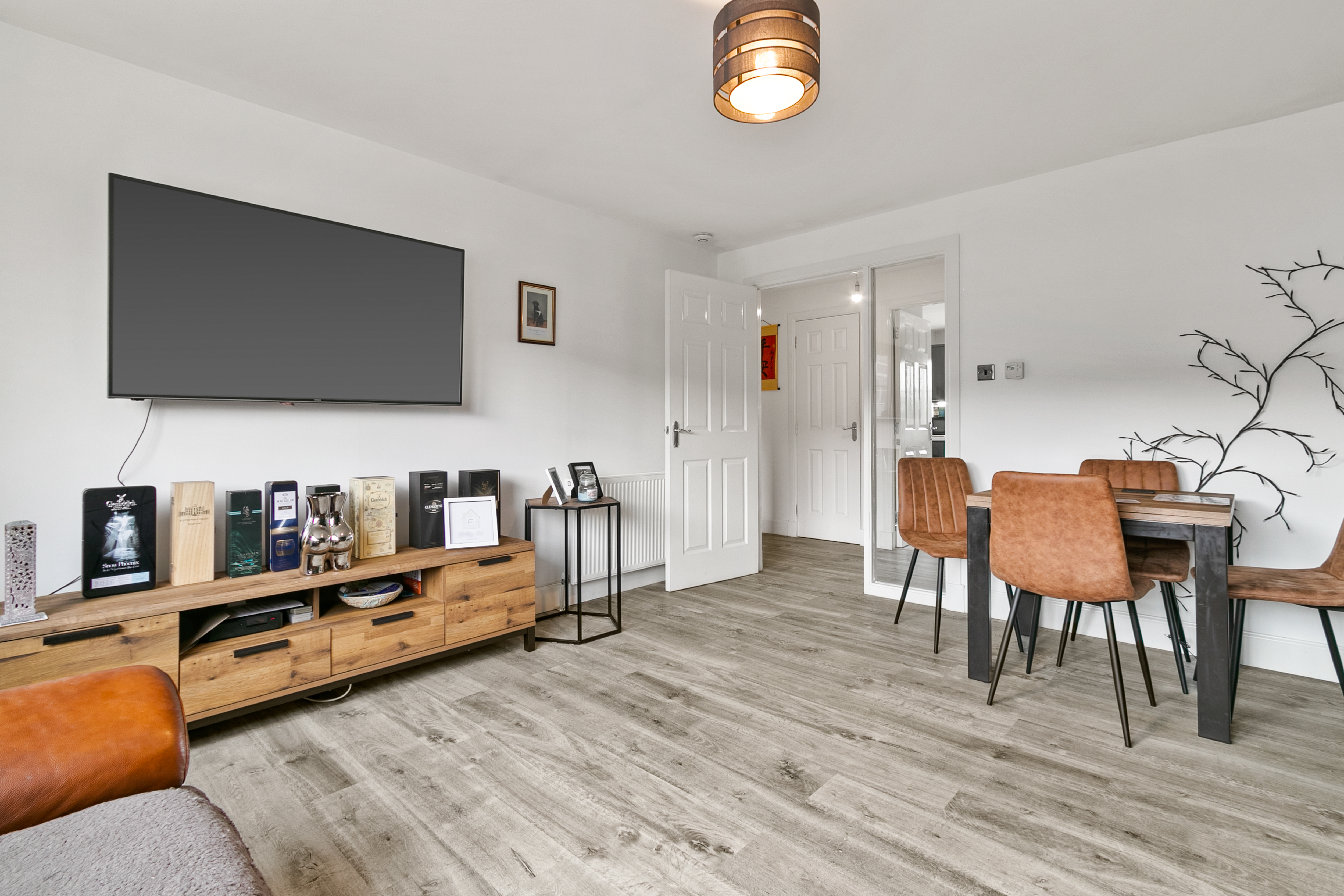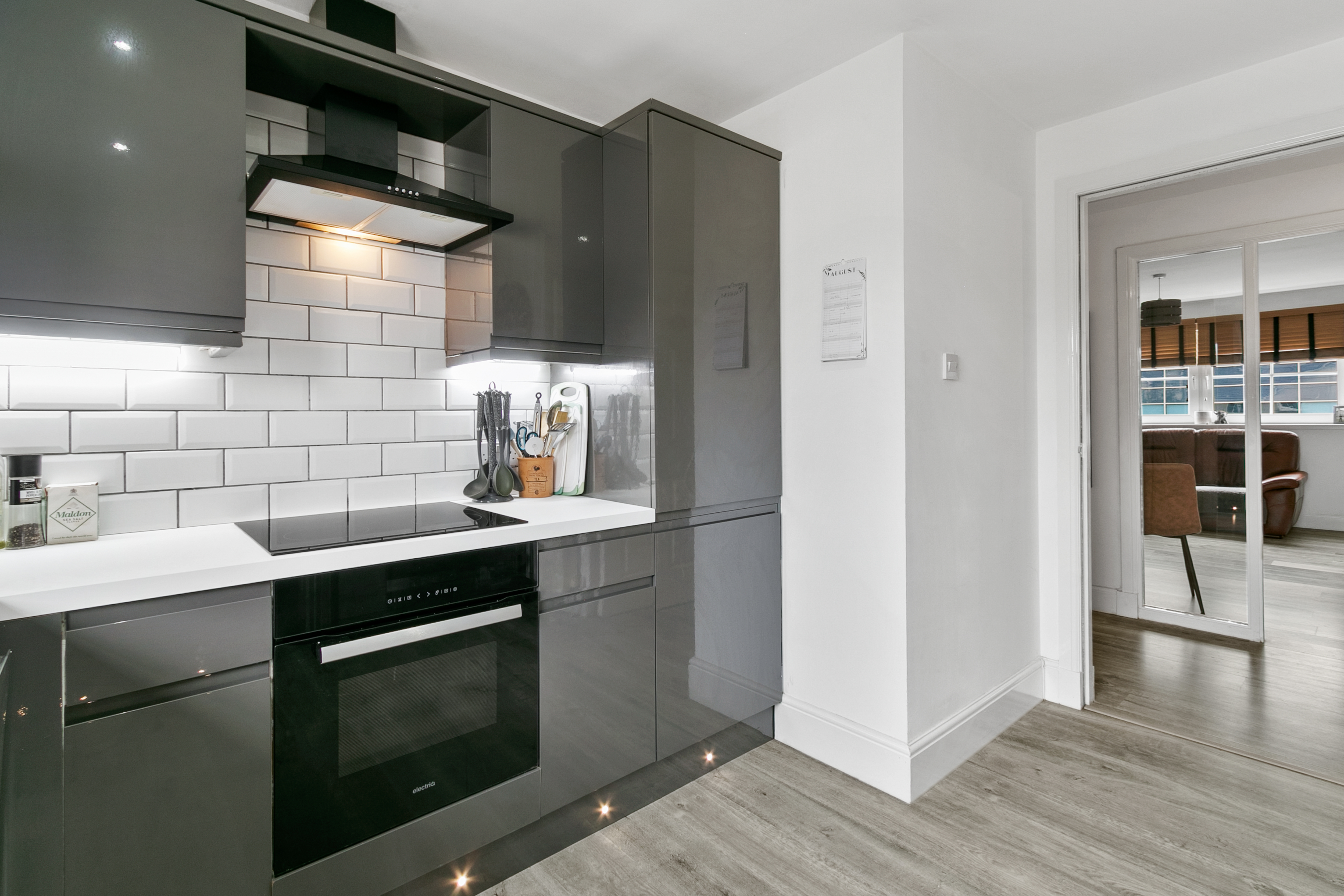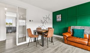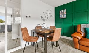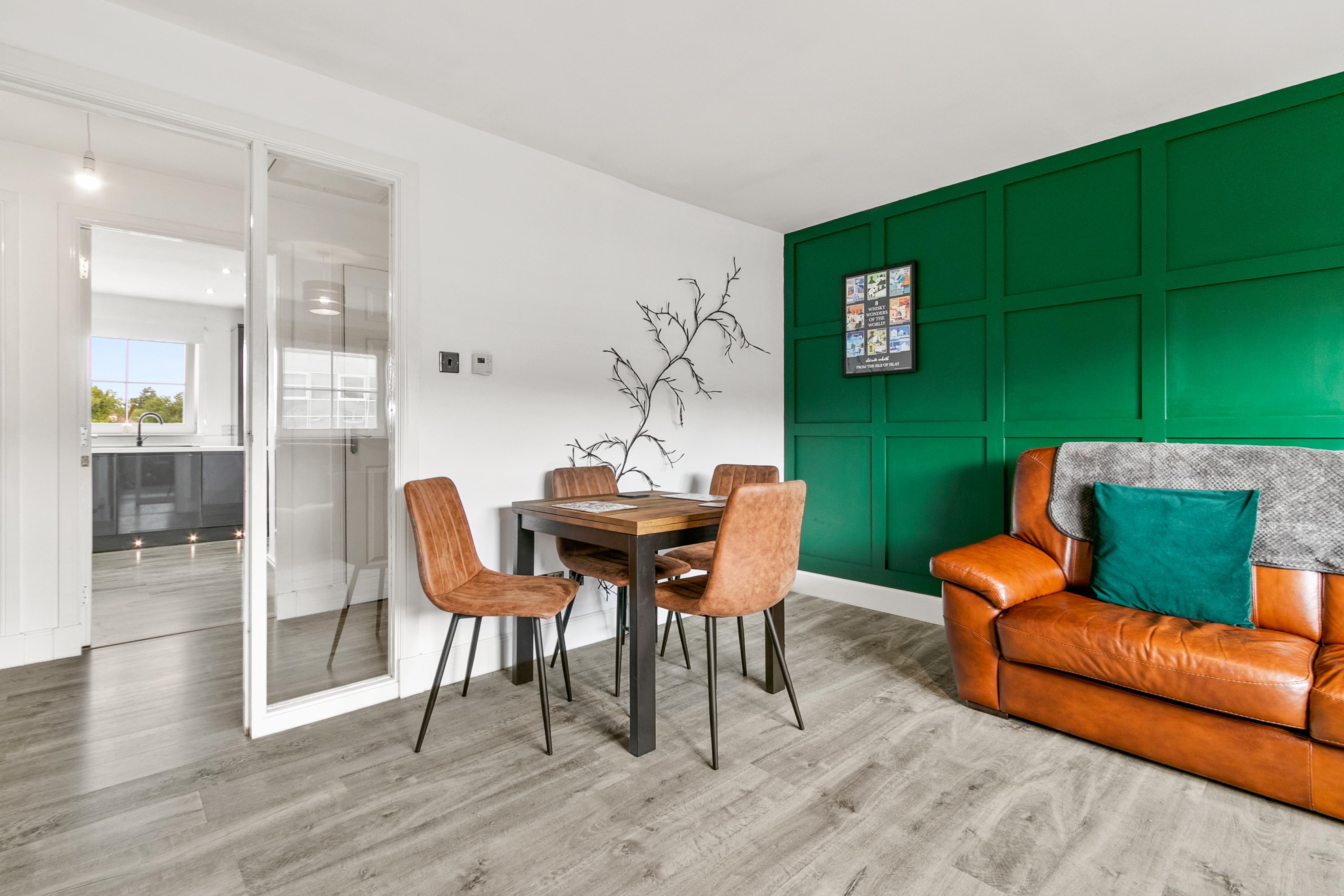 The bright and spacious lounge features an elegant panelled feature wall and easily accommodates a dining area. The standout modern refitted kitchen is beautifully appointed with a range of wall and floor-mounted units, pelmet lighting, quality worktops, matching splashbacks, and integrated appliances.