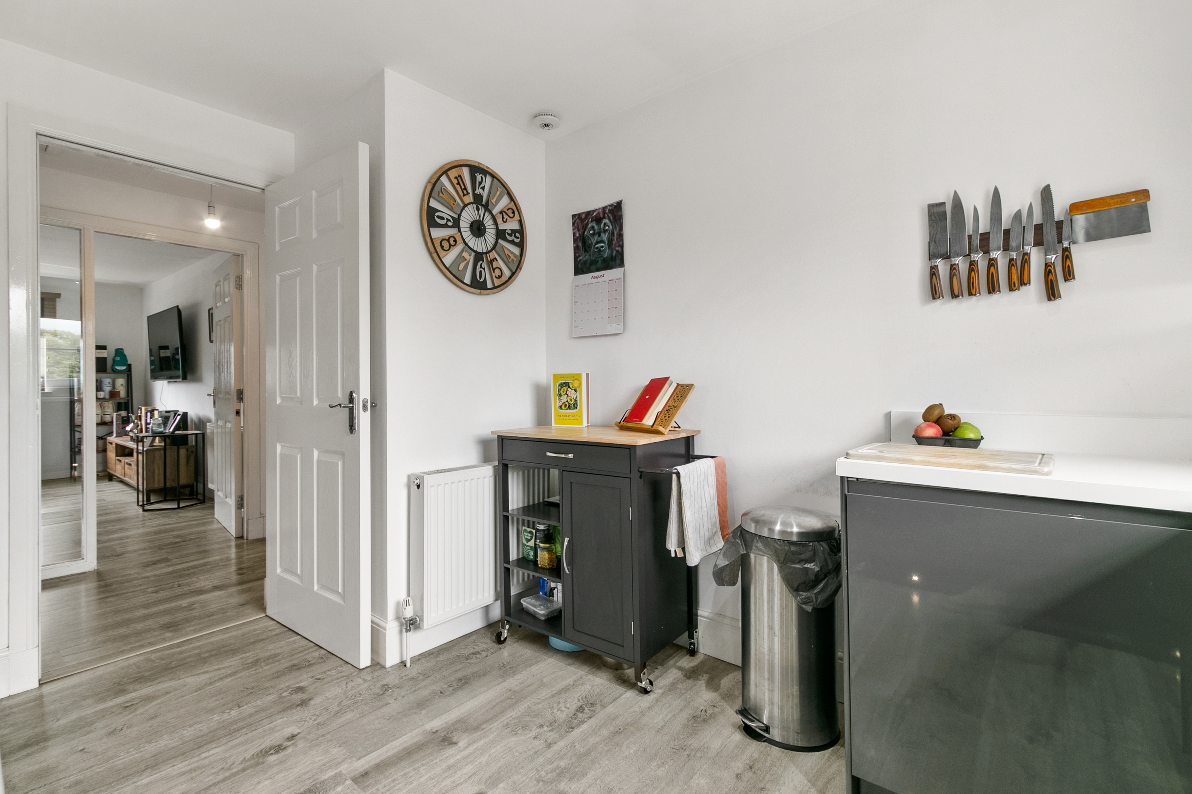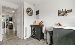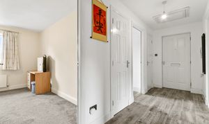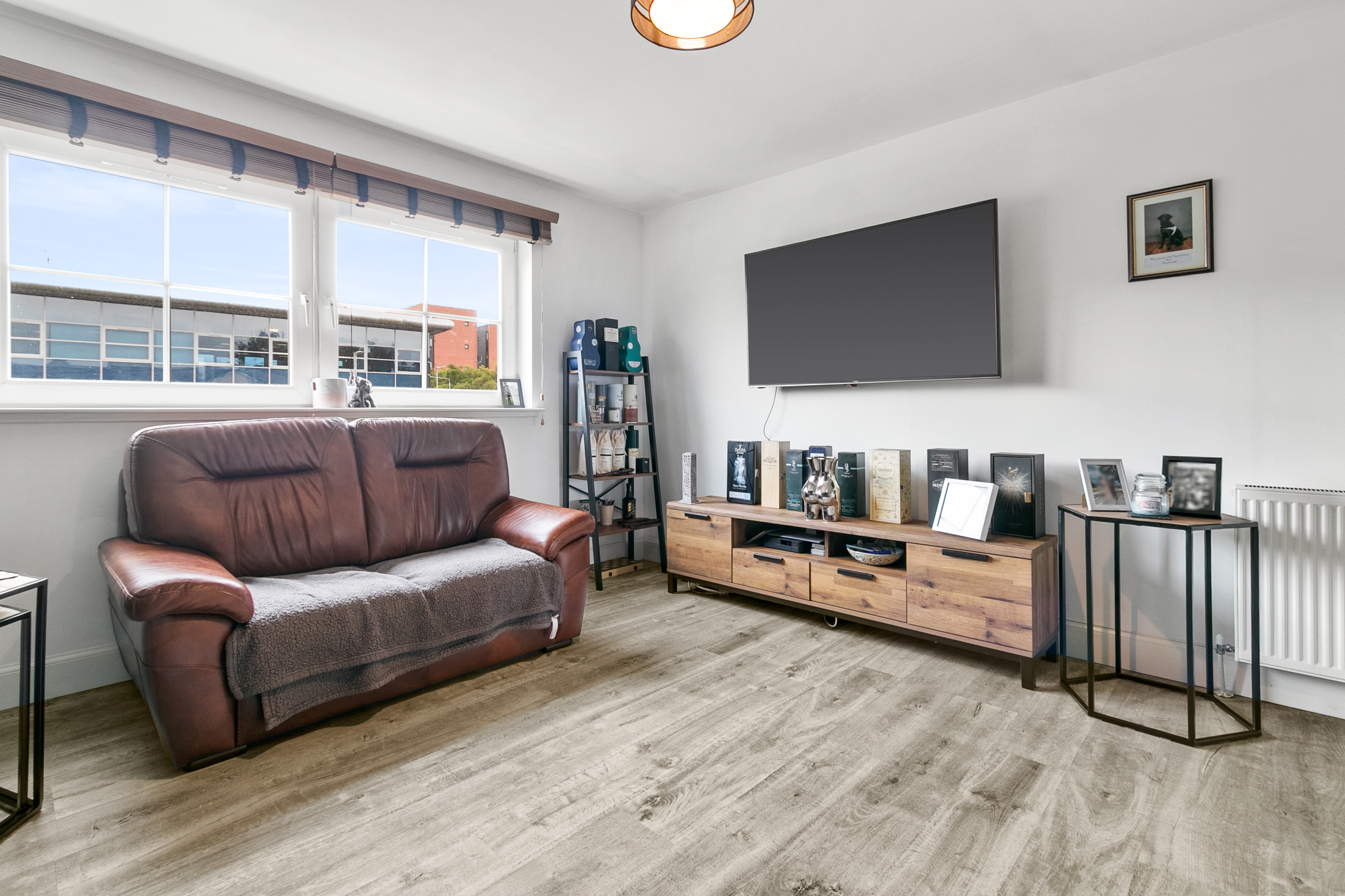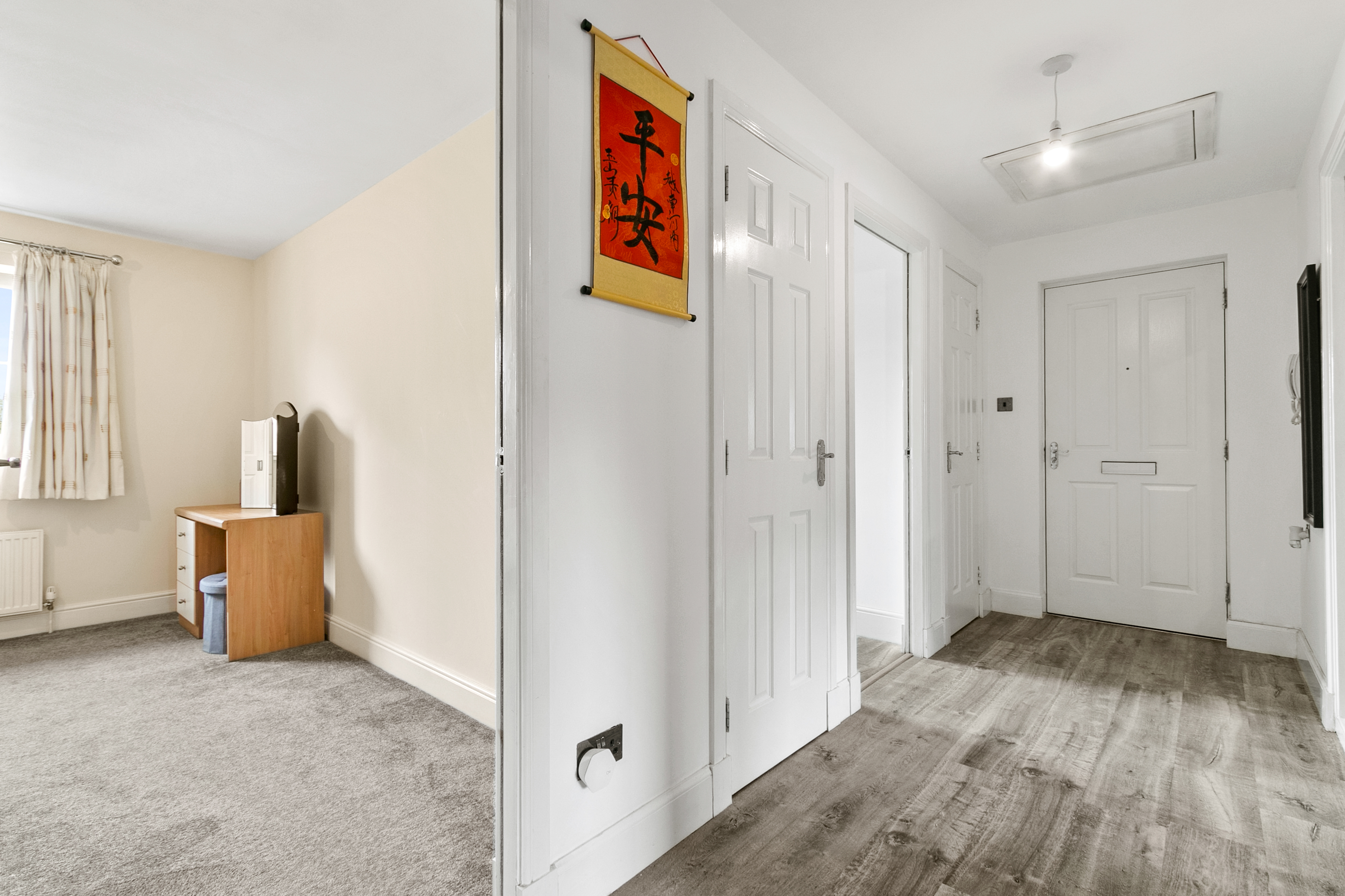A secure entry system provides access to a well-maintained communal hallway, with stairs leading to the upper landing. The welcoming reception hall gives access to all rooms and boasts fresh, neutral décor complemented by contemporary grey laminate flooring.