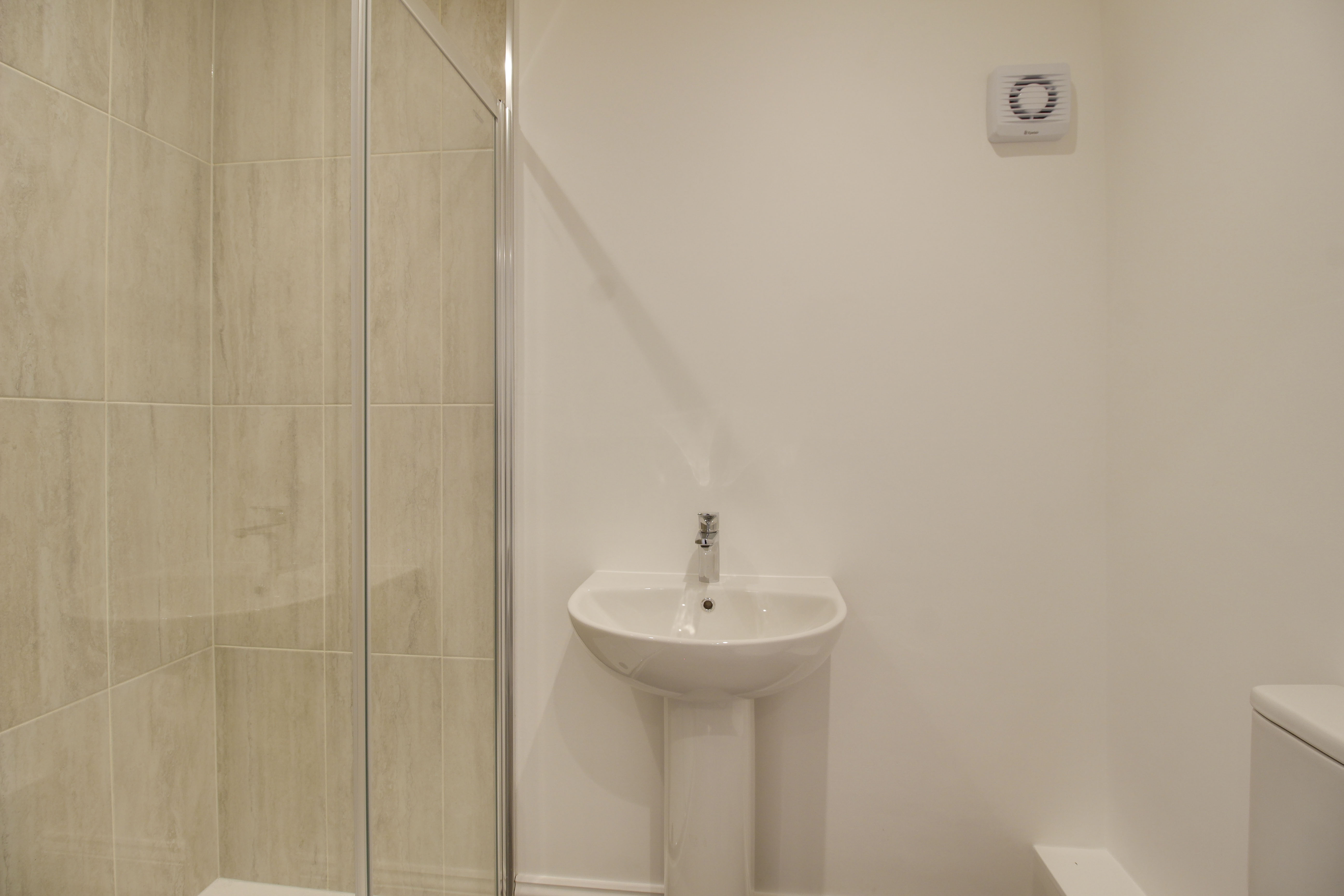 Three piece suite comprising low level WC, pedestal wash hand basin and fitted shower unit with glass screen and splash backs. Extractor fan.