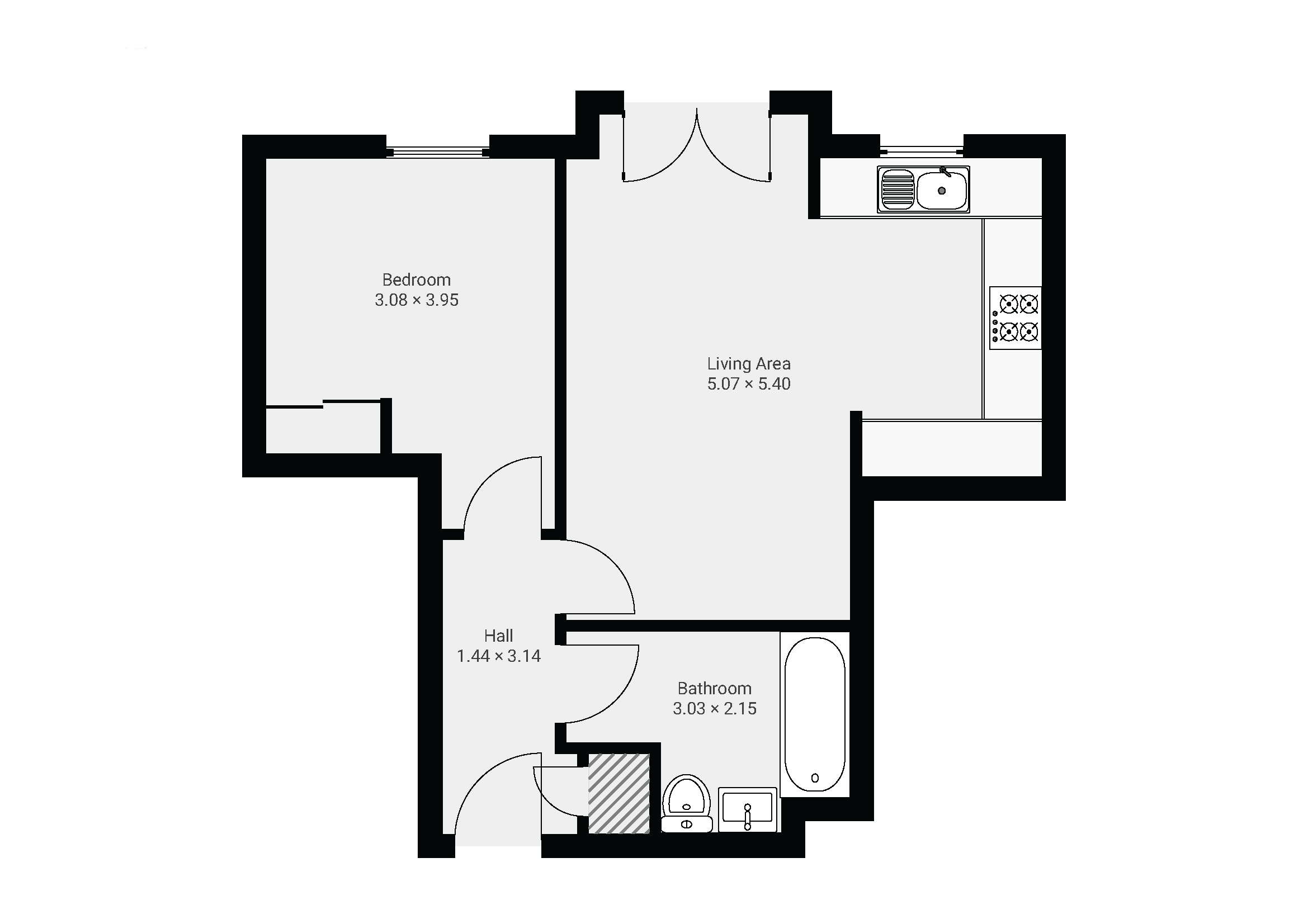 The accommodation is entered via a central hallway, leading into a bright and spacious open plan lounge and modern kitchen. The sleek kitchen features contemporary fittings and offers a practical layout ideal for everyday living. There is a double sized bedroom with fitted mirrored wardrobes providing excellent storage. The bathroom is finished to a high standard and benefits from a shower over the bath and is fully tiled throughout. Further storage is provided by a large cupboard in the hallway.