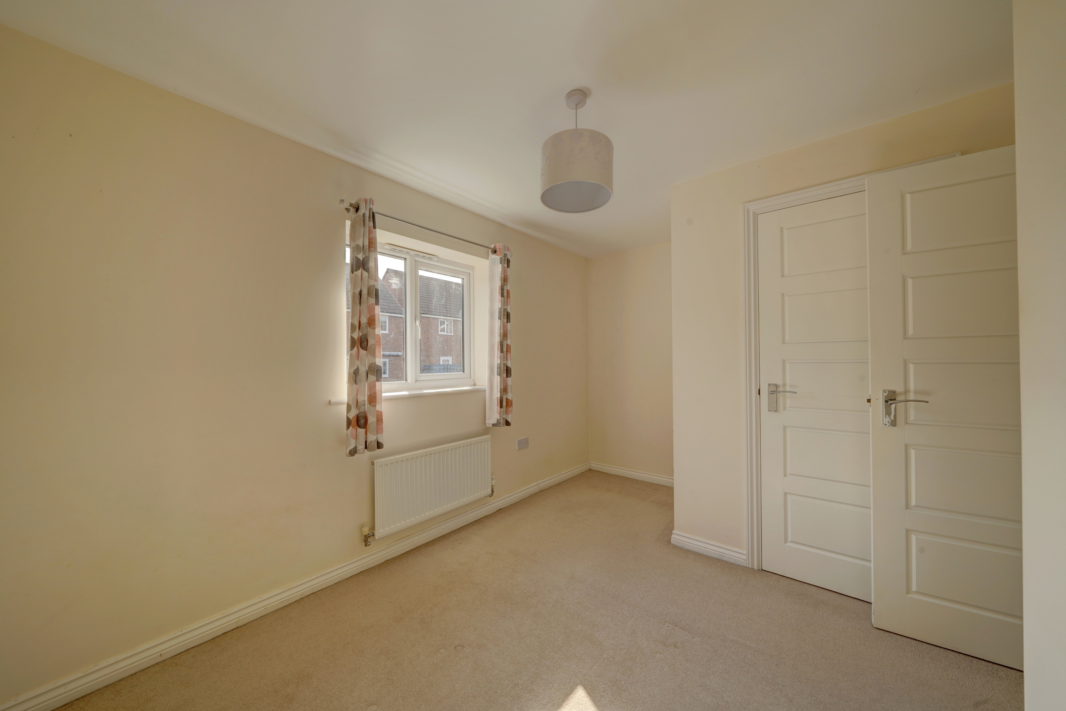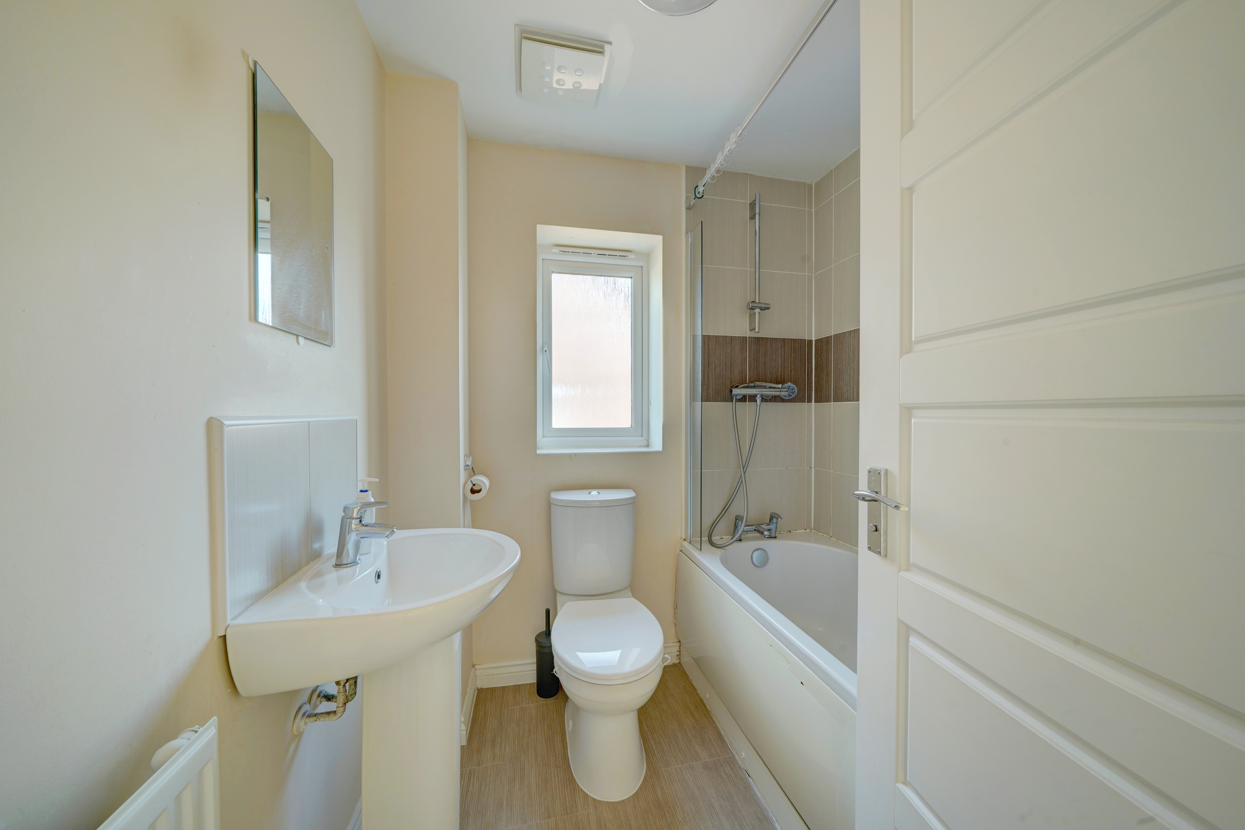 On the ground floor, the property comprises an entrance hallway with downstairs WC and a storage cupboard housing the boiler to your right, and the kitchen to your left overlooking the front of the house. The kitchen is modern and fitted with wall and base units, an electric oven, gas hob, extractor fan, and space for a fridge/freezer and washing machine. The living room is a good size and bright, with patio doors leading out onto the garden. The stairs lead from the living room to the first floor.