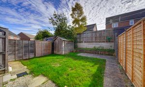 Externally, the property has a driveway to the side providing parking for two cars, with gated access to the private rear garden featuring a patio, raised flower beds, lawn, and shed.