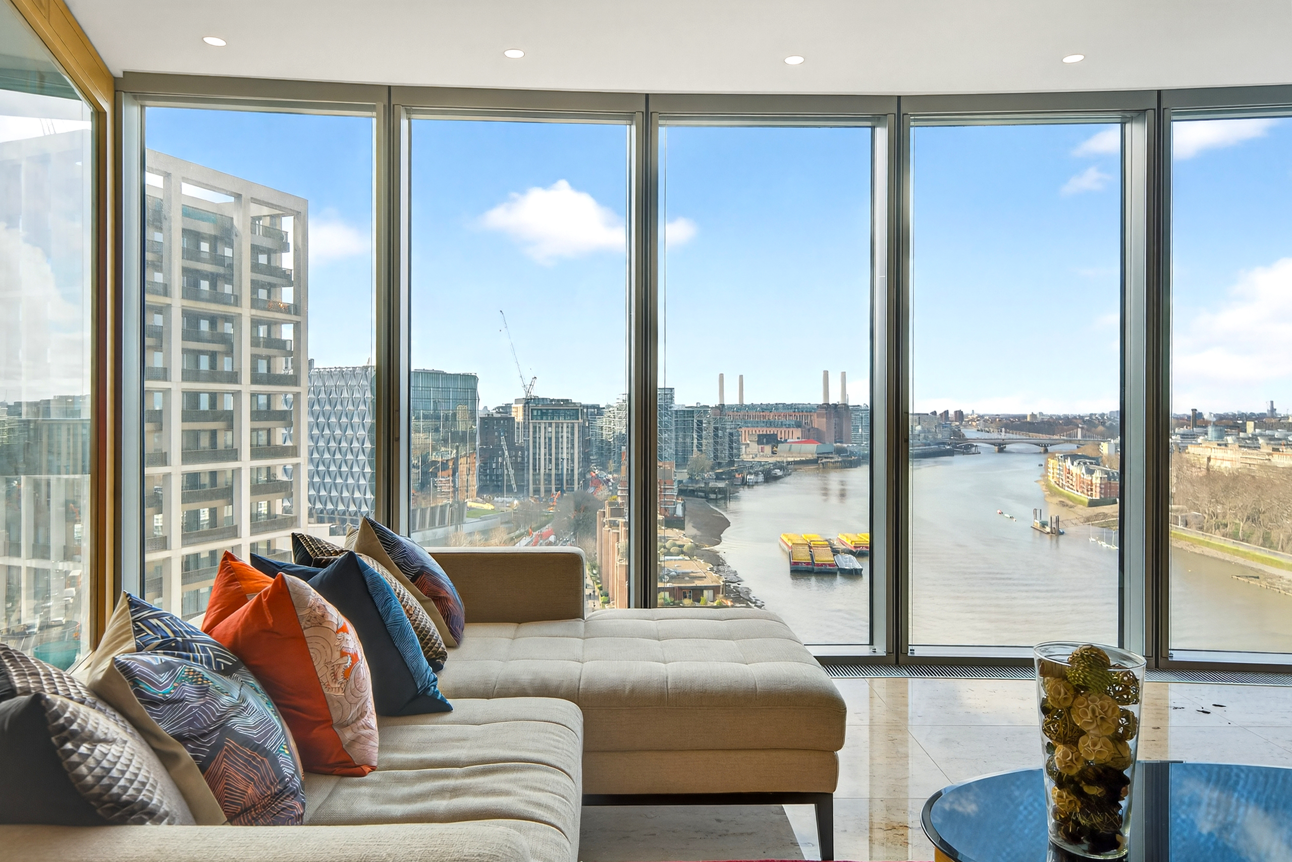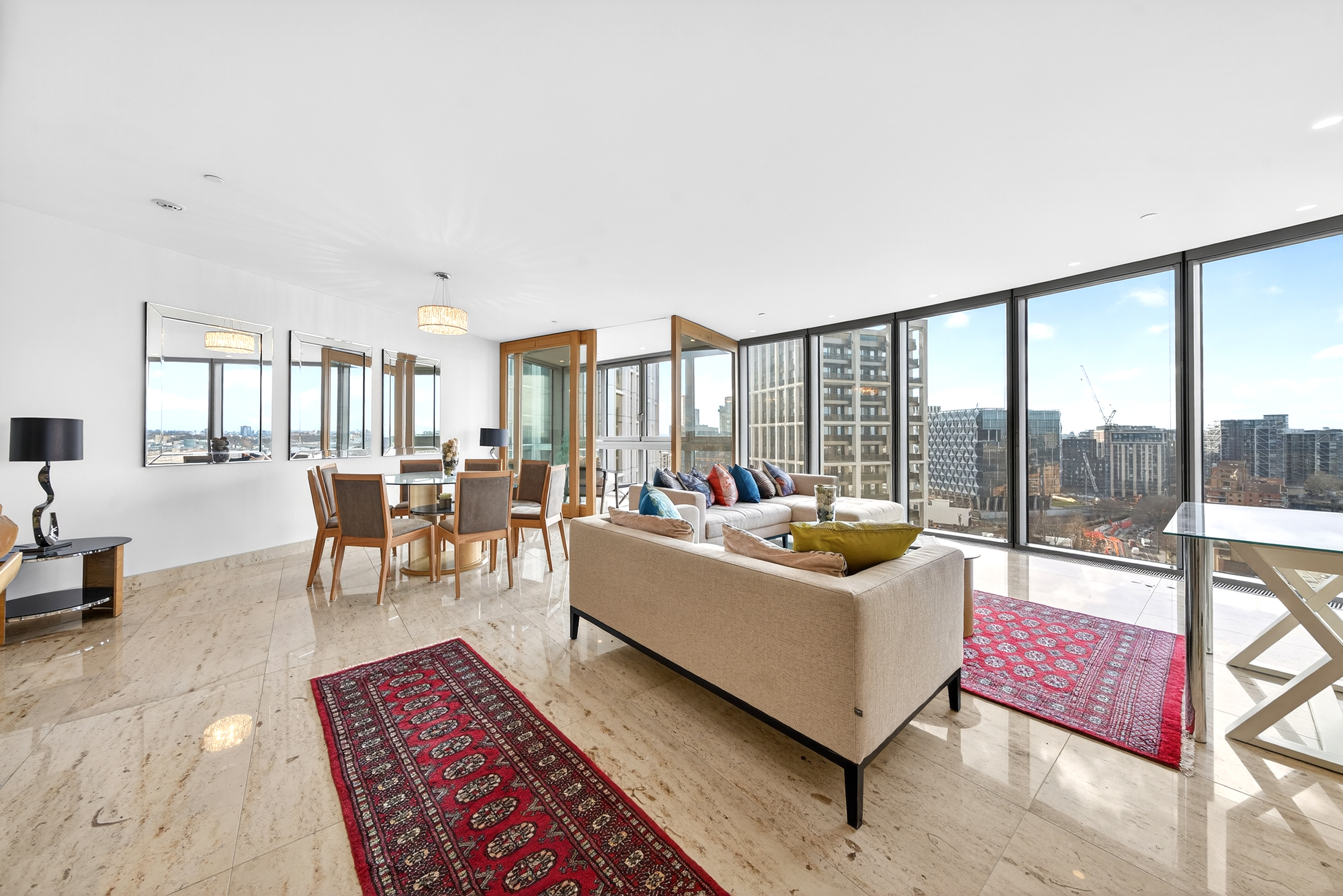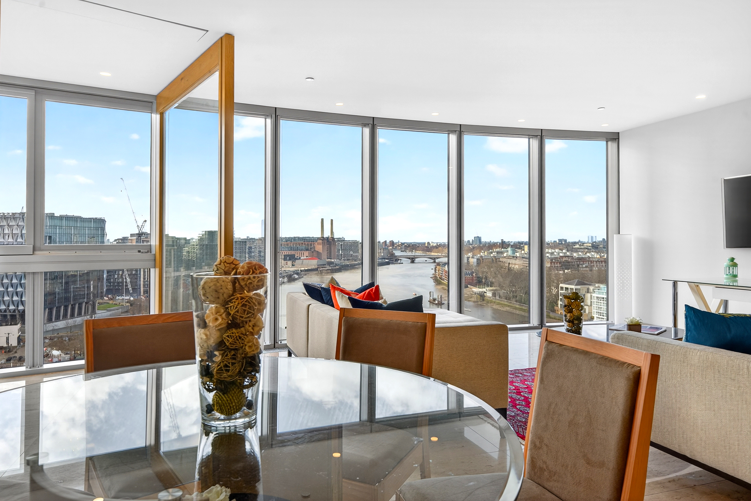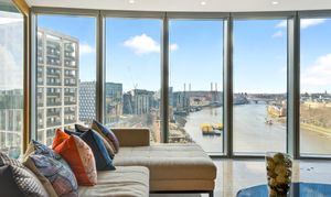 This immaculate 14th floor apartment sits in a prime position of the building offering stunning river and Battersea Power Station views. The open plan living/ dining/ kitchen area has floor to ceiling windows allowing for an abundance of natural light. The state of the art kitchen is fully fitted with Miele appliances, a coffee machine and wine fridge. Off the living area is a winter garden and the property has 2 large double bedrooms and 2 bathrooms.