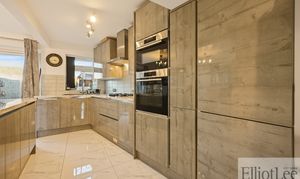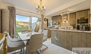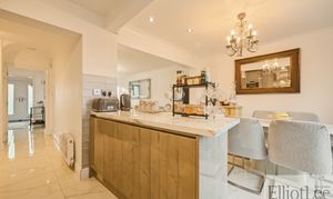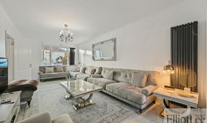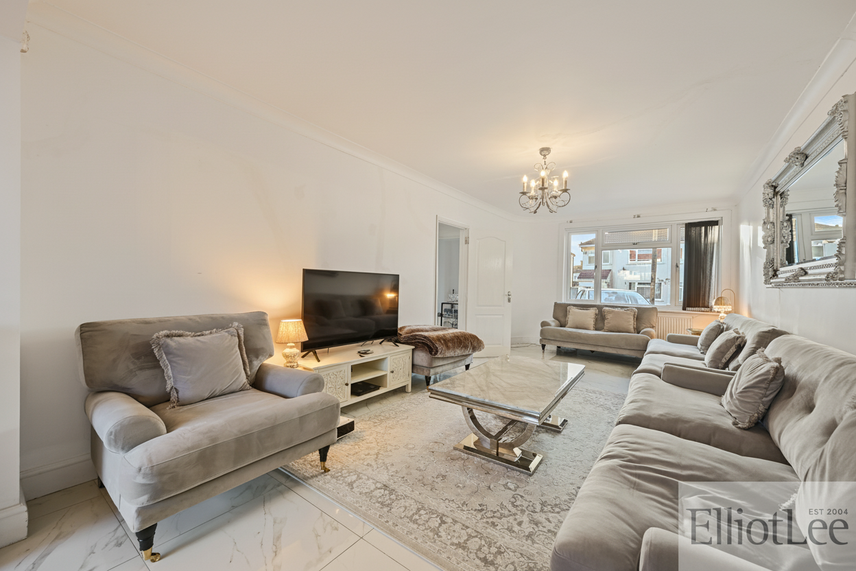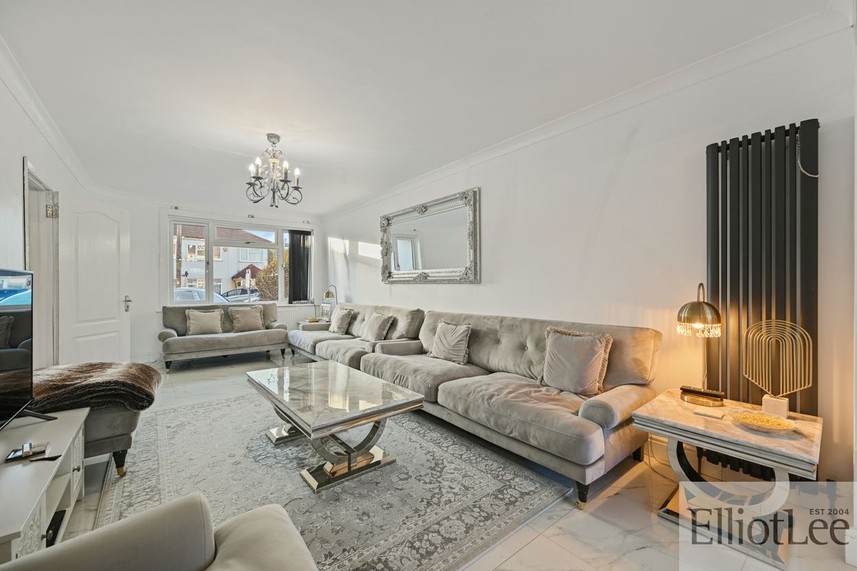 This impressive four-bedroom, two-bathroom semi-detached house offers a harmonious blend of contemporary style and versatile living space, perfectly suited for modern family life. The property features two spacious reception rooms, each designed with comfort and elegance in mind. The main living area boasts plush seating, a stunning chandelier, and a large mirror that amplifies the sense of space and light. The second reception area seamlessly connects to a sophisticated open-plan kitchen and dining space, creating an inviting environment for both relaxation and entertaining. The modern kitchen is equipped with sleek units, integrated appliances (including a double oven and gas cooktop), a breakfast bar, and stylish marble-effect countertops. High-quality flooring, chandelier lighting, and large windows throughout the home ensure every room is filled with natural light and a sense of warmth.