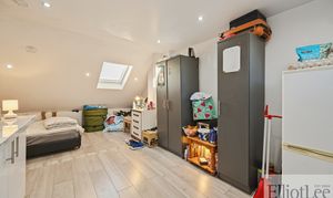 Both bathrooms are finished to a high standard, featuring modern walk-in showers, contemporary fixtures, and elegant tiled walls. The bedrooms are generously proportioned, each benefiting from large windows, wood or hardwood flooring, and built-in mirrored wardrobes that enhance both storage and light. The attic room, illuminated by a Velux window and recessed lighting, offers a versatile space ideal for a home office, studio, or additional bedroom. Adding to the practicality, the property includes off-road parking, a modern front door, and a garage for secure storage or parking needs.