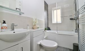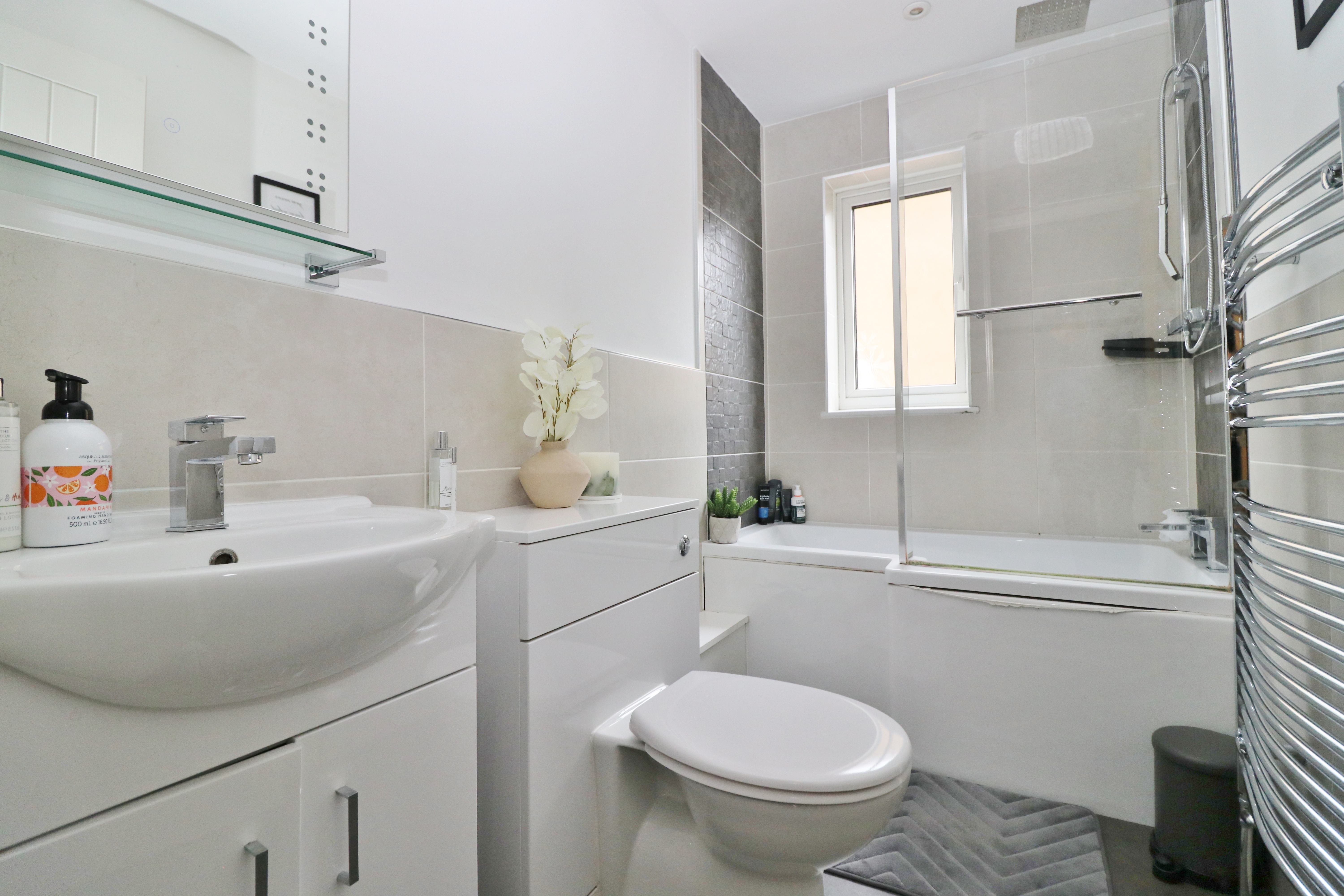 The modern bathroom comprises a P-shaped bath with shower and screen over, vanity wash hand basin, WC, heated towel rail and a window to the side.