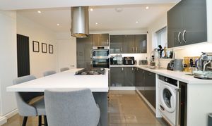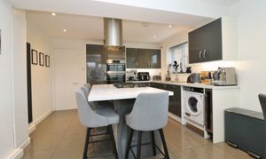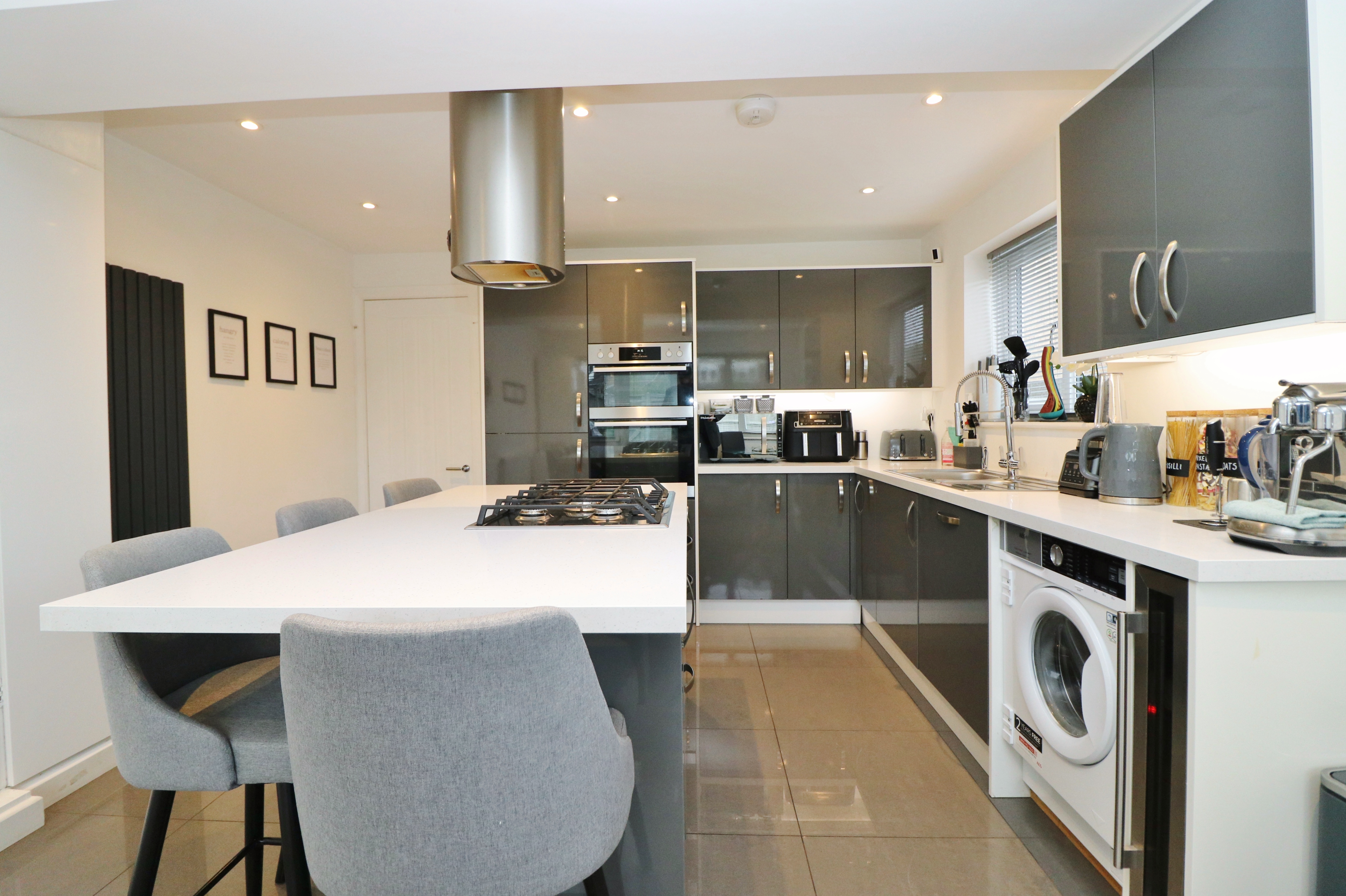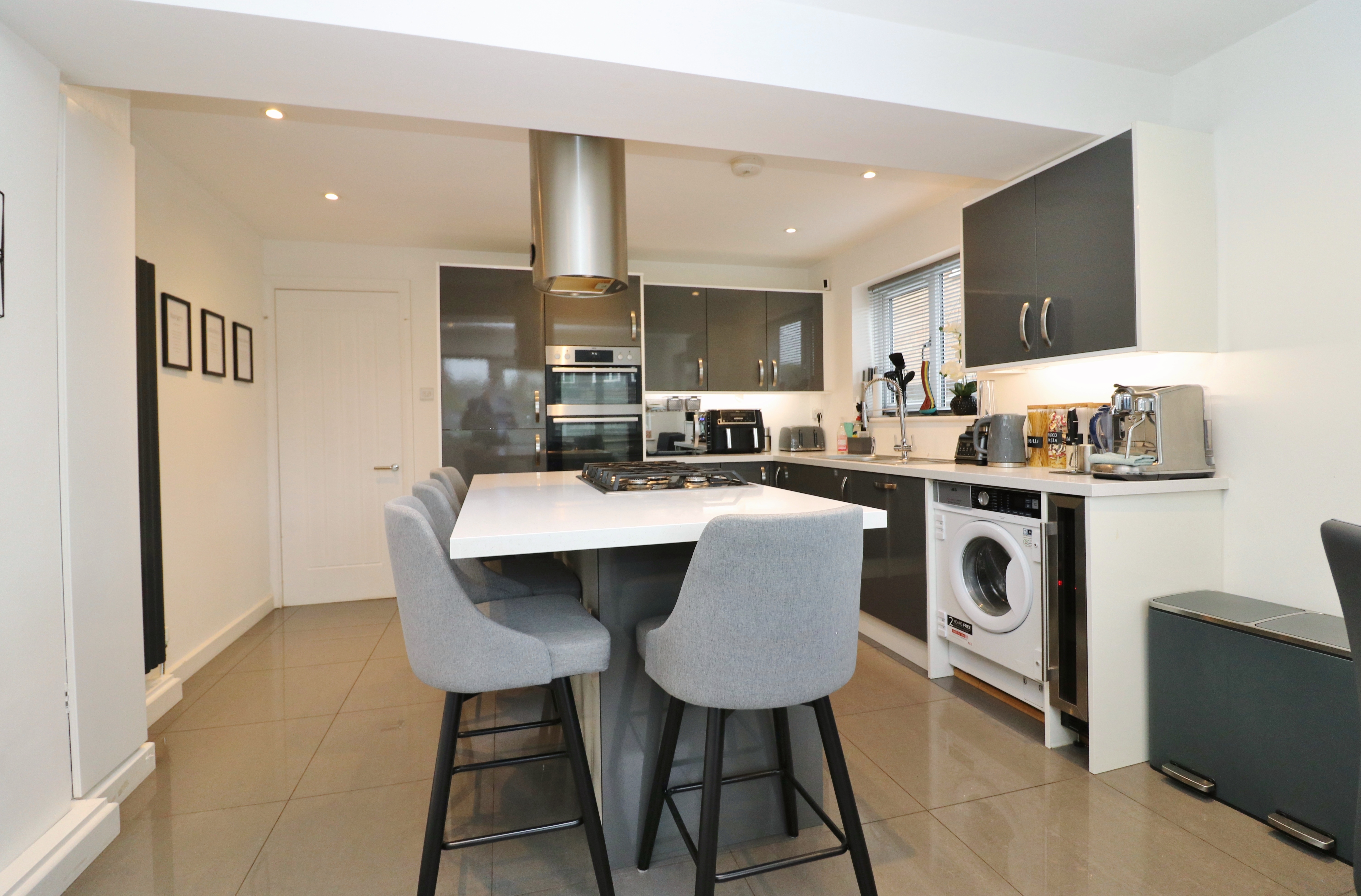 The modern kitchen/diner has been extended to the rear and has been fitted with a range of wall and base units with a central island incorporating a breakfast bar and gas hob with extractor over. There is also a built-in double oven, an integrated fridge/freezer and dishwasher, as well as appliance space for a washing machine. There is plenty of natural light with windows to the side and rear and a door from the dining area opening out to the garden.