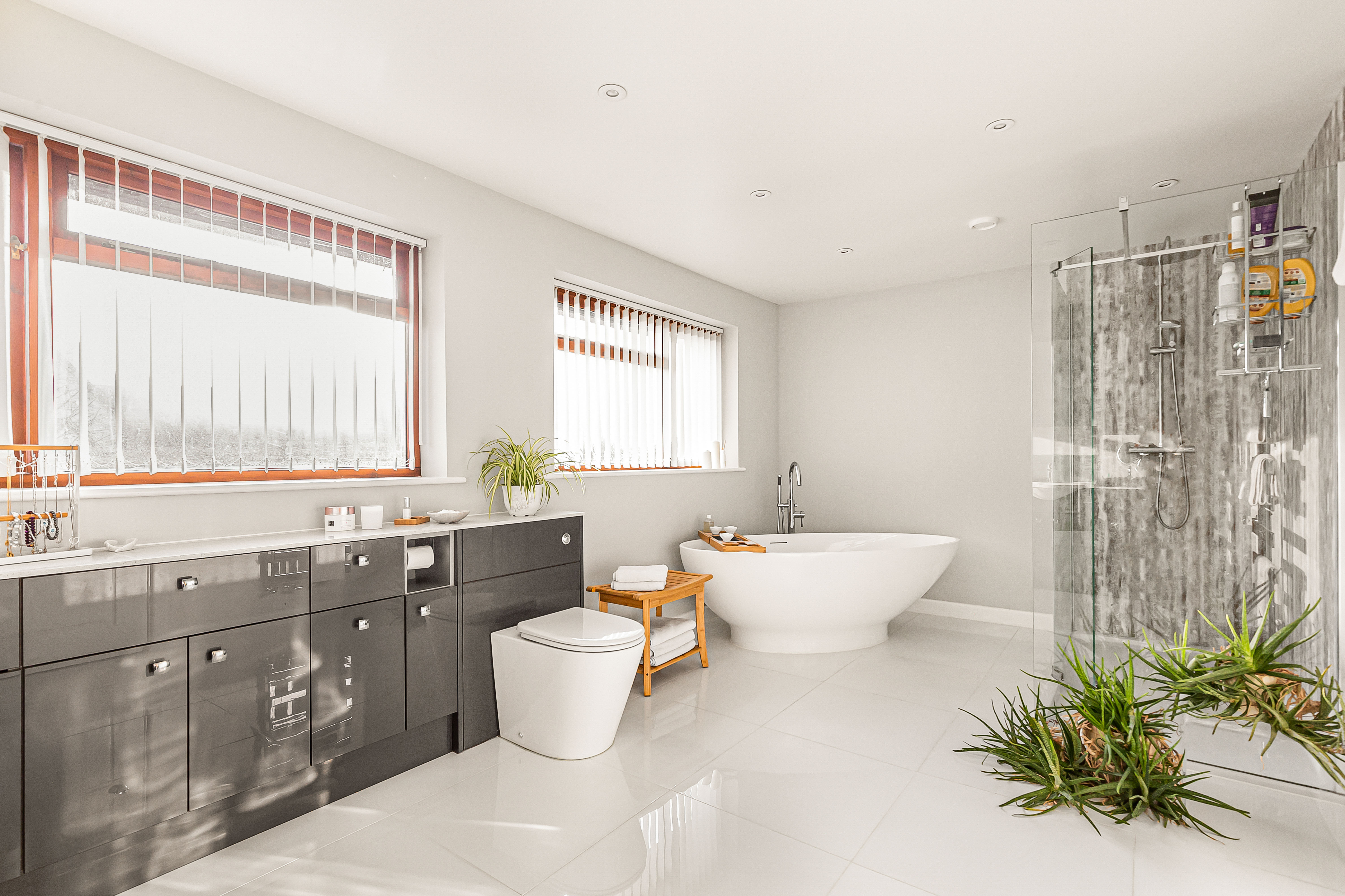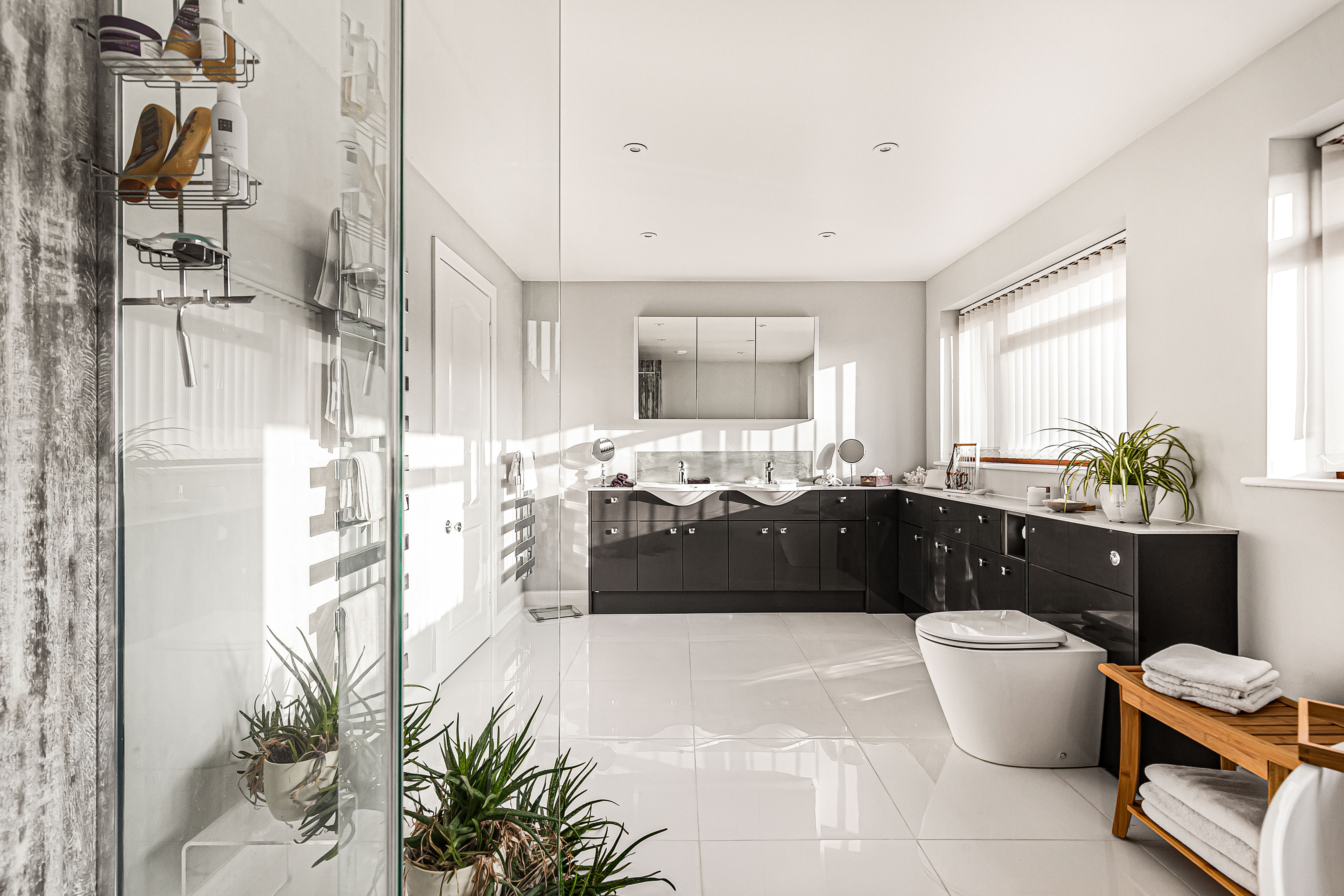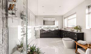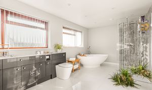 The generously sized en-suite is fitted with a modern four piece suite comprising free standing bath, double shower cubicle with rainfall shower head and marble effect shower wall, close coupled WC and a twin wash hand basins with vanity storage underneath. Tiled surrounds, heated flooring and two heated towel rails.