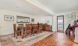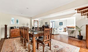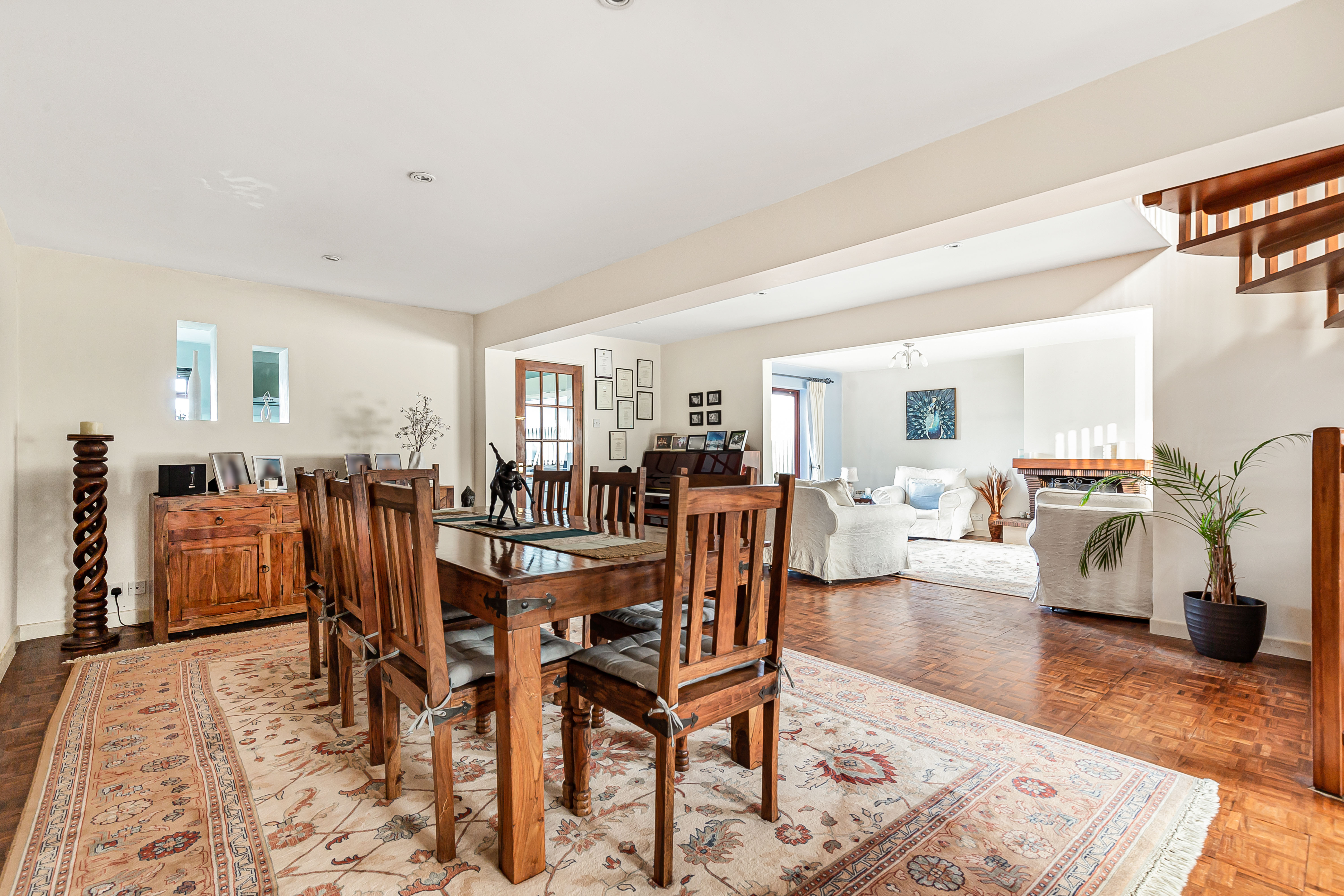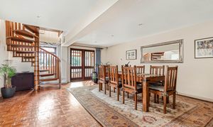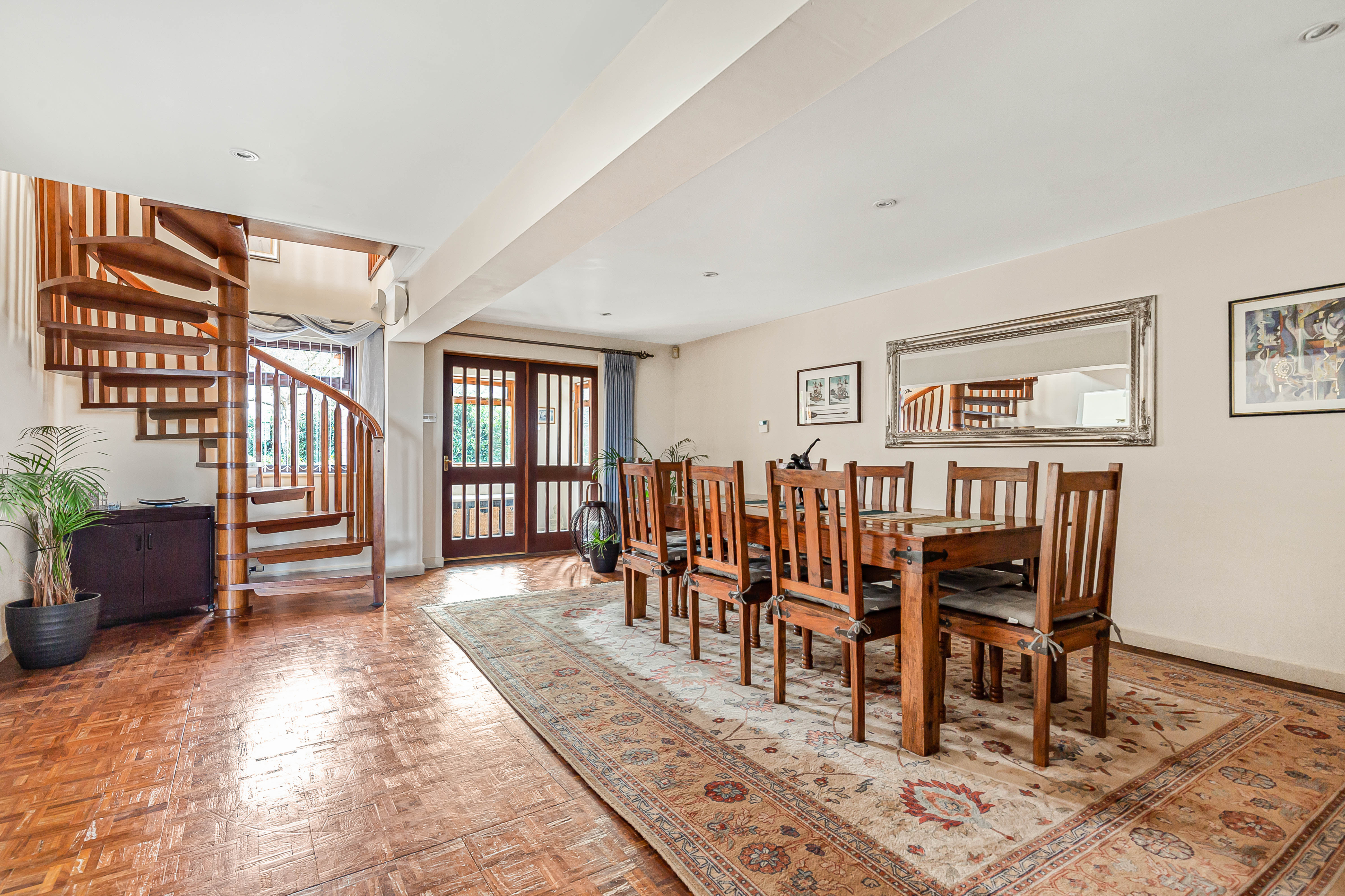 The dining room has a teak spiral staircase to the first floor and beautiful hardwood flooring