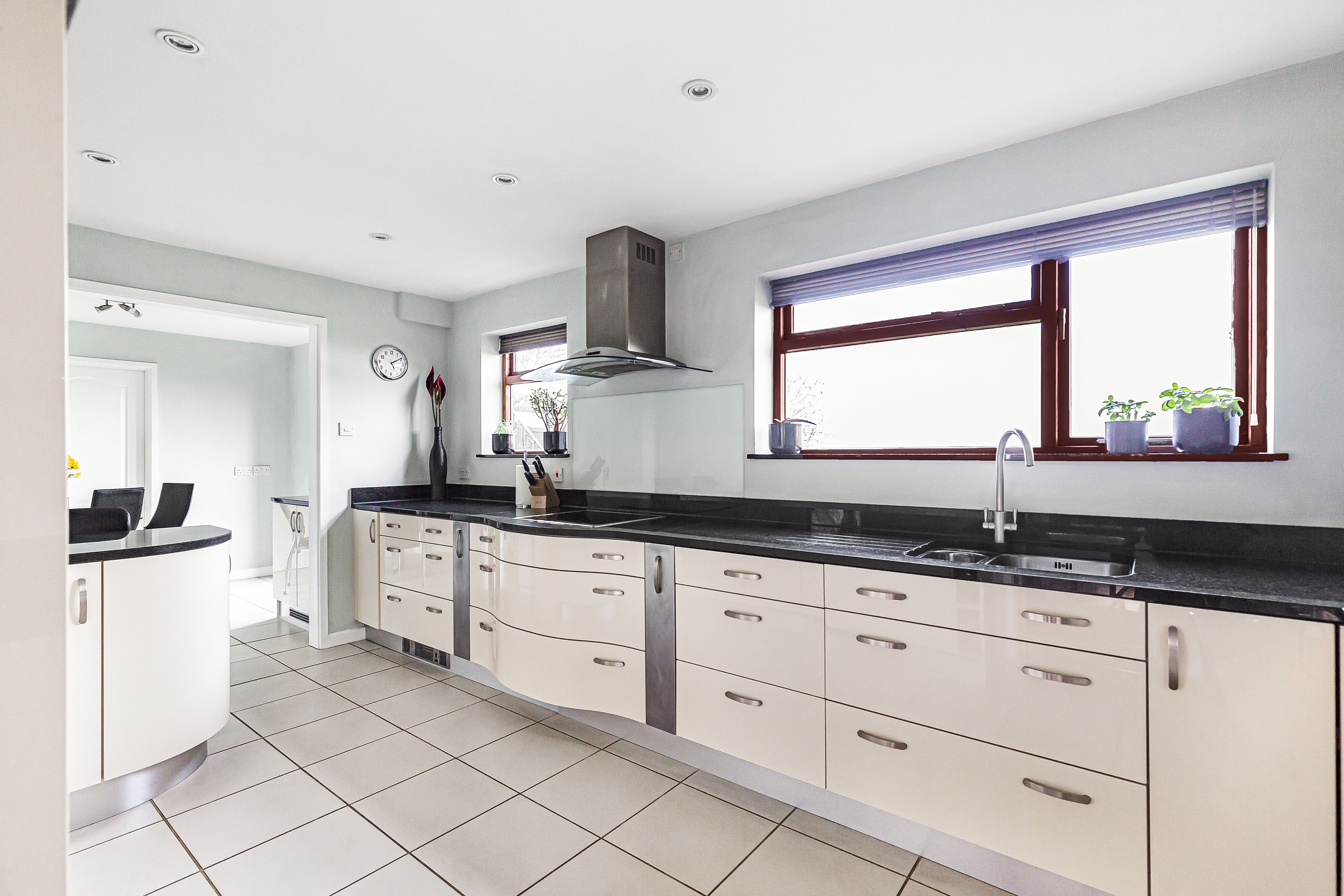 The kitchen has been modernised with a range of smart high gloss base and wall mounted cupboard units, granite worktop with a breakfast bar seating area and integral appliances including a double electric oven, induction hob with extractor over and windows overlooking the rear garden.