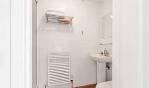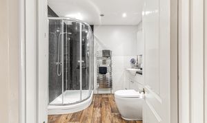 Fitted with a contemporary three piece suite comprising shower cubicle with independent shower over with a rainfall shower head, close coupled WC and a wash hand basin with a vanity cupboard underneath. Tiled surrounds and a chrome heated towel rail.
