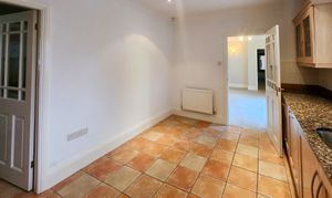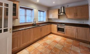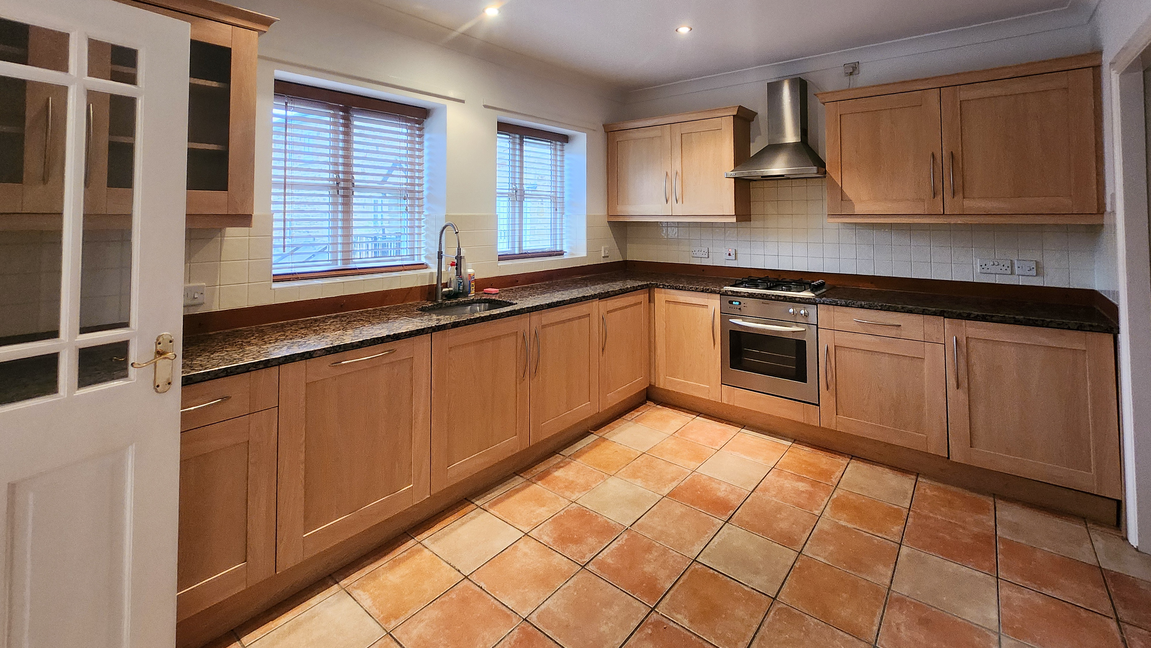 The well-appointed kitchen combines practicality with refinement. Fitted with light oak cabinetry, marble worktops, and a full range of integrated appliances, it offers ample space for family dining. Terra cotta tiled flooring adds warmth and character, complementing the bright and airy design.