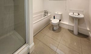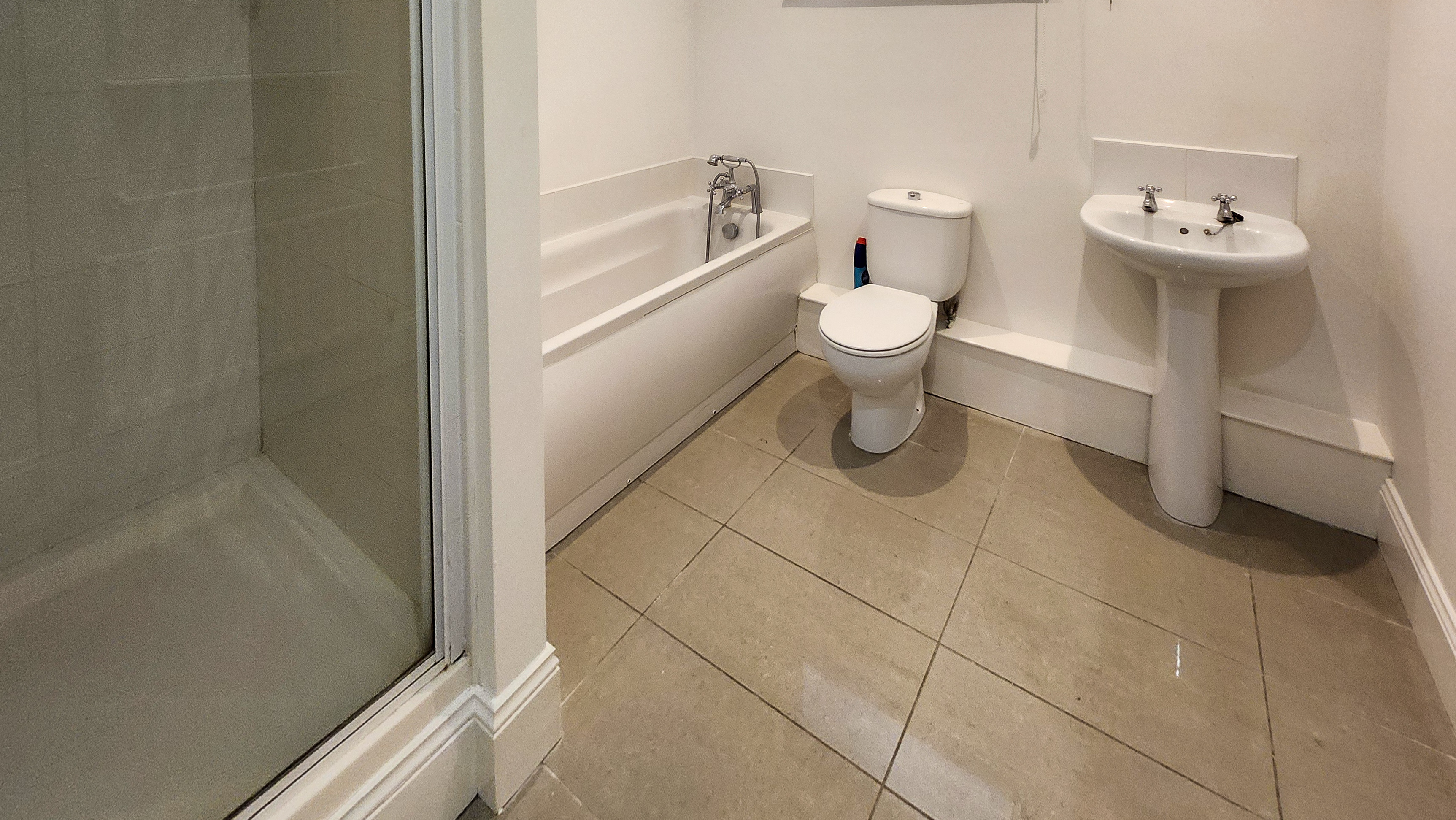 The family bathroom is finished to a high standard with high-gloss grey tiles, a panelled bath, separate shower cubicle, pedestal basin, and low-level W.C., combining function and finesse.