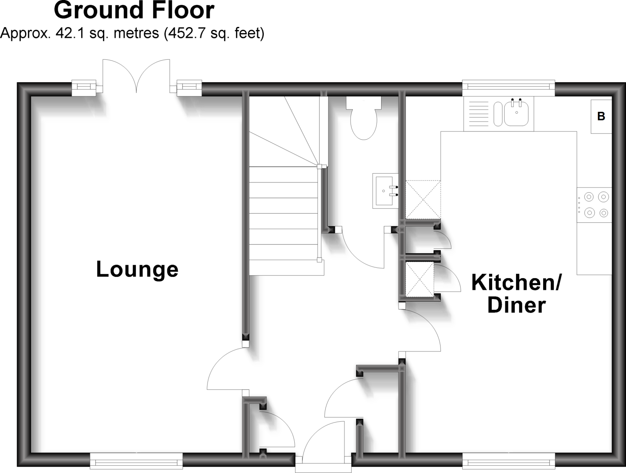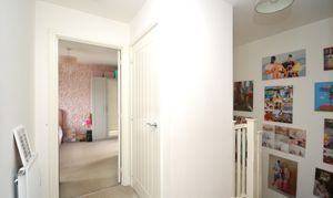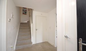 Composite glazed front door, Karndean flooring, carpeted stairs to first floor landing. Storage cupboard and a radiator. Doors To :-