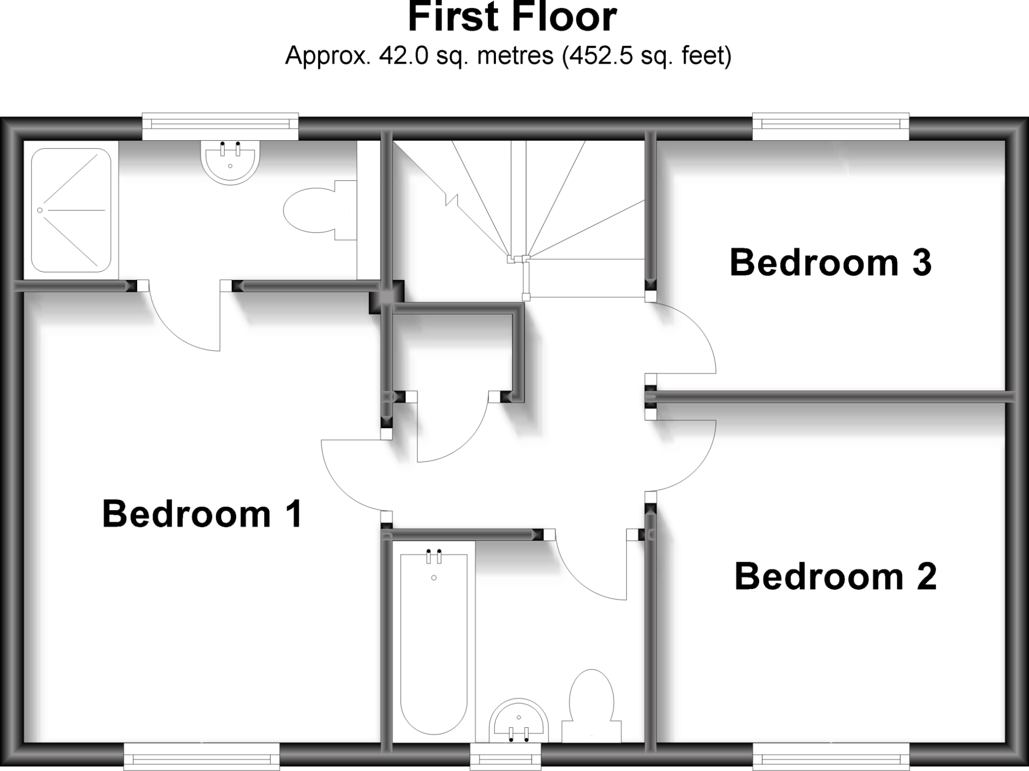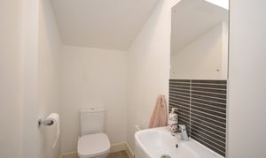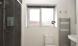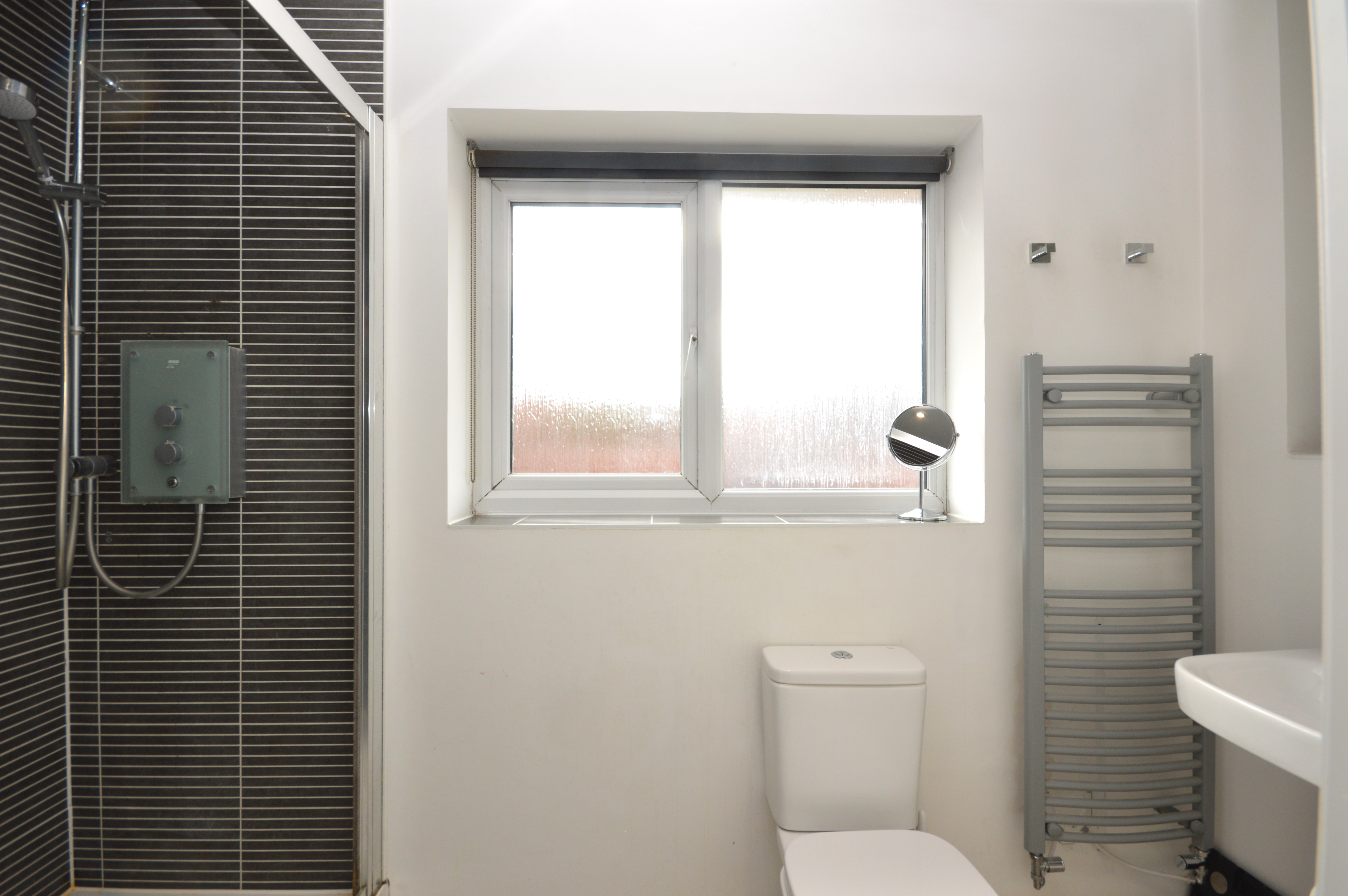 UPVC double glazed frosted window to the rear. Large double shower, closed couple WC, hand basin, part tiled walls, LVT flooring and a heated towel rail.