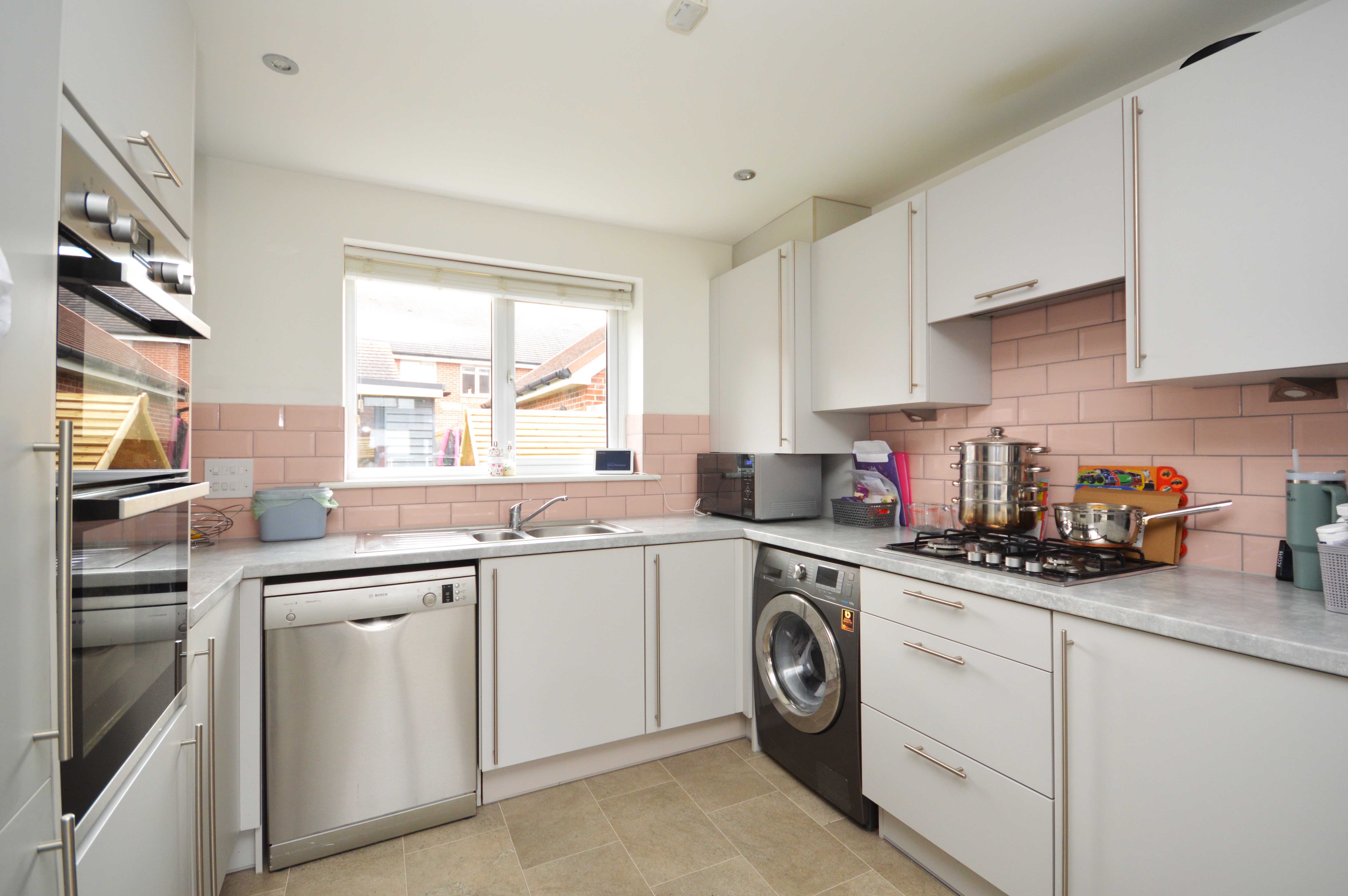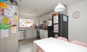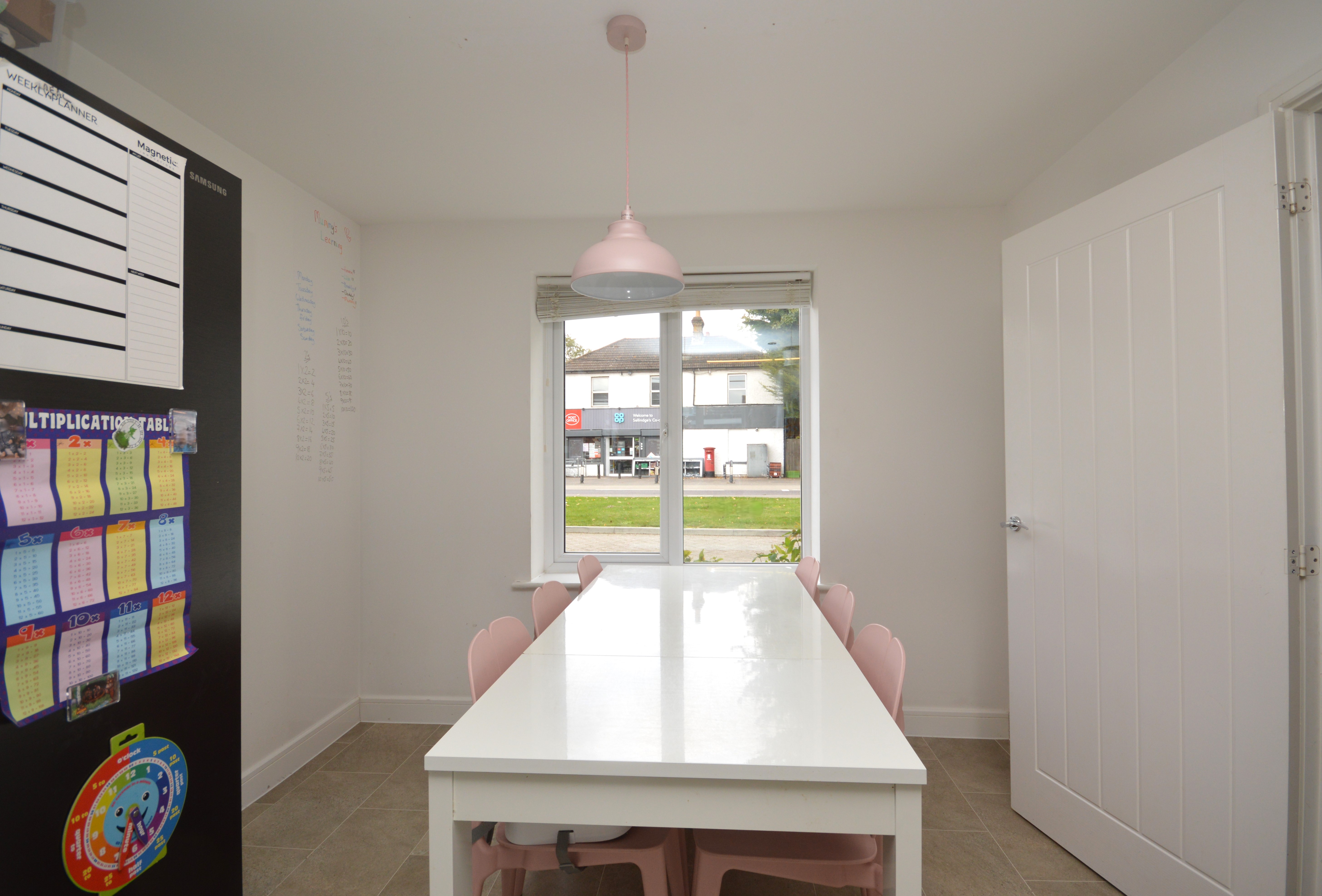 Dual aspect room with UPVC double glazed windows to the front and rear. Karndean flooring, Kitchen comprises of matching wall and base units, double oven bottom fan and top grill. Space for a freestanding American style fridge freezer. Space for washing machine and space for a dishwasher. Cupboard housing a combi boiler, stainless steel sink, part tiled walls & space in the dining room for table and chairs.