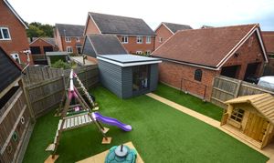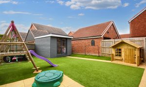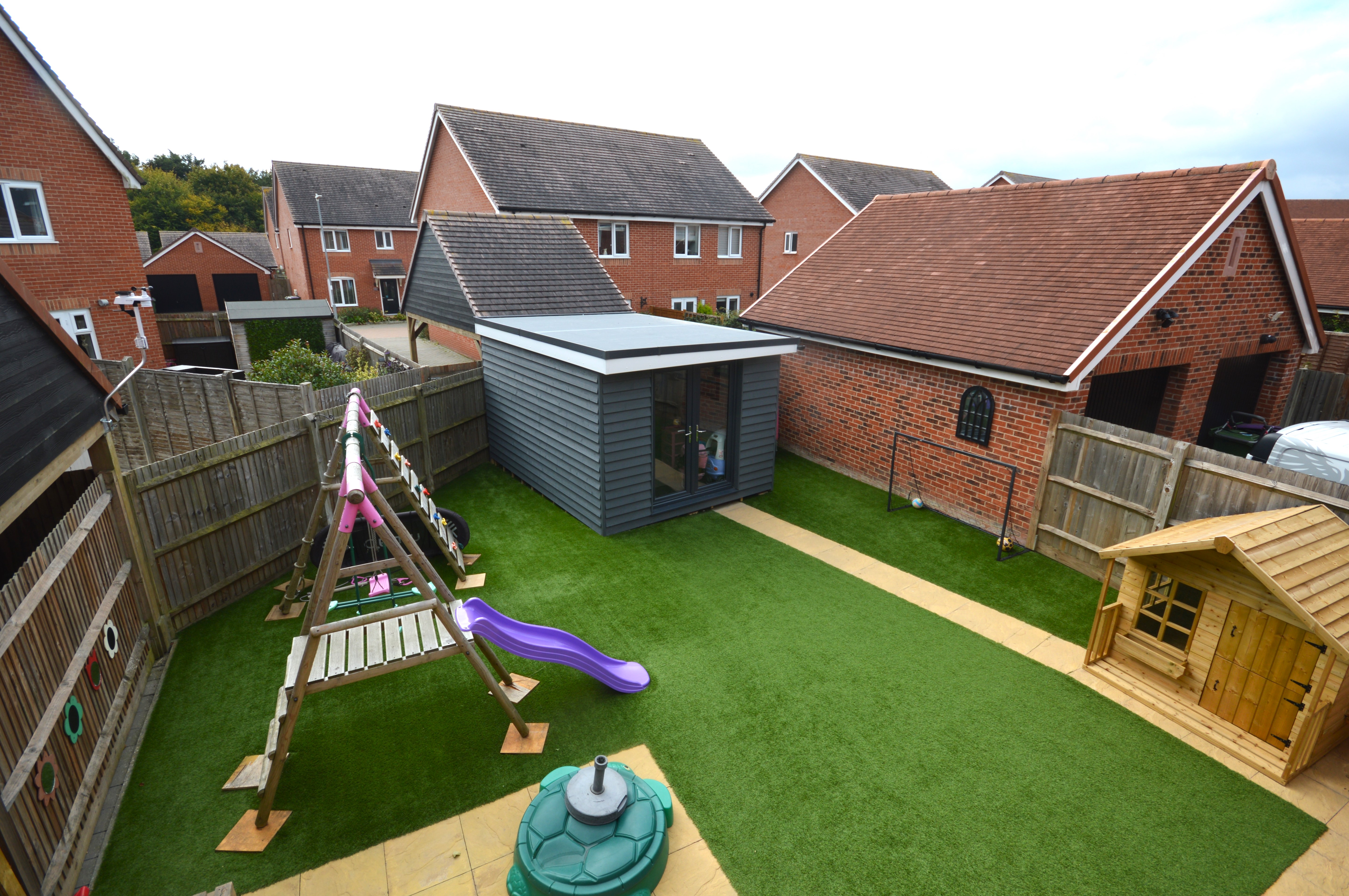 Large patio area as you exit out from the lounge. Pathway leading down to side access towards garage and off road parking. Additional pathway leading down to large summer house/cabin. Cabin is insulated with UPVC double glazed doors. Large area laid to artificial grass and south-west facing garden.