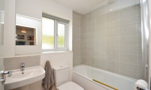 UPVC double glazed frosted window to the front. Bath with thermostatic shower overhead. Closed couple WC, hand basin, LVT flooring, heated towel rail and part tiled walls.