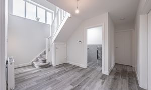 A wide, light-filled hallway sets the tone, its luxury grey wood-look vinyl flooring flowing seamlessly through the ground floor. Beneath the stairs, clever storage and a neat consumer unit are tucked away, while a stylish downstairs W/C with window and Instinct sink offers a welcome touch of convenience.