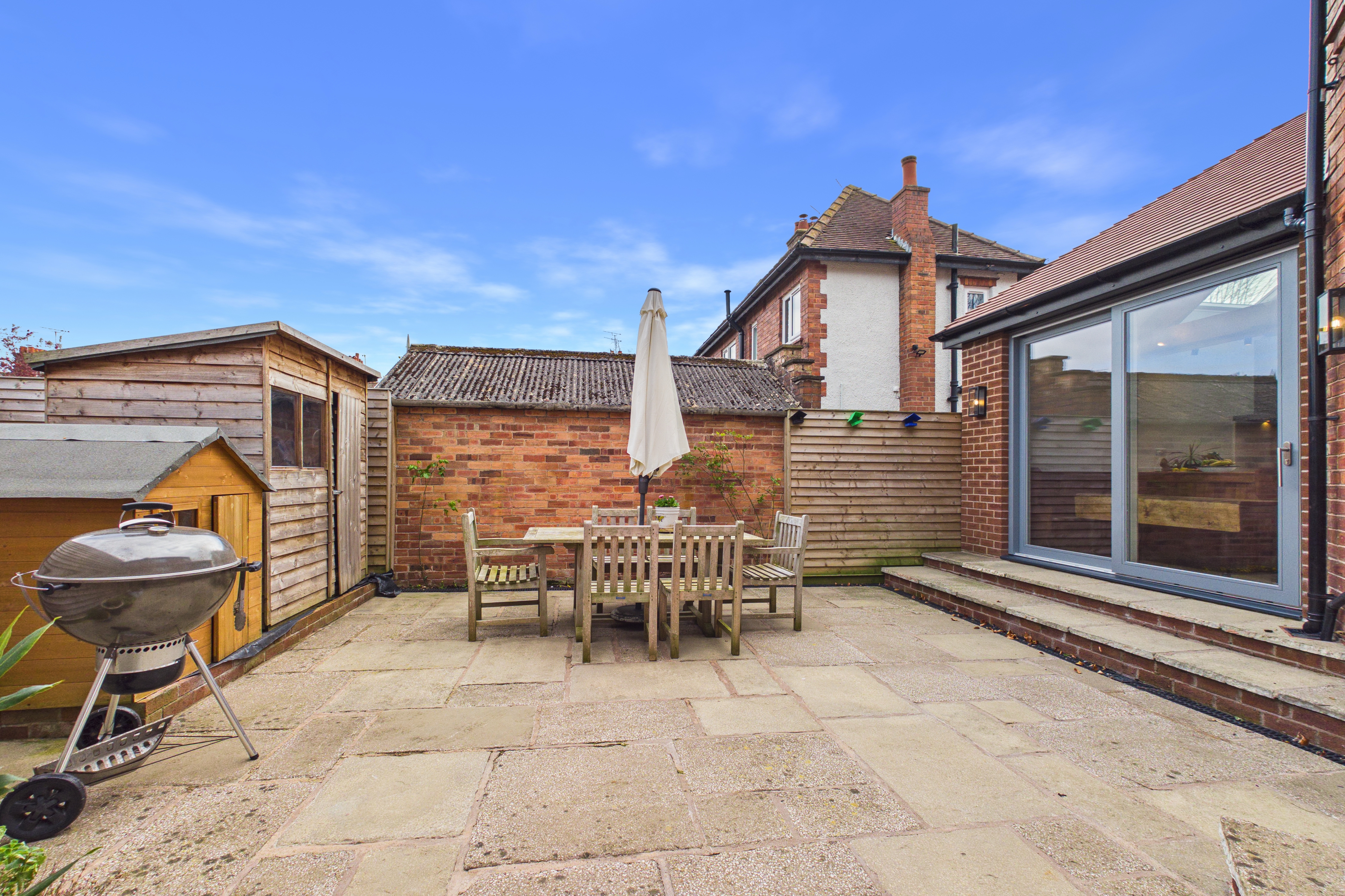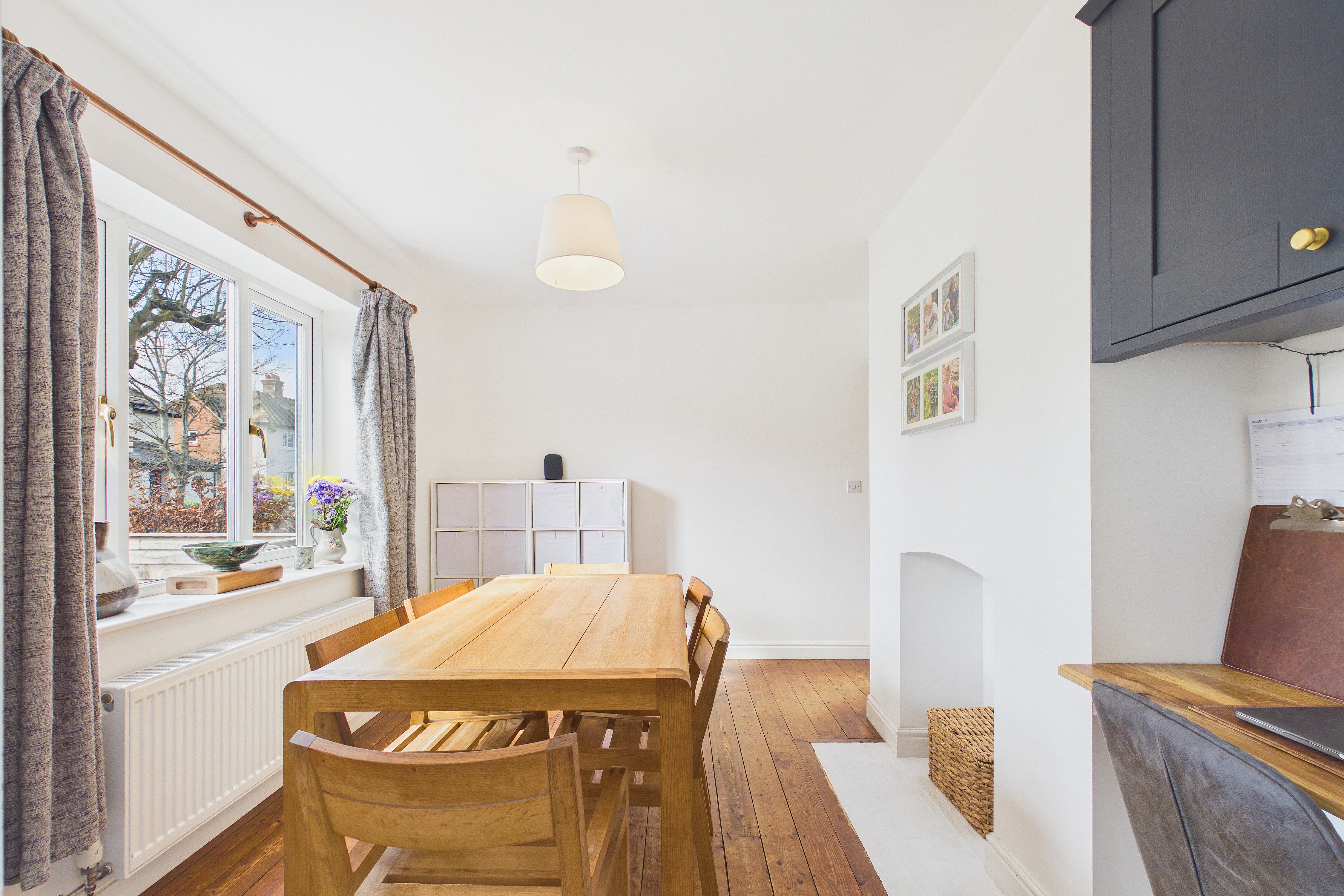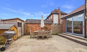The kitchen is equally impressive, fitted with a comprehensive range of shaker-style units complemented by quartz work surfaces and matching upstands. A selection of quality integrated appliances enhances both practicality and aesthetic appeal, while a cleverly concealed larder space adds a delightful touch of convenience. The adjoining dining area is bathed in natural light and benefits from sliding doors that open directly onto the rear garden, creating a seamless indoor-outdoor flow.