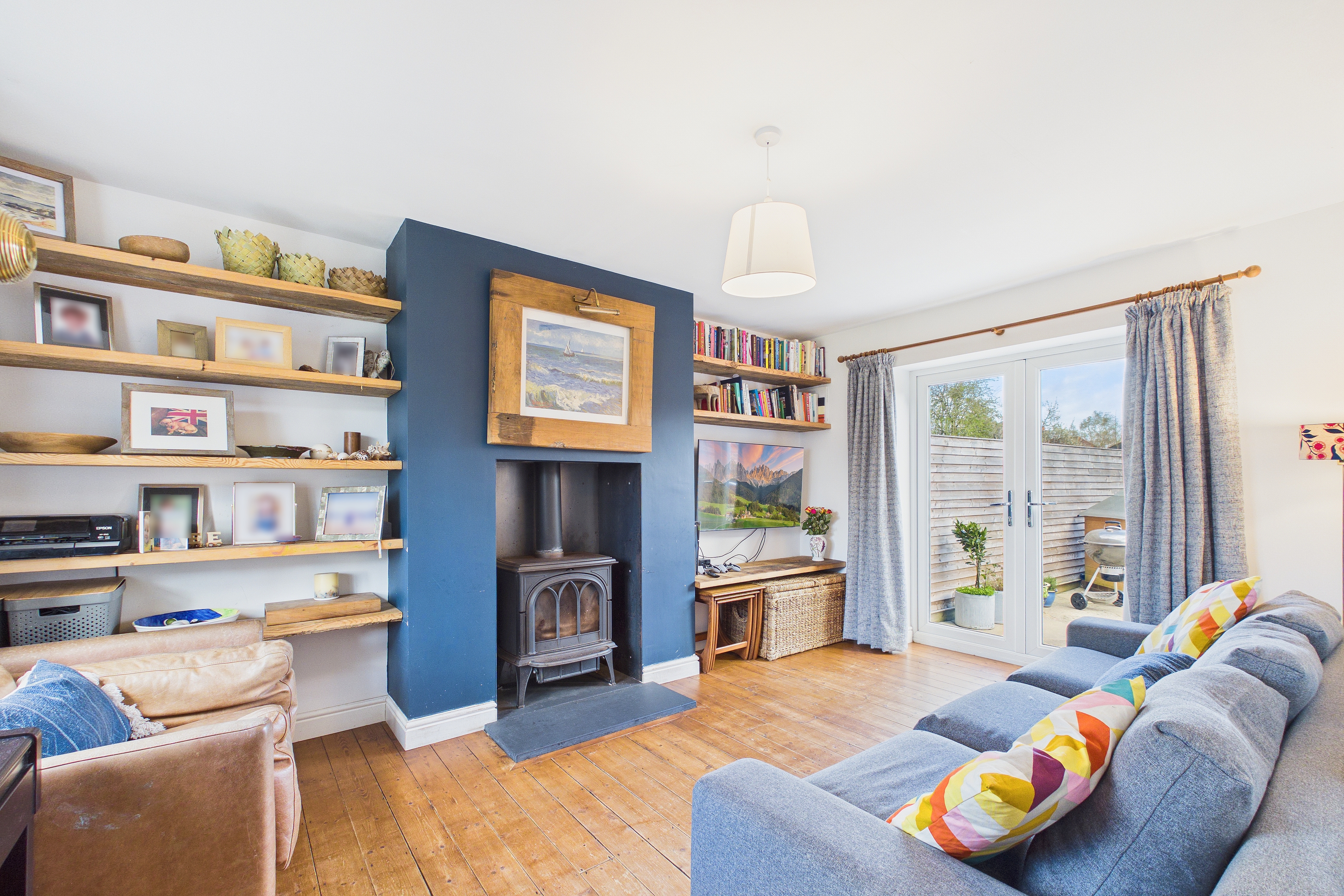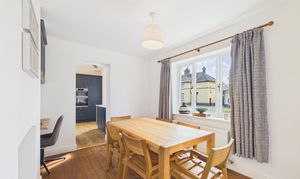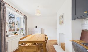 Inside, the welcoming entrance hallway features a turned staircase rising to the first floor. The living room offers a cosy yet spacious retreat, complete with a recessed chimney breast suitable for a log burner or fireplace, along with alcove shelving and French doors opening onto the rear garden. A separate dining room provides an additional reception space and now enjoys an open connection to the kitchen, enhancing the overall flow of the ground floor.