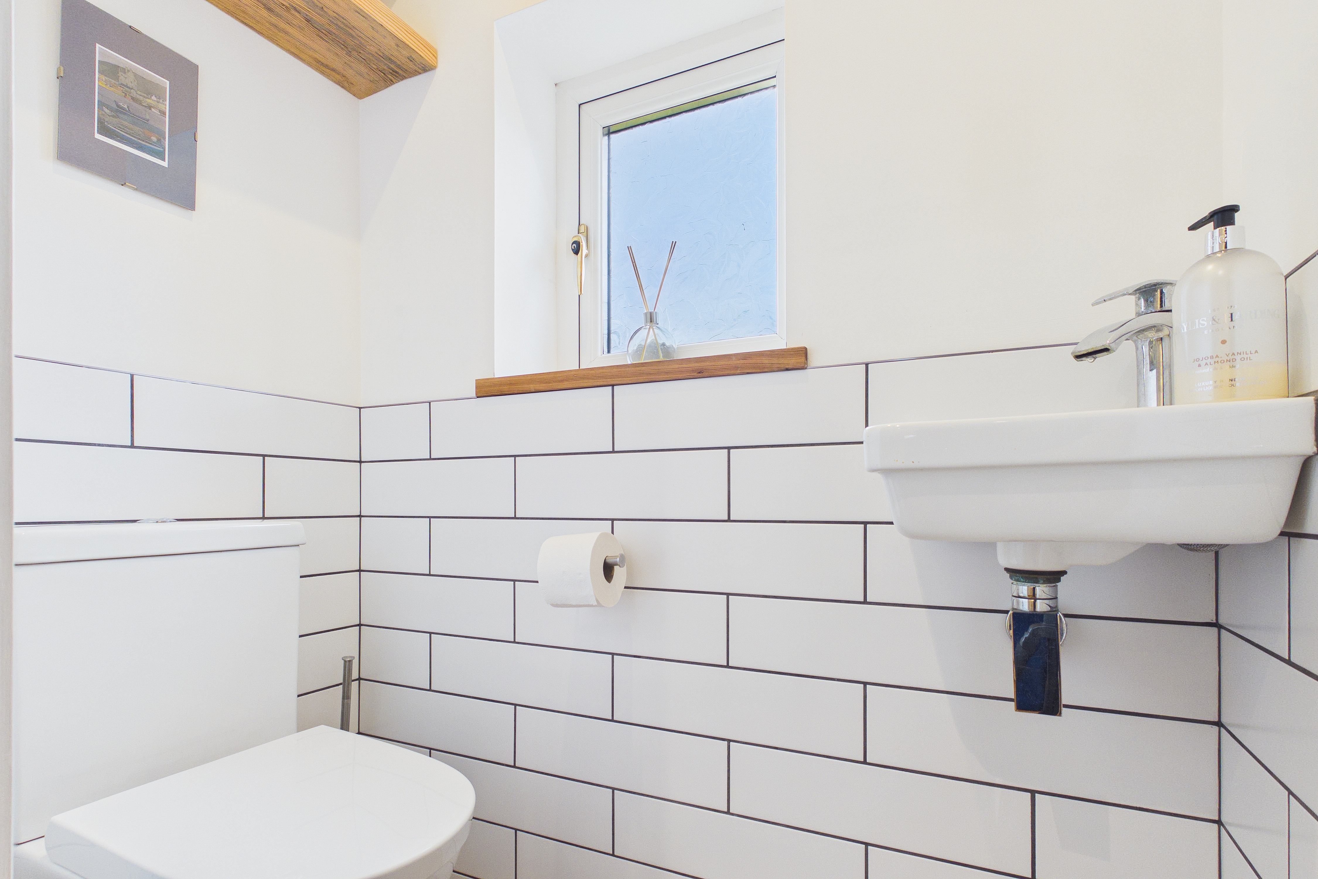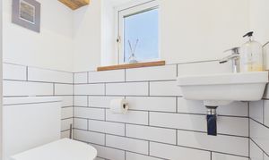 The original kitchen has been thoughtfully repurposed into a practical utility room, complete with fitted cupboards, work surfaces, a sink, and space with plumbing for both a washing machine and dryer. A convenient downstairs WC completes the ground floor accommodation.