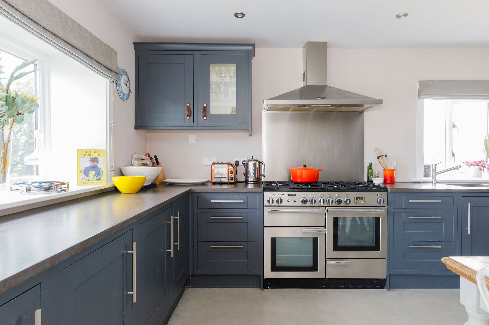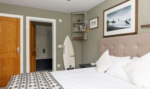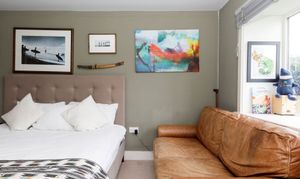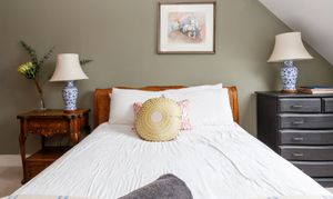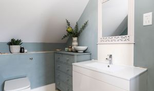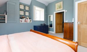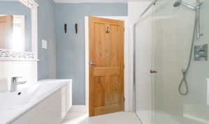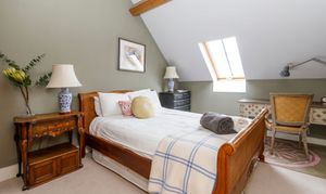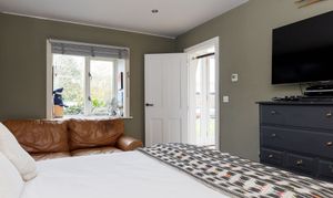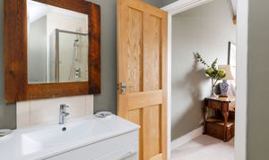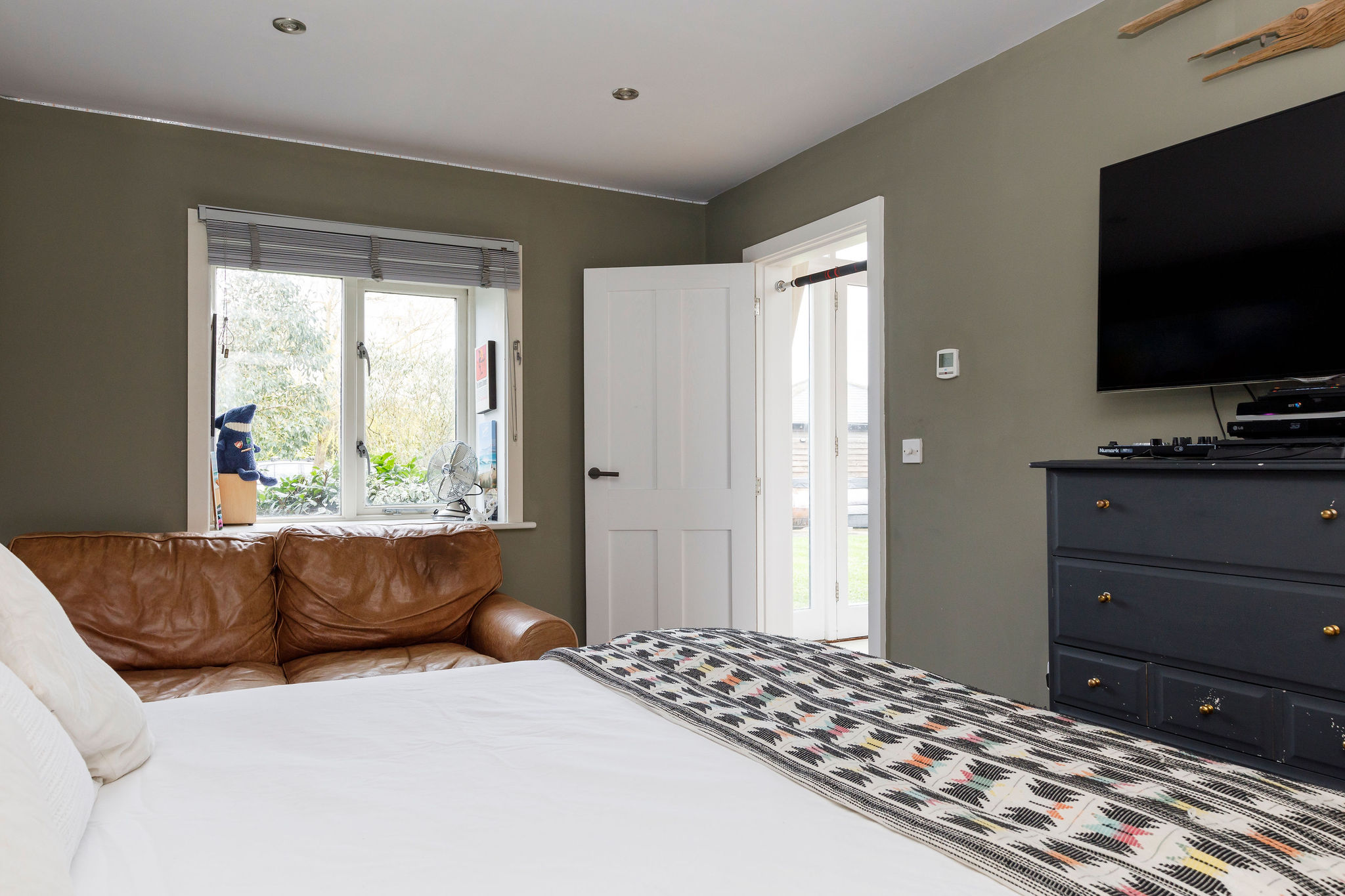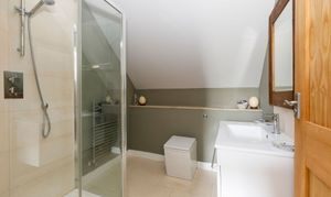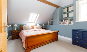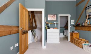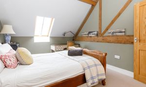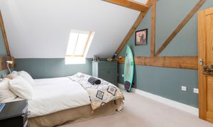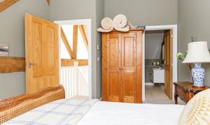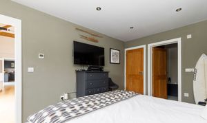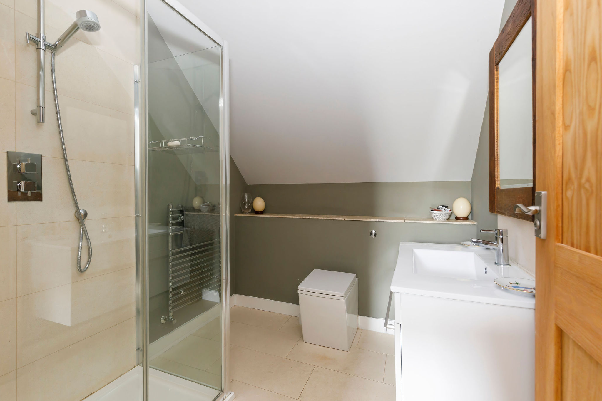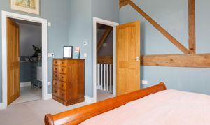 The barn’s thoughtful layout includes two separate staircases leading to the first floor, providing a sense of symmetry and allowing for distinct areas of retreat within the home. At the western end, a charming double bedroom includes an en-suite shower room. At the eastern end, two further double bedrooms, each with their own en-suite shower rooms, provide comfortable and light-filled spaces for family or guests. Skylight windows flood the first floor with light, enhancing its open, airy feel.