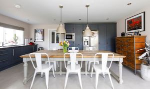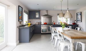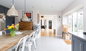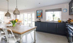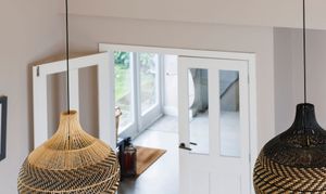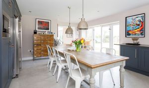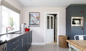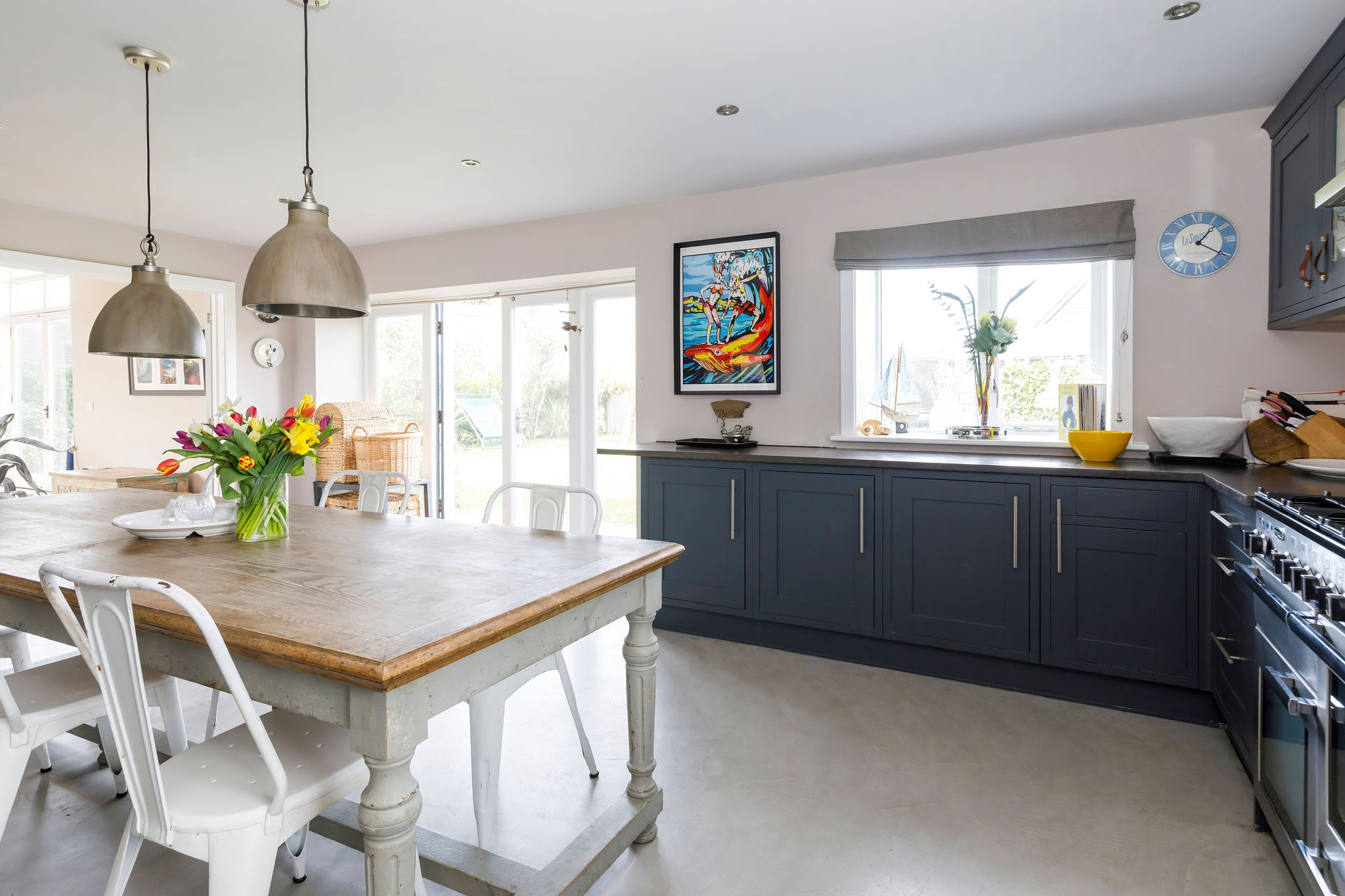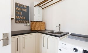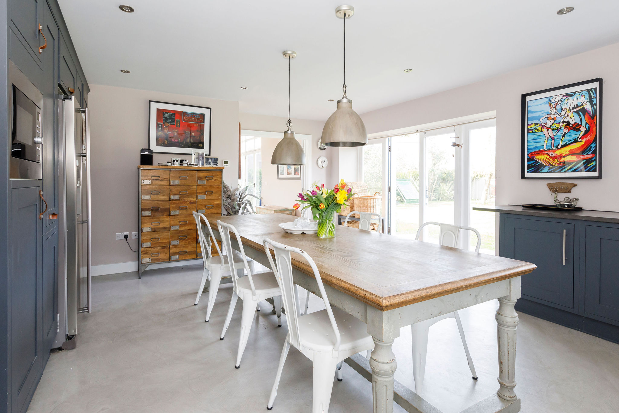 This superb reception area flows seamlessly through double doors into a spacious kitchen breakfast room, beautifully appointed with a generous range of integrated appliances. The polished micro-cement flooring and sleek worktops lend a subtle contemporary edge, while glazed doors open directly onto the garden, creating a perfect link between indoor and outdoor living. A utility room offers additional storage and practicality, and there is also a stylish cloakroom on this level.