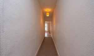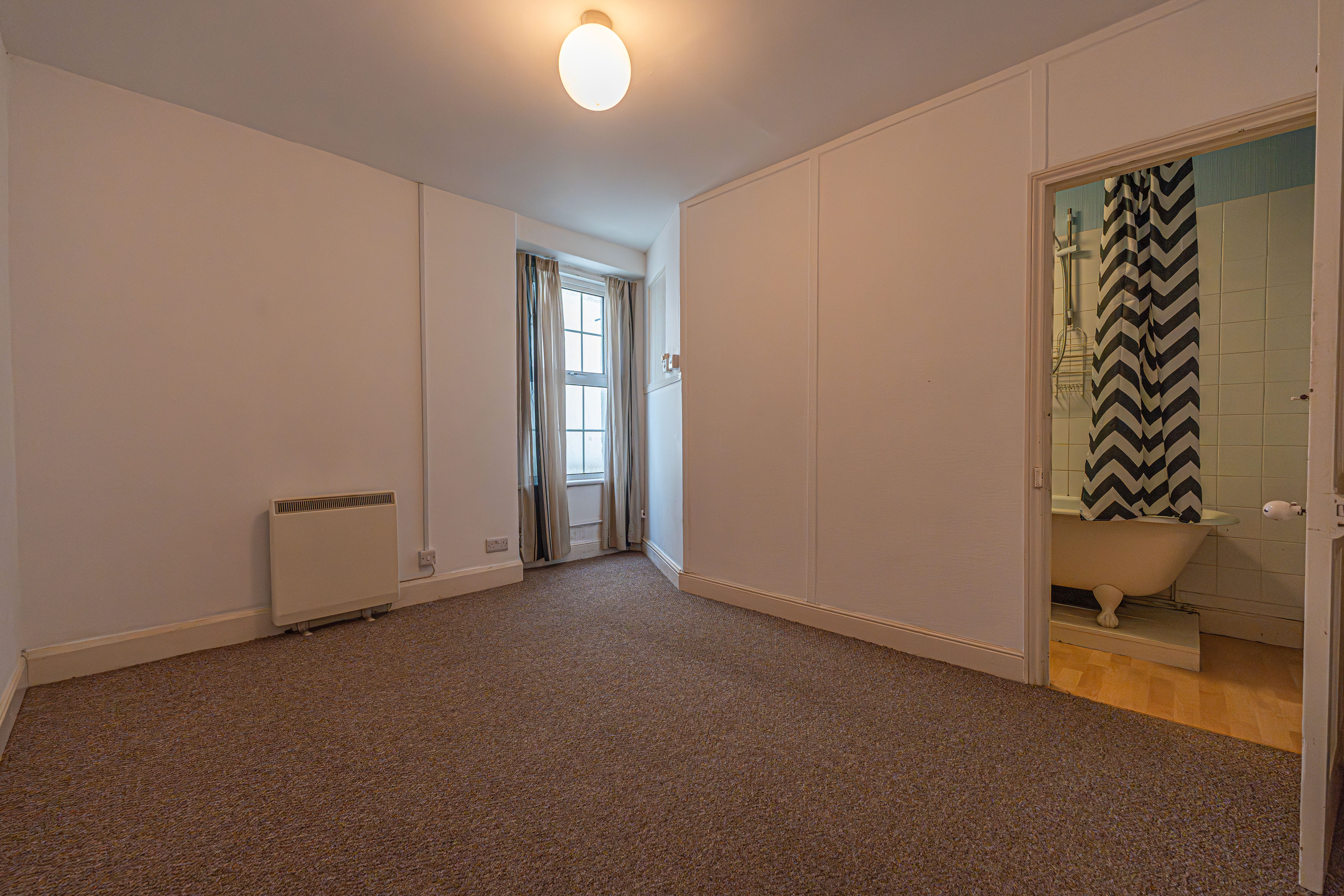 The second floor apartment is currently unoccupied and we find an impressively sized living room which is flooded by natural light and provides ample space for lounging and entertaining. The kitchen is practical in design and enjoys a fluid open plan design to the adjacent dining area, which is also very spacious. The second floor also offers a double bedroom, which connects directly to the ensuite bathroom, with both a bathtub and overhead shower fitted.