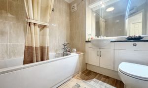 Shower over bath complete with low level fitted W.C and wash basin with storage cupboards, complete with a mirror.
