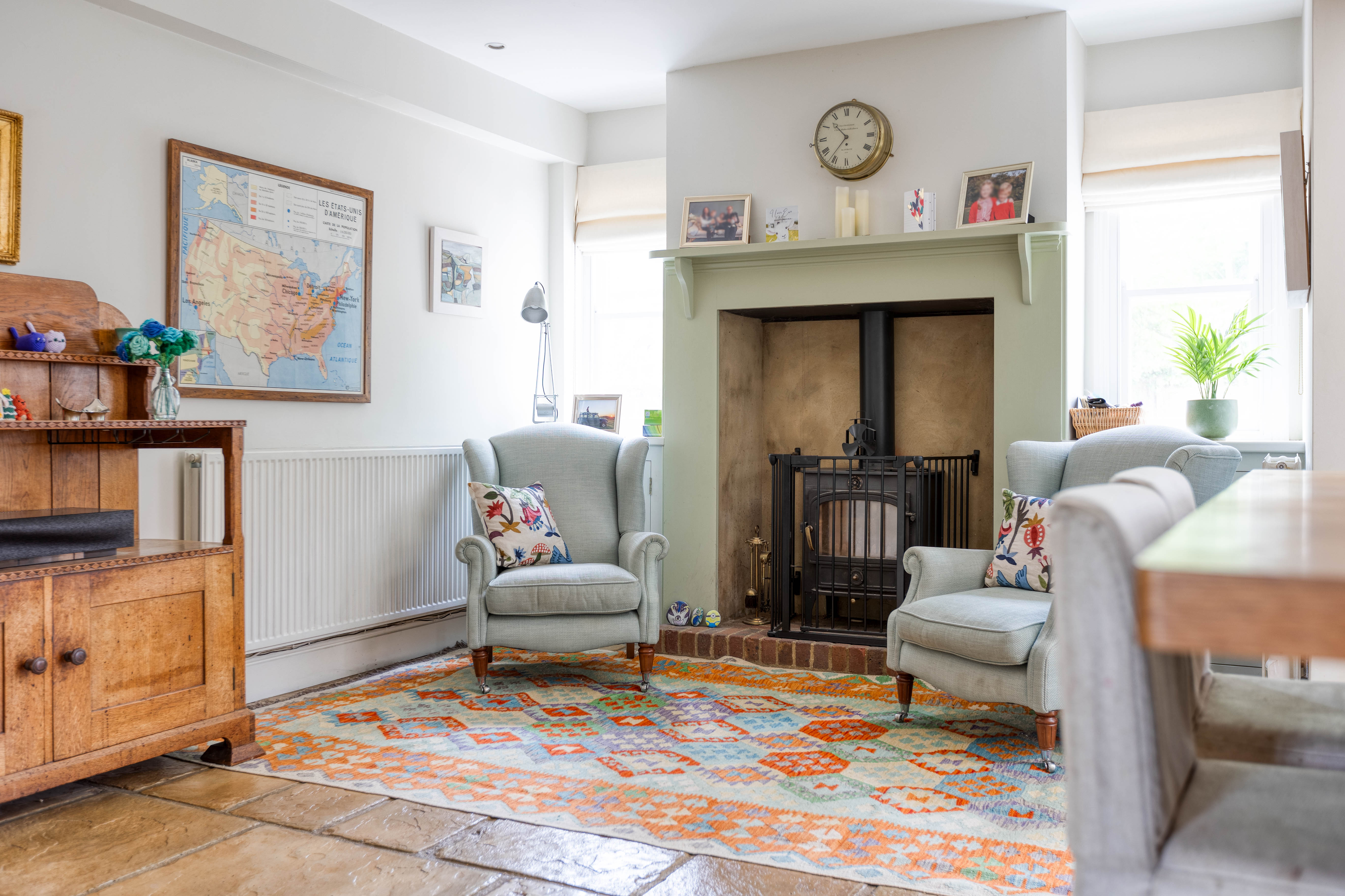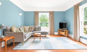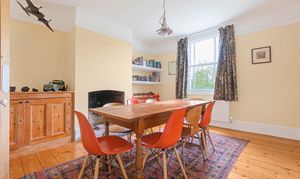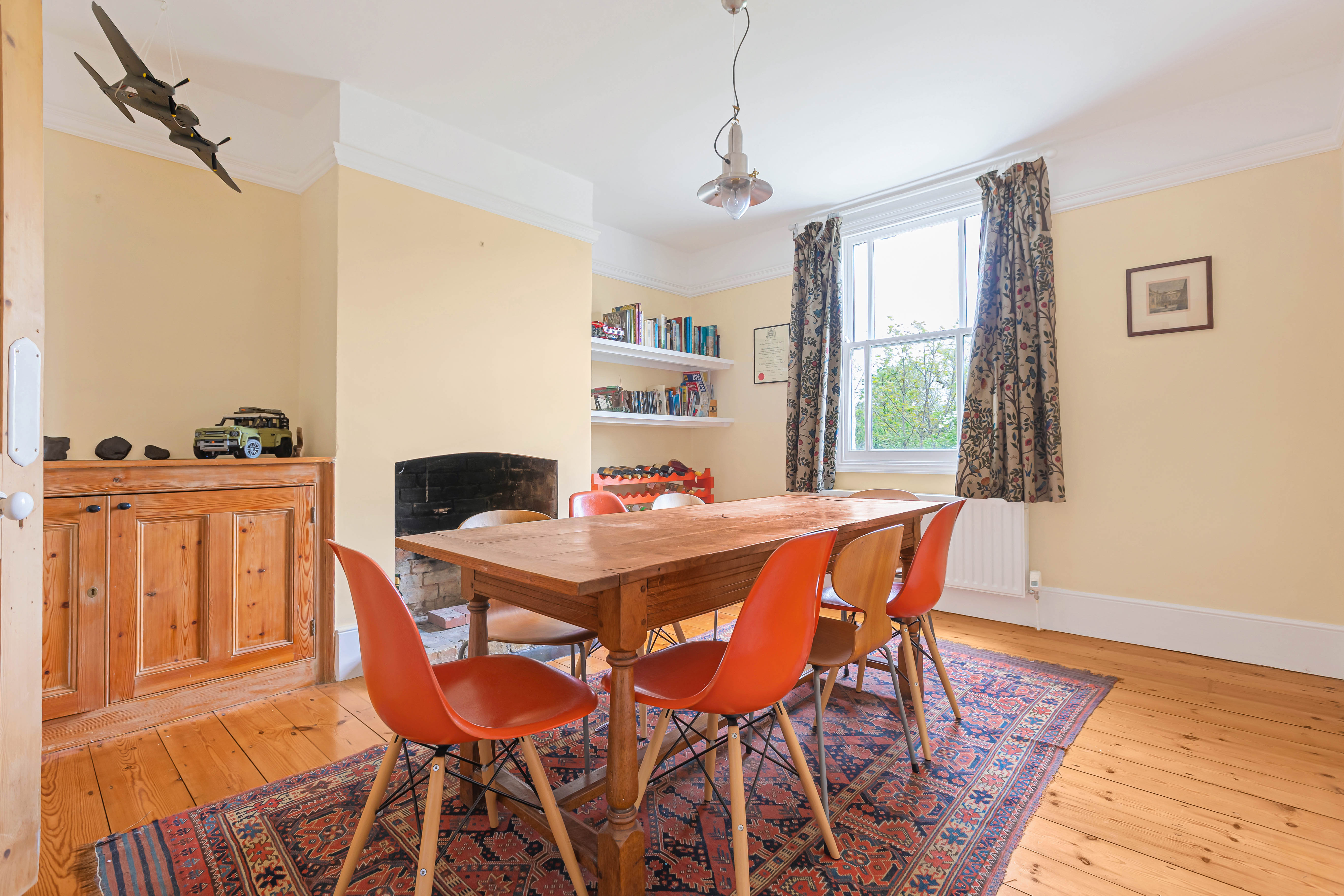 The sitting room is an incredibly generous size, enjoying 4 windows to a dual aspect, a beautiful feature fireplace with a wood-burning stove, stylish decor, attractive wood flooring, high ceilings, inset and sconce lighting, and ample space for a variety of sitting room and storage furniture. The formal dining room adjacent is equally very generous and flexible, featuring attractive wood floor, a fireplace, a window to a side aspect, high ceilings, pendant lighting, and room for a large dining setting. The conservatory offers further brilliantly sized and versatile reception space, enjoying glorious garden views, a stunning pitched roof with Velux windows, floor-to-eaves windows to the garden, tiled flooring, feature lighting, and space for a variety of furniture.