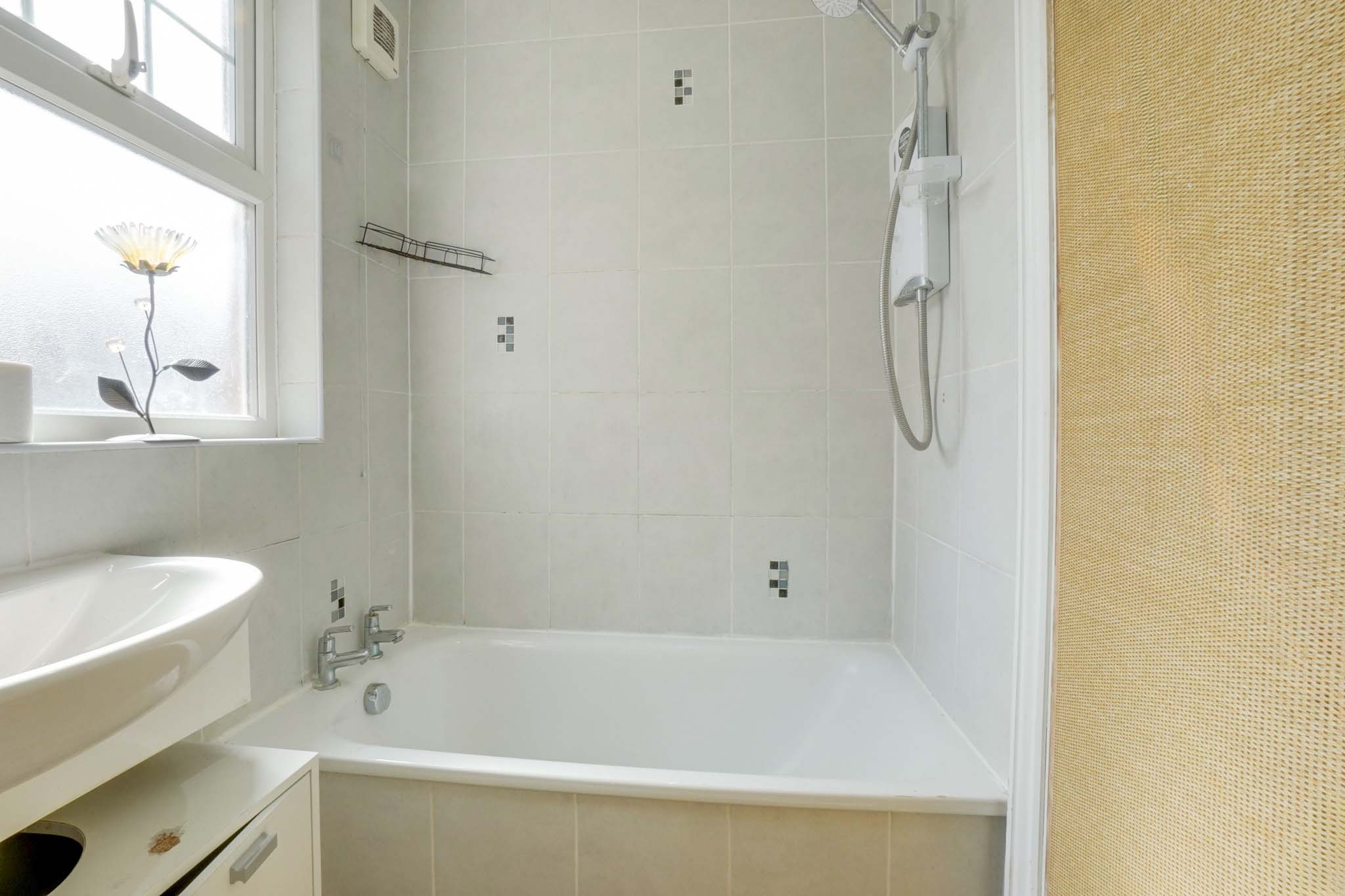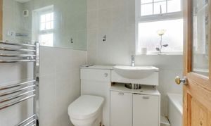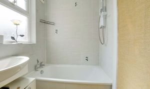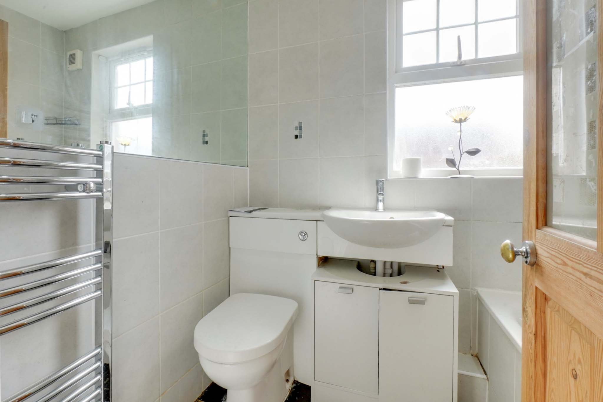 With double glazed window to the side elevation, bath with shower over, pedestal wash hand basin, low-level WC, extractor fan, inset ceiling spotlights, heated chrome towel rail.