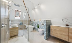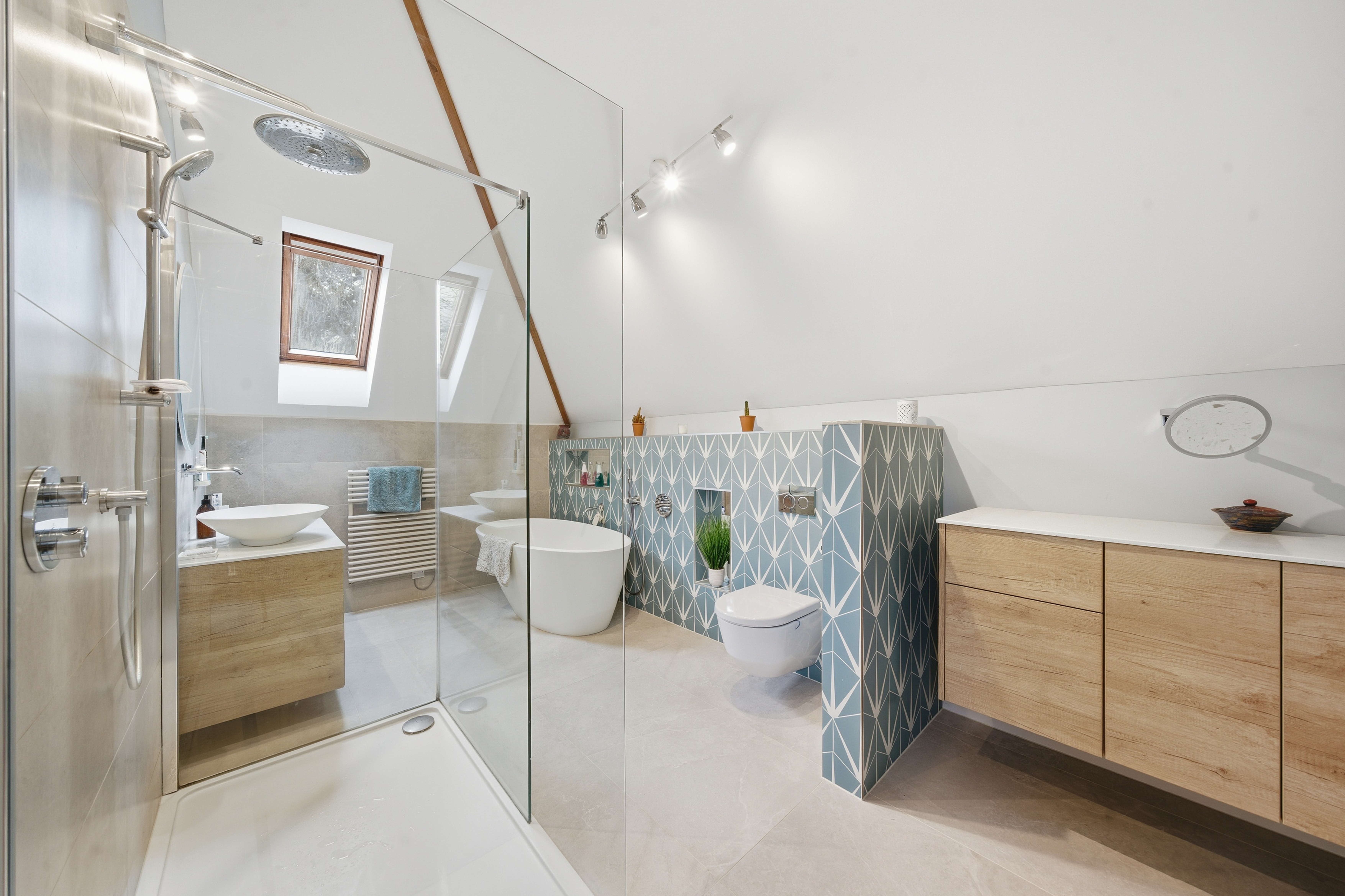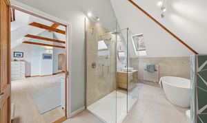 Upstairs, a spacious landing leads to six well‑proportioned bedrooms and the family bathroom, offering outstanding flexibility for a growing family or guests. The principal bedroom suite is a luxurious private retreat with vaulted ceiling, generous proportions, a dressing area with fitted wardrobes and a stylish en‑suite bathroom featuring both a bath and walk‑in shower. A second double bedroom benefits from fitted wardrobes and its own en‑suite shower room, well suited to older children, guests or extended family. Four further double bedrooms provide ample additional accommodation and are served by a modern family bathroom with a large walk‑in shower and contemporary fittings.