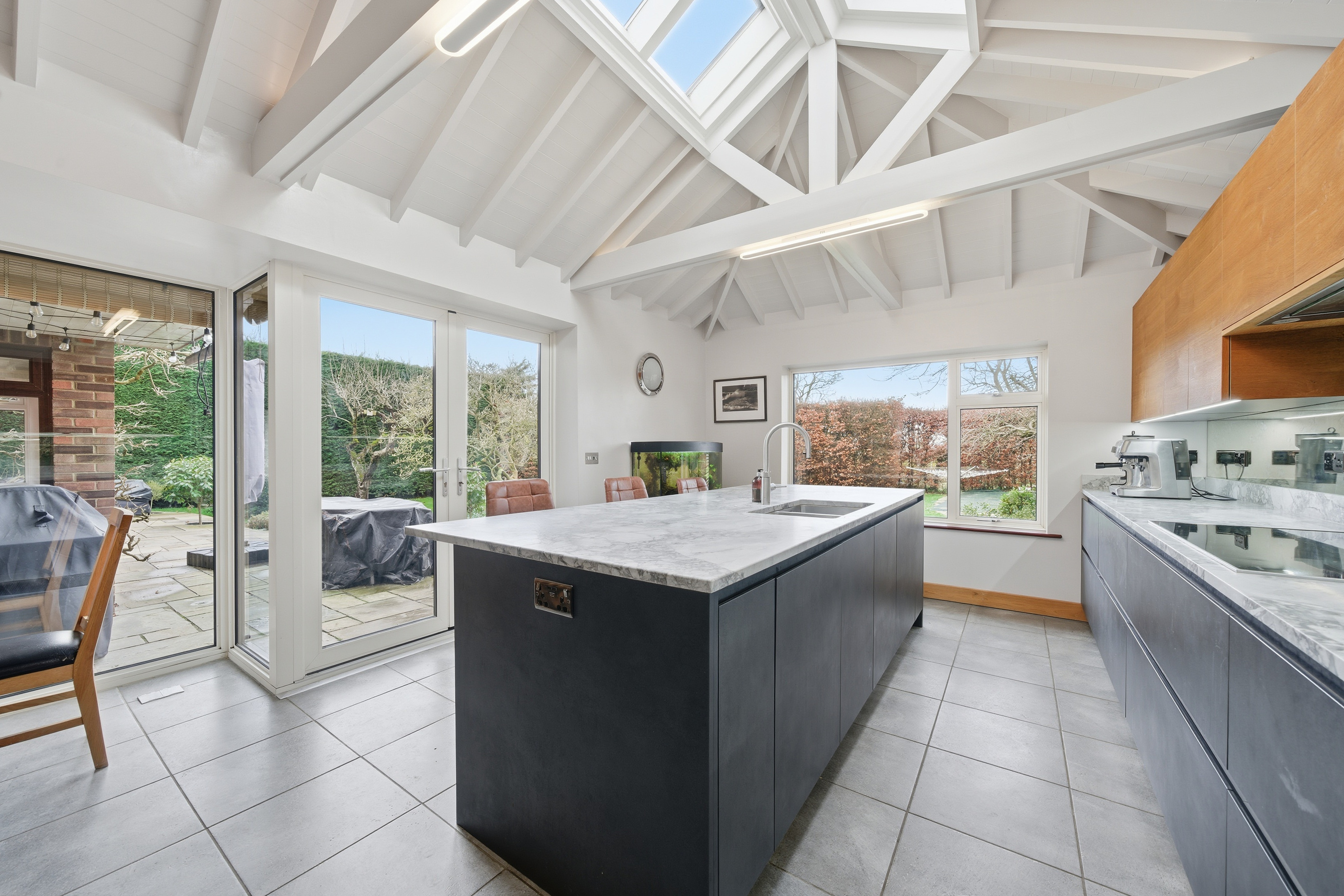At the heart of the home is an impressive split‑level kitchen/breakfast room, comprehensively upgraded in 2023 and designed as a central hub for family life. It is fitted with an extensive range of contemporary wall and base units, quartz work surfaces and a large central island providing additional preparation space and storage, along with a Quooker tap with Cube for instant boiling, chilled and sparkling water. A high‑quality suite of integrated Miele appliances includes double ovens, a steam oven, dishwasher and induction hob. A vaulted ceiling with multiple rooflights floods the space with natural light, while French doors open directly onto the patio and frame attractive views across the garden towards the swimming pool. Generous fitted storage further enhances everyday practicality. Additional ground floor accommodation includes a front‑facing study ideal for home working, a well‑equipped utility room with external access, a useful pantry cupboard and a conveniently positioned cloakroom.