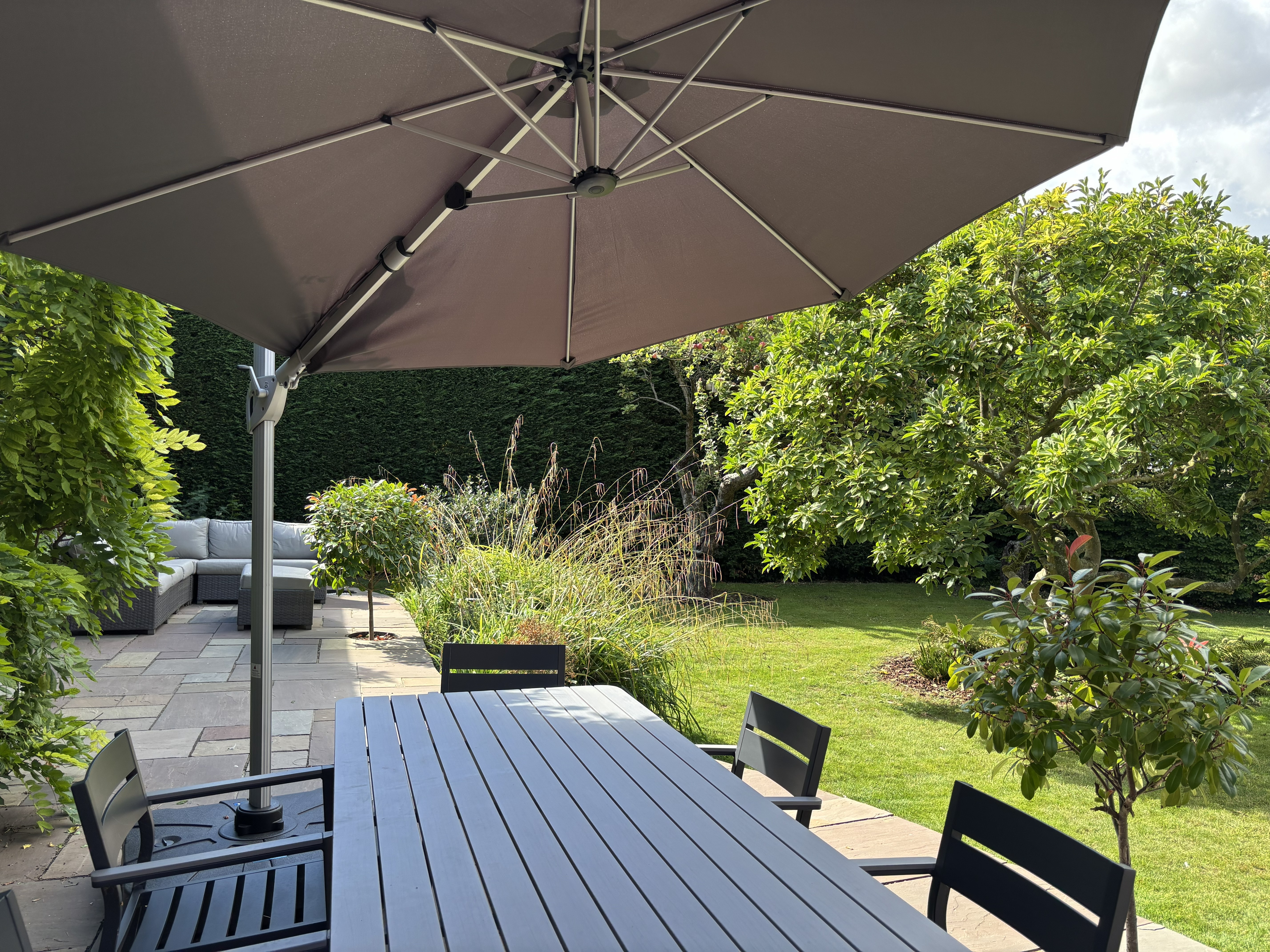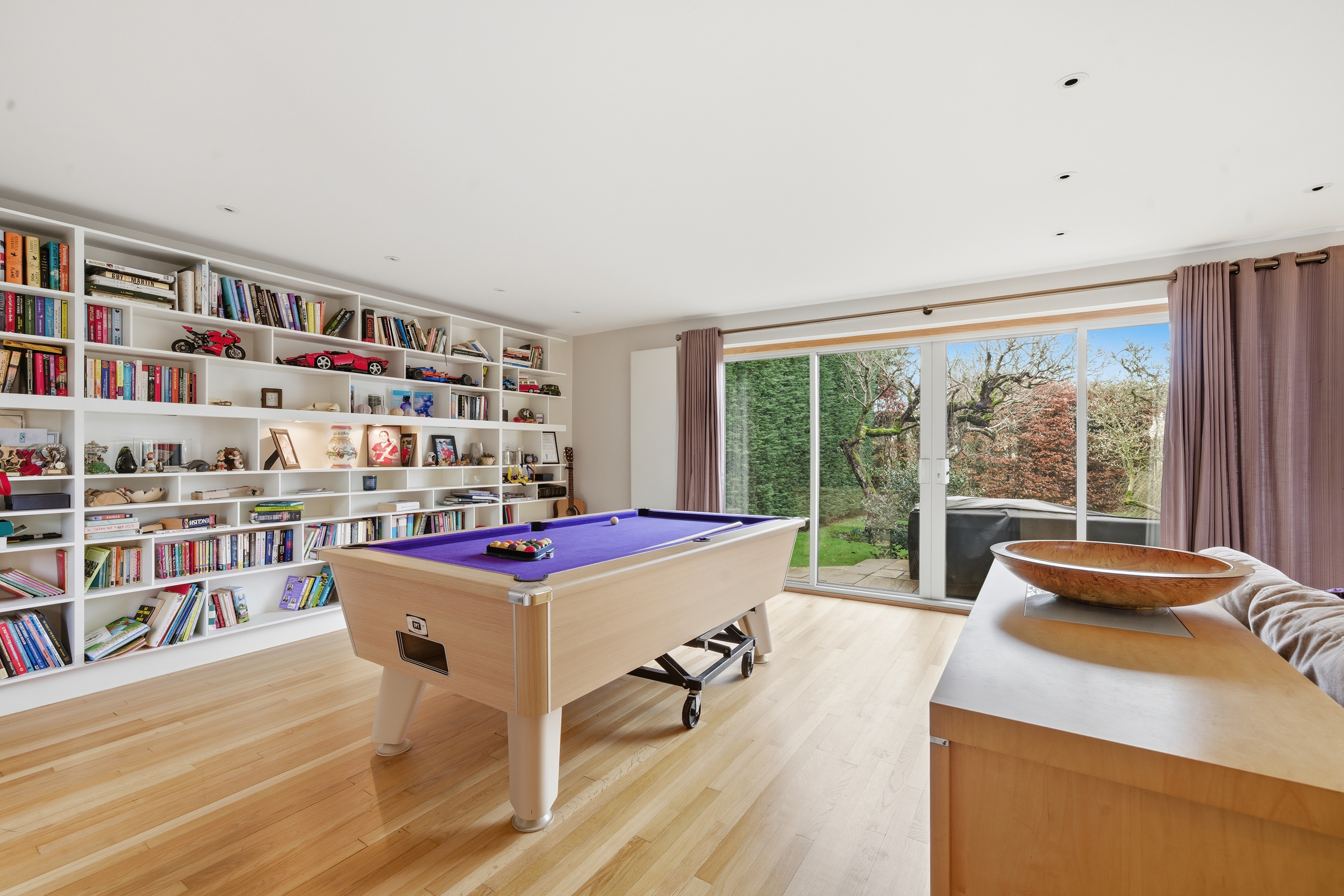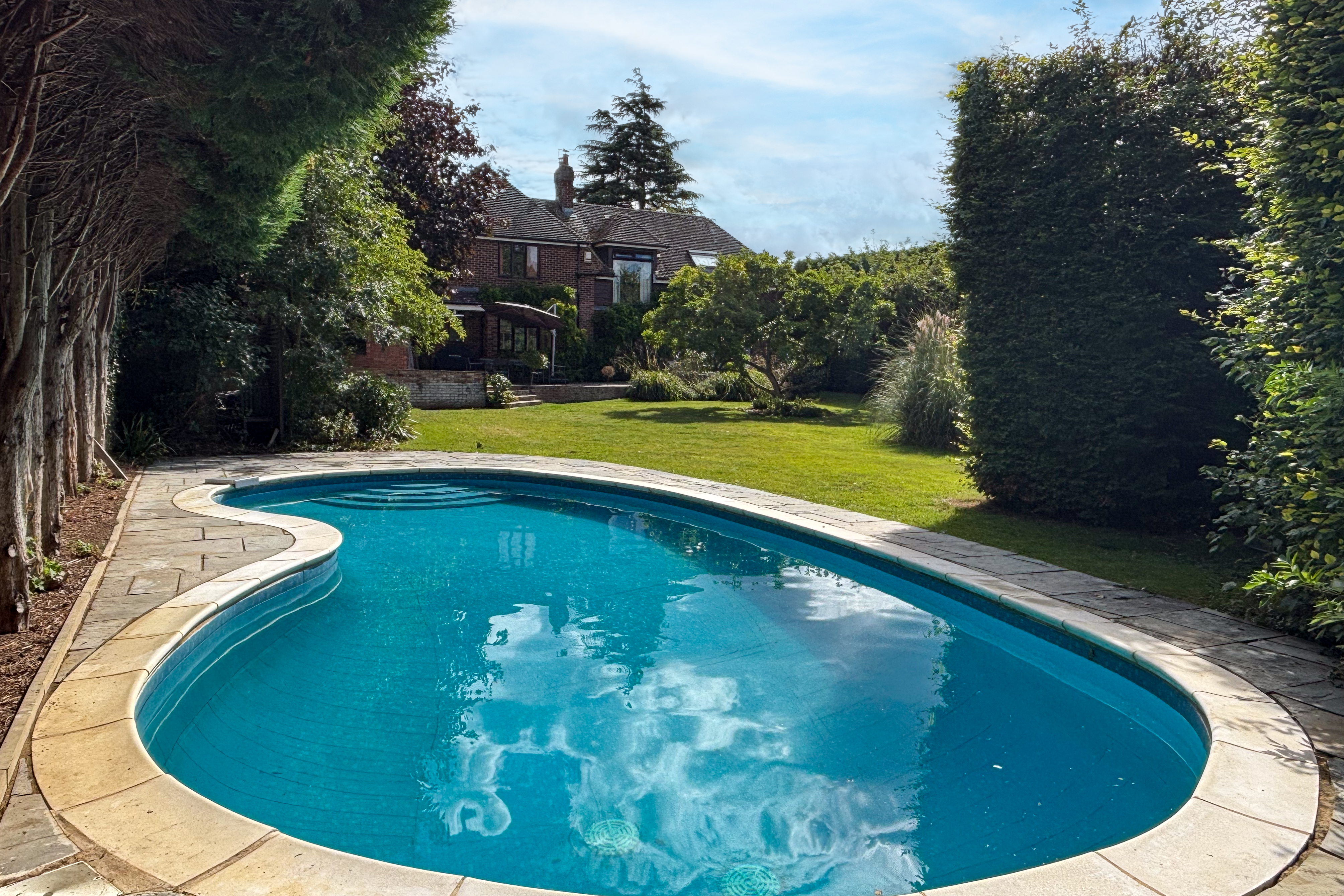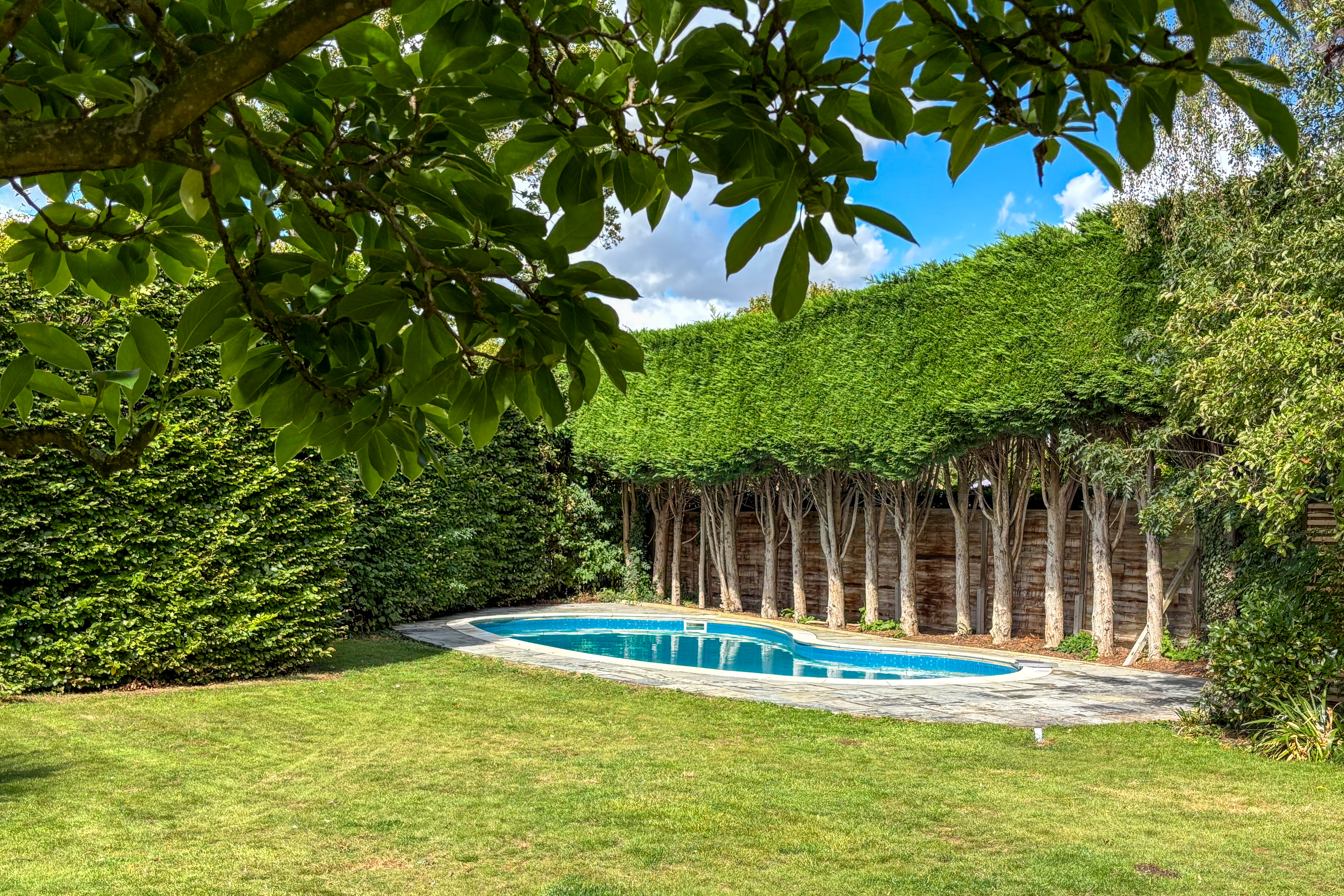 The rear garden is a particular highlight, enjoying a high degree of privacy and offering a safe, enclosed environment for family recreation. A raised patio terrace provides an excellent space for outdoor dining and entertaining, overlooking the main lawned garden. The swimming pool has been refurbished by the current owners and enhanced with a Fast Lane swimming system, allowing resistance swimming for both leisure and fitness and adding a strong lifestyle element to the outside space.