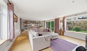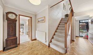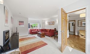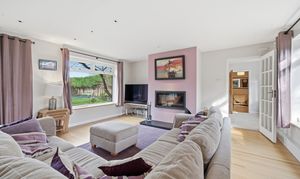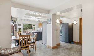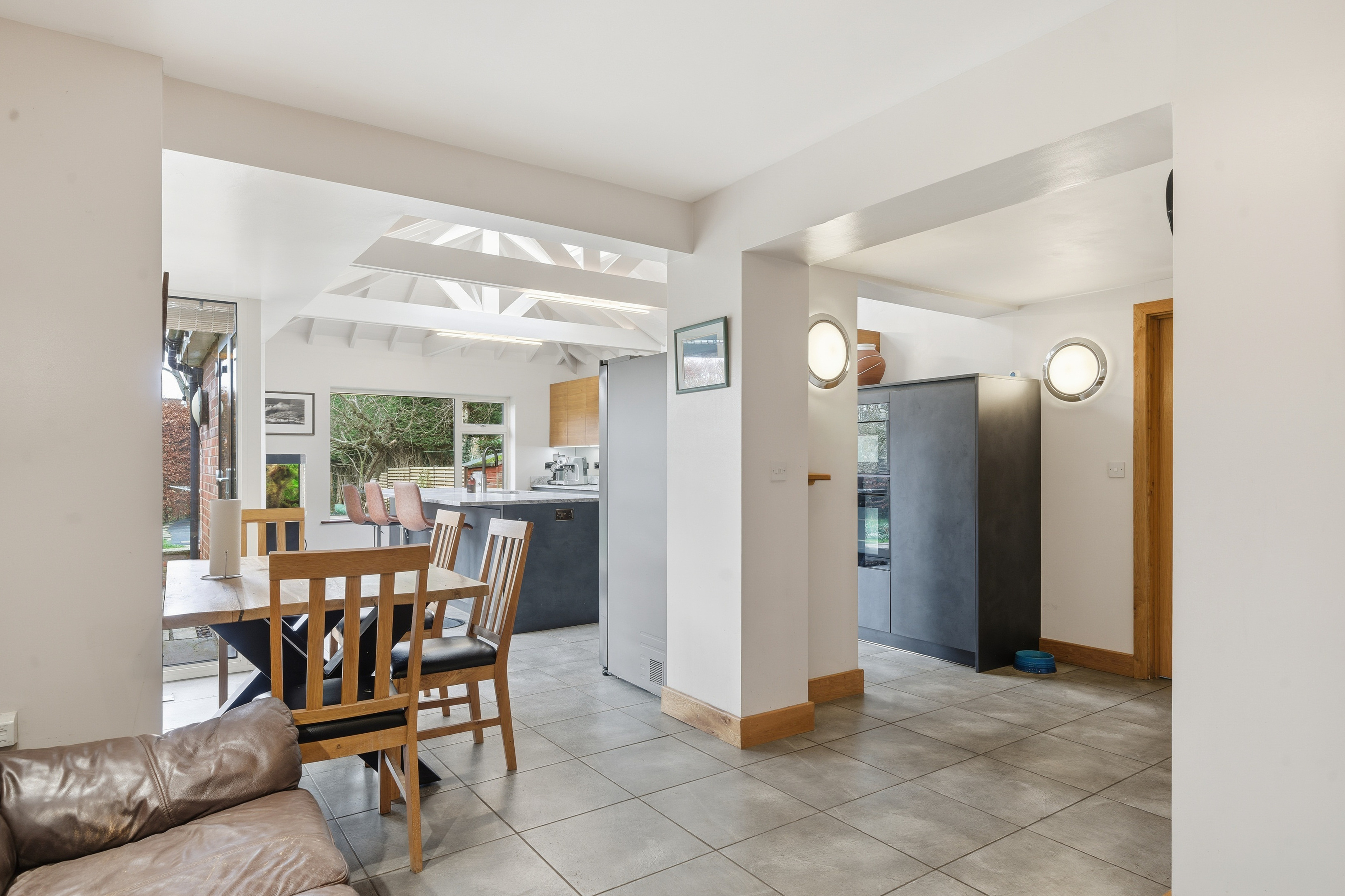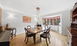 A welcoming entrance hall immediately conveys the impressive scale of the house and links the main reception spaces. The ground floor is thoughtfully arranged to balance formal entertaining with relaxed day‑to‑day living. To the front, a well‑proportioned dining room with walk‑in double‑glazed bay window comfortably accommodates a large table and additional furniture, creating an ideal setting for family meals and social gatherings. Adjacent, a bright dual‑aspect sitting room enjoys a walk‑in box bay window overlooking the rear garden, with a log‑burning stove forming a focal point and adding warmth and character. A further spacious living room provides excellent flexibility as a family room or informal entertaining space; wood flooring, a second inset log‑burning stove and sliding doors to a raised terrace create an easy connection with the garden that promote effortless indoor‑outdoor living.