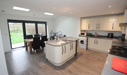 UPVC window to rear. Bifold door to side. Karndean flooring. Under floor heating. Fully fitted Sigma Three kitchen comprising eye level units base units with drawers and solid Corian work surfaces over with one and a half bowl moulded sink with mixer tap. Neff hob. Slide and hide ovens. Neff microwave. Down lighting. Dish washer. Space for dining room table and chairs. Door to rear porch.