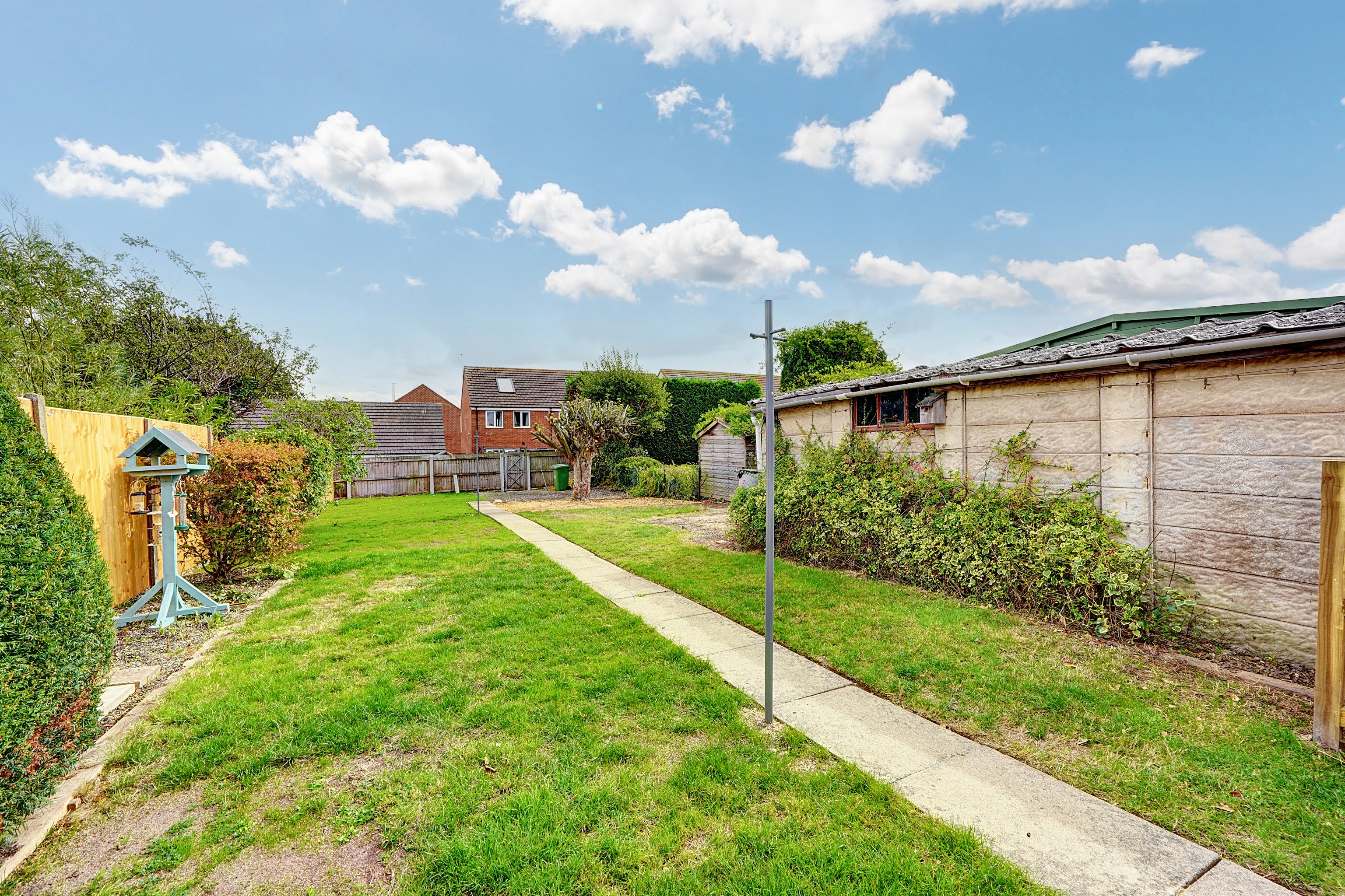 Outside, the front of the property offers a well-kept lawn with neat borders and a pathway leading to the front door, complemented by a private driveway and single garage, providing ample storage and parking. To the rear, a generous enclosed garden includes a patio, lawned areas, established shrubs and hedges, and a mature apple tree.