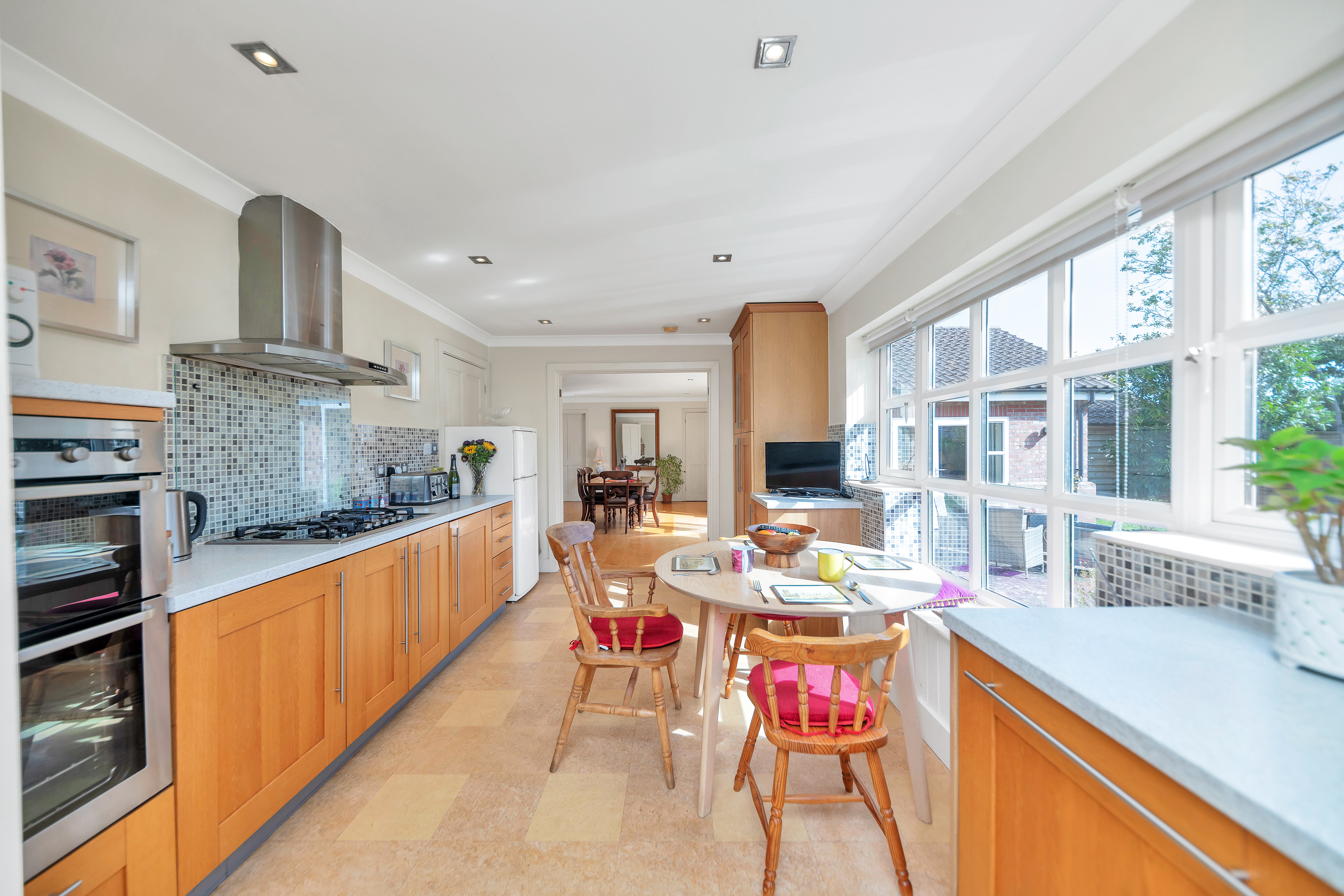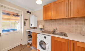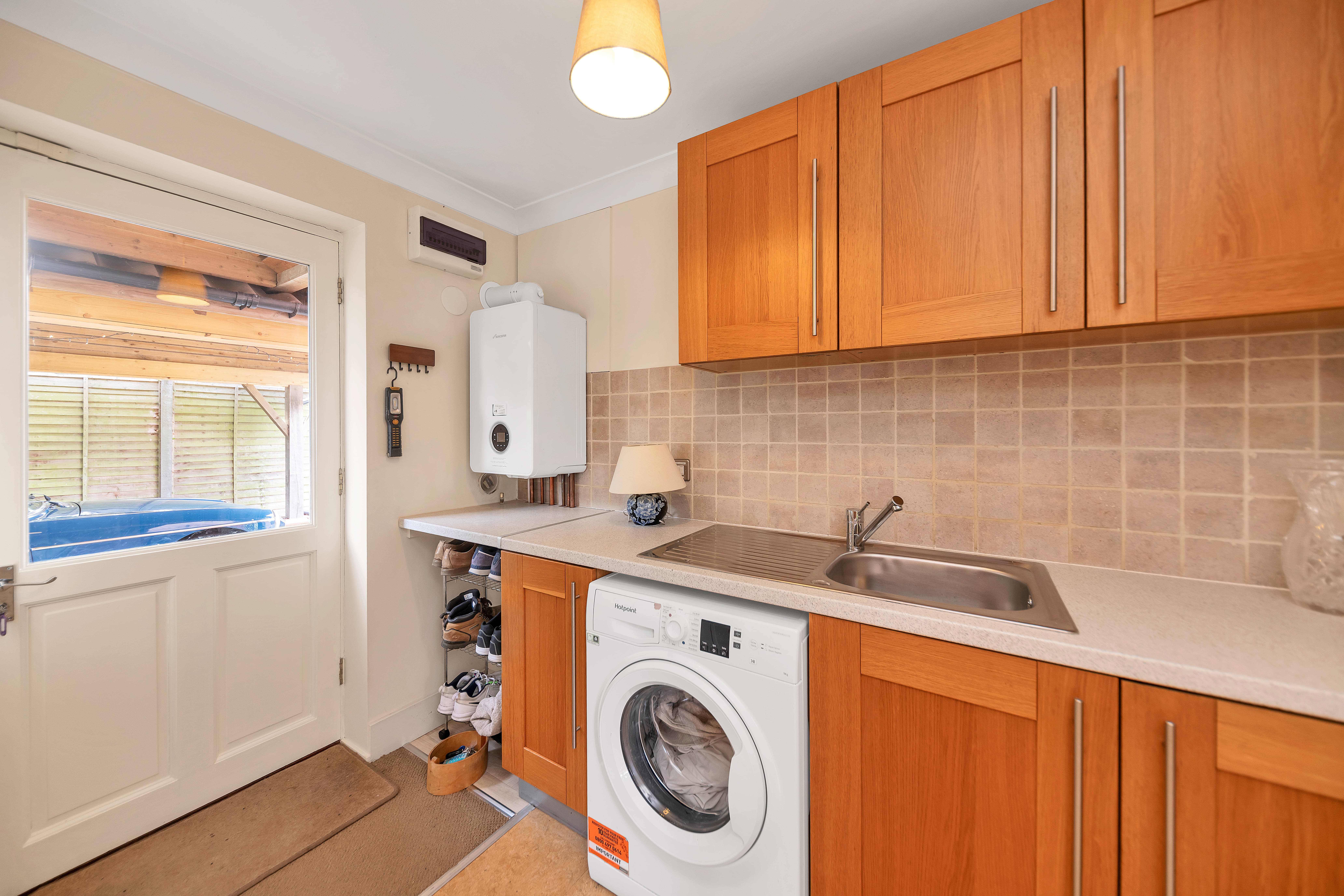 The kitchen/breakfast room is incredibly bright and inviting, enjoying large windows to a glorious garden aspect, a range of base and wall units, laminate worktops, tiled flooring and splashbacks, inset lighting, an integrated double oven, gas hob and dishwasher, and space for a fridge/freezer, breakfast setting and other small kitchen appliances. The utility room provides further storage, space for large laundry appliances, access to a WC and a side door to the car-port.