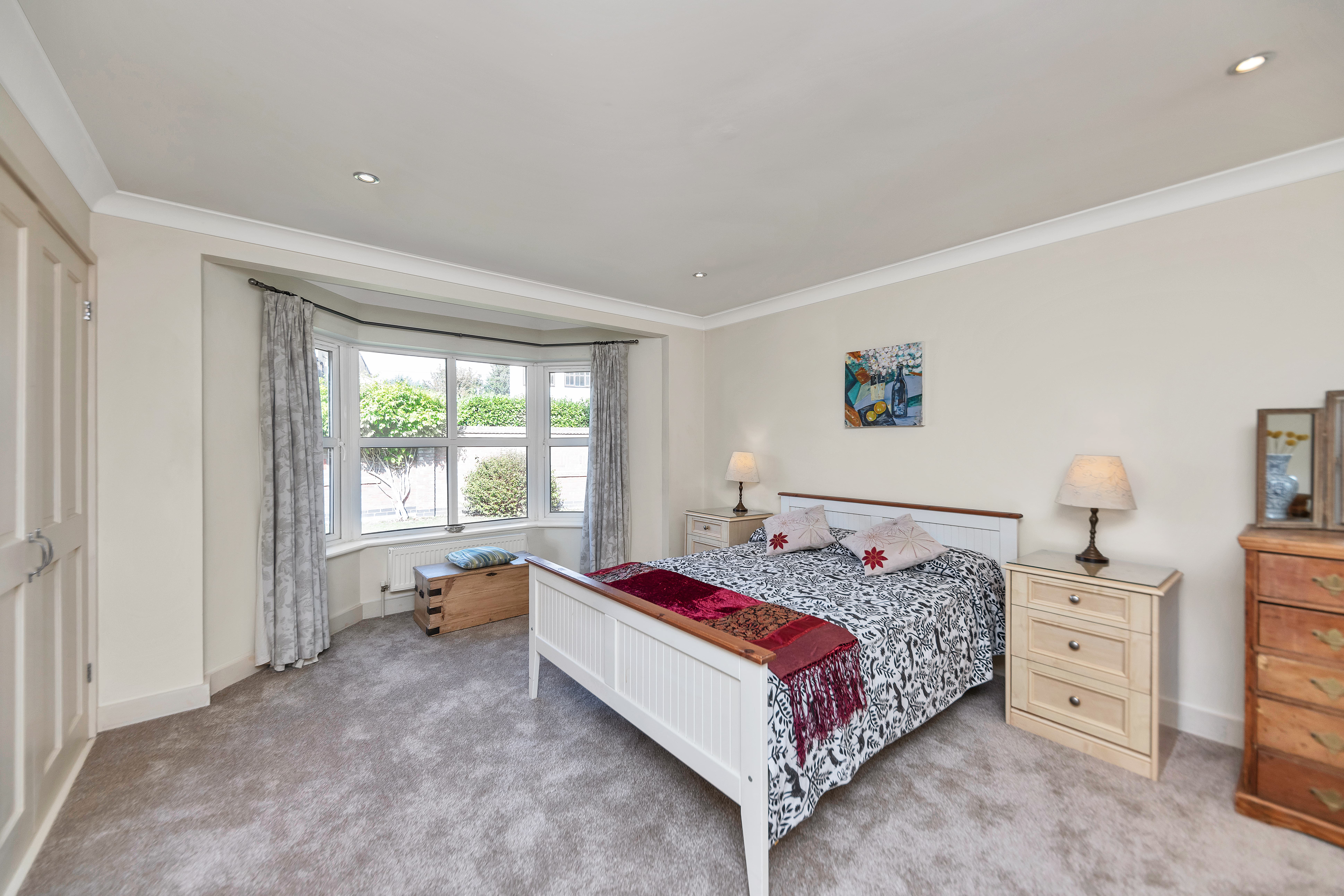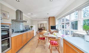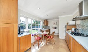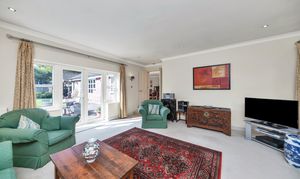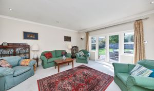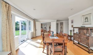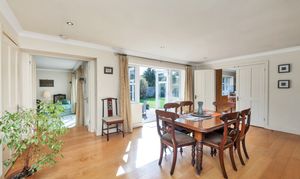 Adjacent, the dining room shares an open-plan flow with the kitchen and features engineered wood flooring, inset lighting, windows and French doors to the garden with space for a large dining table and side furniture. The lounge is a superb dual-aspect reception with French doors, an attractive decorative fireplace, plush carpets and ample room for seating. Thanks to its open-plan layout and extensive glazing the home is flooded with natural light and offers three generous reception zones ideal for modern family living.