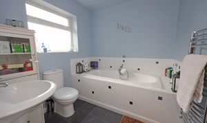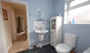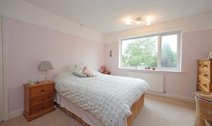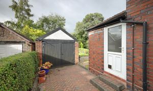 To the first floor the central landing gives access to three bedrooms, two of which are generous doubles with a useful third single. The family bathroom is fitted with white suite comprising bath, WC and wash basin. Outside a brick paved driveway provides off-road parking and leads down the side of the house to the detached brick built single Garage. Note: the driveway narrows to 2.05m at the narrowest point. To the rear is a large raised seating area adjacent to the house with steps down to an extensive lawn with mature well stocked shrub borders.