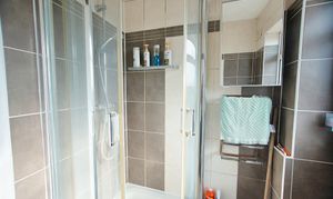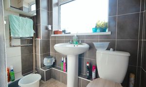 With vinyl flooring, shower cubicle, towel radiator, wash hand pedestal basin, WC and double glazed window.