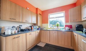 With vinyl flooring, laminate work surfaces, double oven, radiator, hob, extractor hood, sink/drainer and double glazed window.