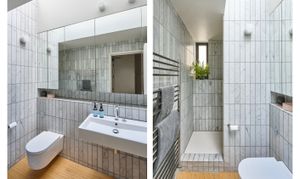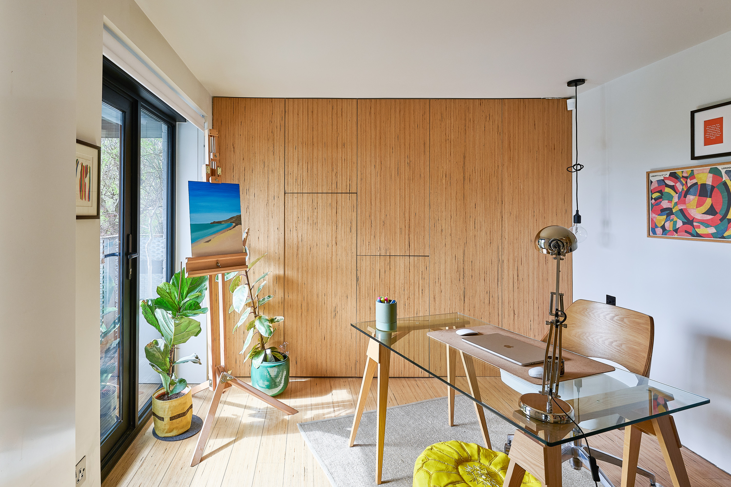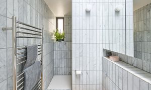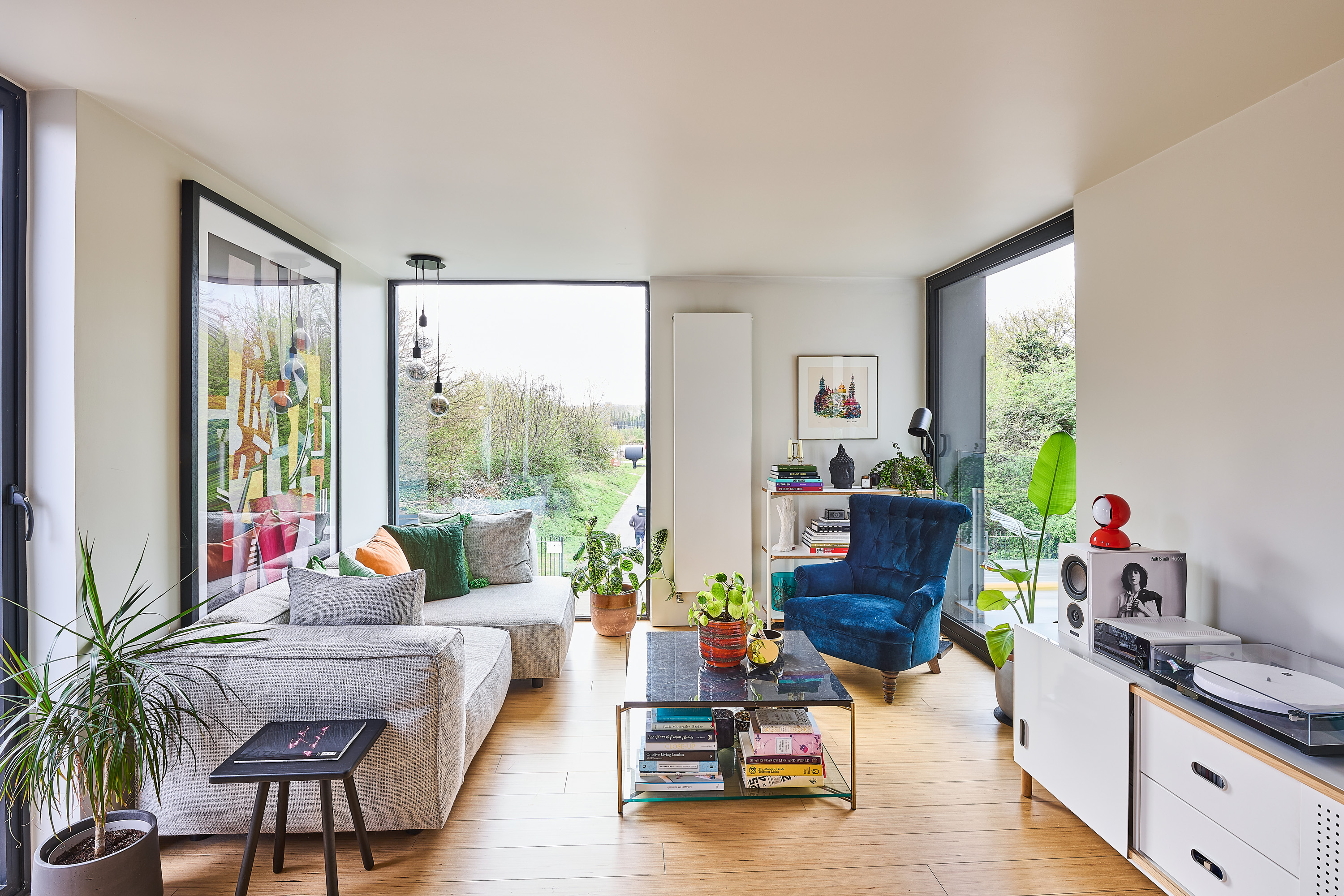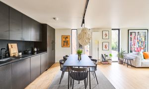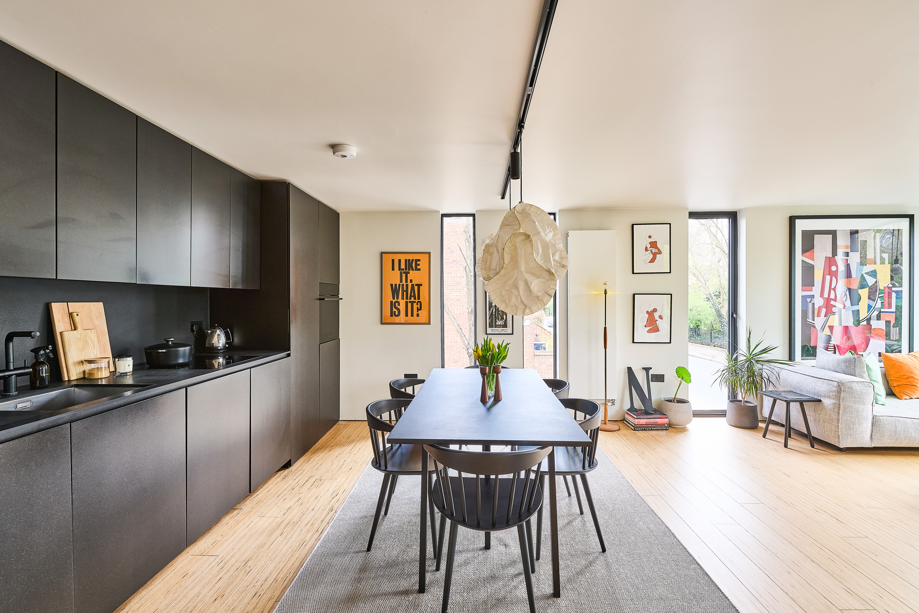 Throughout, the design is executed to a high specification, featuring solid beech high-performance flooring and Carrara marble bathrooms. The kitchen is finished with black Valchromat panels and a sustainable paper-based composite worktop known as Richlite, complemented by Samsung appliances. Heating is managed through a Nest smart thermostat that adapts to usage patterns.